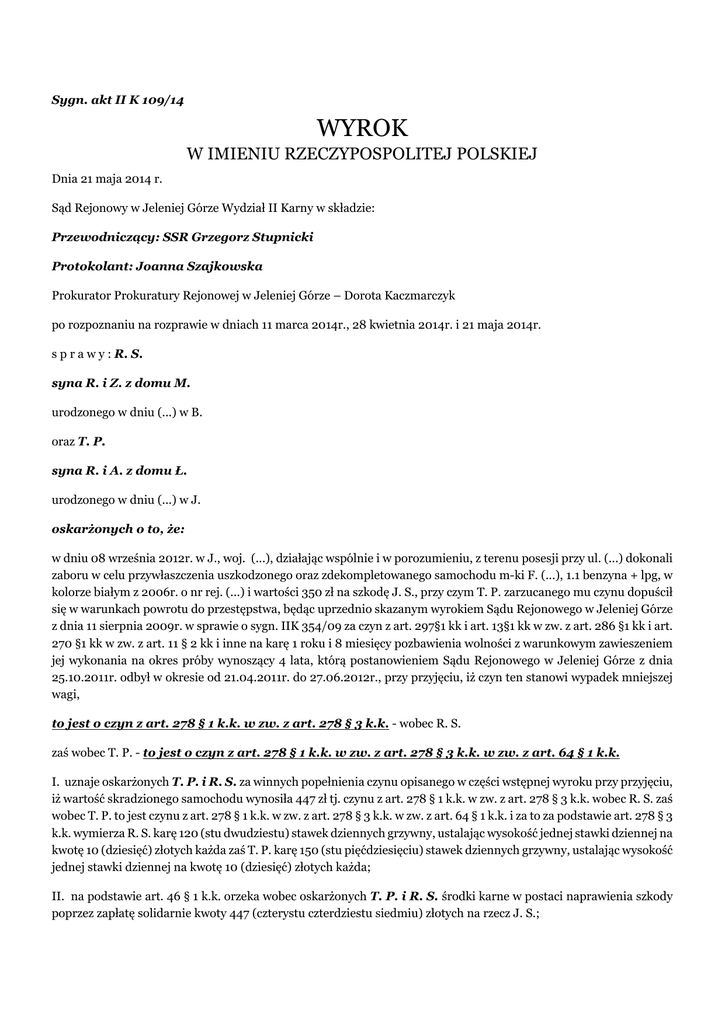 Sygn. akt II K 109/14 WYROK W IMIENIU RZECZYPOSPOLITEJ POLSKIEJ Dnia 21 maja 2014 r. Sąd Rejonowy w Jeleniej Górze Wydział II Karny w składzie: Przewodniczący: SSR Grzegorz Stupnicki Protokolant: Joanna Szajkowska Prokurator Prokuratury Rejonowej w Jeleniej Górze – Dorota Kaczmarczyk po rozpoznaniu na rozprawie w dniach 11 marca 2014r., 28 kwietnia 2014r. i 21 maja 2014r. s p r a w y : R. S. syna R. i Z. z domu M. urodzonego w dniu (...) w B. oraz T. P. syna R. i A. z domu Ł. urodzonego w dniu (...) w J. oskarżonych o to, że: w dniu 08 września 2012r. w J., woj. (...), działając wspólnie i w porozumieniu, z terenu posesji przy ul. (...) dokonali zaboru w celu przywłaszczenia uszkodzonego oraz zdekompletowanego samochodu m-ki F. (...), 1.1 benzyna + lpg, w kolorze białym z 2006r. o nr rej. (...) i wartości 350 zł na szkodę J. S., przy czym T. P. zarzucanego mu czynu dopuścił się w warunkach powrotu do przestępstwa, będąc uprzednio skazanym wyrokiem Sądu Rejonowego w Jeleniej Górze z dnia 11 sierpnia 2009r. w sprawie o sygn. IIK 354/09 za czyn z art. 297§1 kk i art. 13§1 kk w zw. z art. 286 §1 kk i art. 270 §1 kk w zw. z art. 11 § 2 kk i inne na karę 1 roku i 8 miesięcy pozbawienia wolności z warunkowym zawieszeniem jej wykonania na okres próby wynoszący 4 lata, którą postanowieniem Sądu Rejonowego w Jeleniej Górze z dnia 25.10.2011r. odbył w okresie od 21.04.2011r. do 27.06.2012r., przy przyjęciu, iż czyn ten stanowi wypadek mniejszej wagi, to jest o czyn z art. 278 § 1 k.k. w zw. z art. 278 § 3 k.k. - wobec R. S. zaś wobec T. P. - to jest o czyn z art. 278 § 1 k.k. w zw. z art. 278 § 3 k.k. w zw. z art. 64 § 1 k.k. I. uznaje oskarżonych T. P. i R. S. za winnych popełnienia czynu opisanego w części wstępnej wyroku przy przyjęciu, iż wartość skradzionego samochodu wynosiła 447 zł tj. czynu z art. 278 § 1 k.k. w zw. z art. 278 § 3 k.k. wobec R. S. zaś wobec T. P. to jest czynu z art. 278 § 1 k.k. w zw. z art. 278 § 3 k.k. w zw. z art. 64 § 1 k.k. i za to za podstawie art. 278 § 3 k.k. wymierza R. S. karę 120 (stu dwudziestu) stawek dziennych grzywny, ustalając wysokość jednej stawki dziennej na kwotę 10 (dziesięć) złotych każda zaś T. P. karę 150 (stu pięćdziesięciu) stawek dziennych grzywny, ustalając wysokość jednej stawki dziennej na kwotę 10 (dziesięć) złotych każda; II. na podstawie art. 46 § 1 k.k. orzeka wobec oskarżonych T. P. i R. S. środki karne w postaci naprawienia szkody poprzez zapłatę solidarnie kwoty 447 (czterystu czterdziestu siedmiu) złotych na rzecz J. S.; III. na podstawie art. 624 § 1 k.p.k. zwalnia w całości oskarżonych T. P. i R. S. od kosztów sądowych obciążając nimi Skarb Państwa, w tym na podstawie art. 17 ust. 1 ustawy z dnia 23 czerwca 1973r. o opłatach w sprawach karnych nie wymierza im opłaty. Sygnatura akt II K 109/14 UZASADNIENIE Sąd ustalił następujący stan faktyczny: T. P.mieszka w J.przy ul. (...). Jego kolegą jest R. S.zameldowany w B.przy ul. (...). J. S.mieszka w J.przy ul. (...). W okresie od października 2011r. do 20 listopada 2012r. J. S.był osadzony w zakładzie karnym. T. P.przez pewien okres czasu był osadzony w tym samym zakładzie karnym co J. S.. W dniu 8 września 2012r. T. P.i R. S.zapytali się G. K., czy nie kupiłby od nich na części samochodu F. (...). G. K.prowadzi warsztat samochodowy w J.i często kupuje rozbite bądź stare samochody na tzw. części. Wstępnie mężczyźni ustalili kwotę transakcji na 500 złotych. Następnie G. K.przyjechał swoim samochodem tzw. lawetą na umówione miejsce tj. ul. (...). Tam na poboczu stał zdekompletowany i powypadkowy samochód marki F. (...), 1.1 benzyna ze zdekompletowaną instalacją LPG, w kolorze białym z 2006r. o nr rej. (...), który stanowił własność J. S.. Wartość tego samochodu wynosiła 447 złotych. T. P.i R. S.zapewnili G. K., że R. S.jest właścicielem tego pojazdu. Ten zgodził się nabyć ów samochód, jednak biorąc pod uwagę stan techniczny pojazdu, za kwotę nie większą niż 350 złotych, na co ci przystali. W wyniku tej transakcji T. P.i R. S.zabrali samochód należący do J. S.i sprzedali go G. K.. ( dowód: wyjaśnienia oskarżonego T. P. k.65-66,89-90,132; wyjaśnienia oskarżonego R. S. k.68-69,89,133; częściowo świadka J. S. k. 3-7,16-17,24,90,133-134; zeznania świadka G. K. k. 12,14-15,34-35,38-39,90-91,134-135; zeznania świadka G. S. k. 11,91; umowy kupna k. 141-143; protokół ujęcia k.3) T. P. był uprzednio wielokrotnie karany sądownie w tym za przestępstwa przeciwko mieniu. Wyrokiem Sądu Rejonowego w Jeleniej Górze z dnia 11 sierpnia 2009r. w sprawie o sygn. IIK 354/09 T. P. został skazany za czyny z art. 297§ 1 k.k. i art. 13 § 1 k.k. w zw. z art. 286 § 1 k.k. i art. 270 §1 kk w zw. z art. 11 § 2 k.k. w zw. z art. 91 § 1 k.k. na karę roku i 8 miesięcy pozbawienia wolności z warunkowym zawieszeniem jej wykonania na okres próby wynoszący 4 lata. Następnie postanowieniem Sądu Rejonowego w Jeleniej Górze z dnia 25.10.2011r. zarządzono wykonanie tej kary. T. P. karę tą odbył w okresie od 21.04.2011r. do 27.06.2012r. ( dowód: dane o karalności oskarżonego T. P. k. 45-47; odpisy orzeczeń k. 55-58) R. S. był uprzednio wielokrotnie karany sądownie w tym za przestępstwa przeciwko mieniu. ( dowód: dane o karalności oskarżonego R. S. k. 48-50; odpisy orzeczeń k. 59-60) Zarówno R. S. jak i T. P. przyznali się do popełnienia zarzucanego im czynu. Opisali, że sprzedali samochód należący do J. S. G. K. za kwotę 350 złotych. Przyznali, że nie dysponowali dokumentami dotyczącymi pojazdu. Zapewnili, iż samochód ten był nie tylko uszkodzony ale także był zdekompletowany oraz zaśmiecony toteż uznali, że został on porzucony. Sąd zważył co następuje: Sąd jako wiarygodne ocenił wyjaśnienia obu oskarżonych w zakresie w jakim przyznali, że sprzedali G. K. samochód marki F. (...), któreg