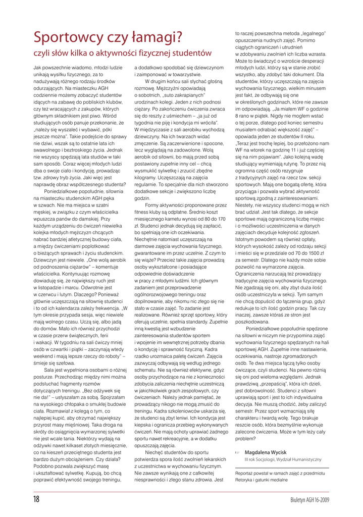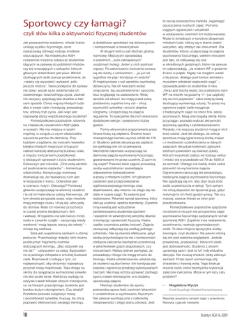 Sportowcy czy łamagi? czyli słów kilka o aktywności fizycznej studentów Jak powszechnie wiadomo, młodzi ludzie unikają wysiłku fizycznego, za to nadużywają różnego rodzaju środków odurzających. Na miasteczku AGH codziennie możemy zobaczyć studentów idących na zabawę do pobliskich klubów, czy też wracających z zakupów, których głównym składnikiem jest piwo. Wśród studiujących osób panuje przekonanie, że „należy się wyszaleć i wybawić, póki jeszcze można”. Takie podejście do sprawy nie dziwi, wszak są to ostatnie lata ich swawolnego i beztroskiego życia. Jednak nie wszyscy spędzają lata studiów w taki sam sposób. Coraz więcej młodych ludzi dba o swoje ciało i kondycję, prowadząc tzw. zdrowy tryb życia. Jaki więc jest naprawdę obraz współczesnego studenta? Poniedziałkowe popołudnie, siłownia na miasteczku studenckim AGH pęka w szwach. Nie ma miejsca w szatni męskiej, w związku z czym właścicielka wpuszcza panów do damskiej. Przy każdym urządzeniu do ćwiczeń niewielka kolejka młodych mężczyzn chcących nabrać bardziej atletycznej budowy ciała, a między ćwiczeniami poplotkować o bieżących sprawach i życiu studenckim. Dziewczyn jest niewiele. „One wolą aerobik od podnoszenia ciężarów” – komentuje właścicielka. Kontynuując rozmowę dowiaduję się, że największy ruch jest w listopadzie i marcu. Odwrotnie jest w czerwcu i lutym. Dlaczego? Ponieważ głównie uczęszczają na siłownię studenci i to od ich kalendarza zależy frekwencja. „W tym okresie przypada sesja, więc niewiele mają wolnego czasu. Uczą się, albo jadą do domów. Mało ich również przychodzi w czasie przerw świątecznych, ferii i wakacji. W tygodniu na sali ćwiczy mniej osób w czwartki i piątki – zaczynają wtedy weekend i mają lepsze rzeczy do roboty” – śmieje się szefowa. Sala jest wypełniona osobami o różnej posturze. Przechodząc między nimi można podsłuchać fragmenty rozmów dotyczących treningu. „Bez odżywek się nie da!” – usłyszałam za sobą. Spojrzałam na wysokiego chłopaka o smukłej budowie ciała. Rozmawiał z kolegą o tym, co najlepiej kupić, aby otrzymać największy przyrost masy mięśniowej. Taka droga na skróty do osiągnięcia wymarzonej sylwetki nie jest wcale tania. Niektórzy wydają na odżywki nawet kilkaset złotych miesięcznie, co na kieszeń przeciętnego studenta jest bardzo dużym obciążeniem. Czy działa? Podobno pozwala zwiększyć masę i ukształtować sylwetkę. Kupują, bo chcą poprawić efektywność swojego treningu, 18 a dodatkowo spodobać się dziewczynom i zaimponować w towarzystwie. W drugim końcu sali słychać głośną rozmowę. Mężczyźni opowiadają o sobotnich, „suto zakrapianych” urodzinach kolegi. Jeden z nich podnosi ciężary. Po zakończeniu ćwiczenia zwraca się do reszty z uśmiechem – „ja już od tygodnia nie piję i kondycja mi wróciła”. W międzyczasie z sali aerobiku wychodzą dziewczyny. Na ich twarzach widać zmęczenie. Są zaczerwienione i spocone, lecz wyglądają na zadowolone. Wolą aerobik od siłowni, bo mają przed sobą postawiony zupełnie inny cel – chcą wysmuklić sylwetkę i zrzucić zbędne kilogramy. Uczęszczają na zajęcia regularnie. To specjalnie dla nich stworzono dodatkowe sekcje i zwiększono liczbę godzin. Formy aktywności proponowane przez fitness kluby są odpłatne. Średnio koszt miesięcznego karnetu wynosi od 80 do 170 zł. Studenci jednak decydują się zapłacić, bo spełniają one ich oczekiwania. Niechętnie natomiast uczęszczają na darmowe zajęcia wychowania fizycznego, gwarantowane im przez uczelnie. Z czym to się wiąże? Przecież takie zajęcia prowadzą osoby wykształcone i posiadające odpowiednie doświadczenie w pracy z młodymi ludźmi. Ich głównym zadaniem jest przeprowadzenie ogólnorozwojowego treningu oraz dopilnowanie, aby nikomu nic złego się nie stało w czasie zajęć. To zadanie jest realizowane. Również sprzęt sportowy, który oferują uczelnie, spełnia standardy. Zupełnie inną kwestią jest wzbudzenie zainteresowania studentów sportem i wpojenie im wewnętrznej potrzeby dbania o kondycję i sprawność fizyczną. Kadra rzadko urozmaica paletę ćwiczeń. Zajęcia zazwyczaj odbywają się według jednego schematu. Nie są również efektywne, gdyż osoby przychodzące na nie z konieczności zdobycia zaliczenia niechętnie uczestniczą w jakichkolwiek grach zespołowych, czy ćwiczeniach. Należy jednak pamiętać, że prowadzący nikogo nie mogą zmusić do treningu. Kadra szkoleniowców uskarża się, że studenci są zbyt leniwi. Ich kondycja jest kiepska i ogranicza przebieg wykonywanych ćwiczeń. Nie mają ochoty uprawiać żadnego sportu nawet rekreacyjnie, a w dodatku opuszczają zajęcia. Niechęć studentów do sportu potwierdza spora ilość zwolnień lekarskich z uczestnictwa w wychowaniu fizycznym. Nie zawsze wynikają one z całkowitej niesprawności i złego stanu zdrowia. Jest to raczej powszechna metoda „legalnego” opuszczenia nudnych zajęć. Pomimo ciągłych ograniczeń i utrudnień w zdobywaniu zwolnień ich liczba wzrasta. Może to świadczyć o wzroście desperacji młodych ludzi, którzy są w stanie zrobić wszystko, aby zdobyć taki dokument. Dla studentów, którzy uczęszczają na zajęcia wychowania fizycznego, wielkim minusem jest fakt, że odbywają się one w określonych godzinach, które nie zawsze im odpowiadają. „Ja miałem WF o godzinie 8 rano w piątek. Nigdy nie mogłem wstać o tej porze, dlatego pod koniec semestru musiałem odrabiać większość zajęć” – opowiada jeden ze studentów II roku. „Teraz jest trochę lepiej, bo przełożono nam WF na wtorek na godzinę 11 i już częściej się na nim pojawiam”. Jako kolejną wadę studiujący wymieniają rutynę. To przez nią ogromna część osób rezygnuje z tradycyjnych zajęć na rzecz tzw. sekcji sportowych. Mają one bogat