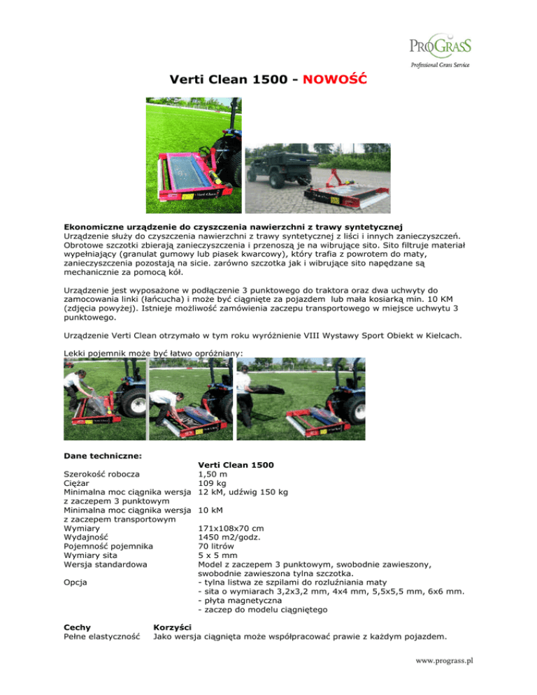 Verti Clean 1500 - NOWOŚĆ Ekonomiczne urządzenie do czyszczenia nawierzchni z trawy syntetycznej Urządzenie służy do czyszczenia nawierzchni z trawy syntetycznej z liści i innych zanieczyszczeń. Obrotowe szczotki zbierają zanieczyszczenia i przenoszą je na wibrujące sito. Sito filtruje materiał wypełniający (granulat gumowy lub piasek kwarcowy), który trafia z powrotem do maty, zanieczyszczenia pozostają na sicie. zarówno szczotka jak i wibrujące sito napędzane są mechanicznie za pomocą kół. Urządzenie jest wyposażone w podłączenie 3 punktowego do traktora oraz dwa uchwyty do zamocowania linki (łańcucha) i może być ciągnięte za pojazdem lub mała kosiarką min. 10 KM (zdjęcia powyżej). Istnieje możliwość zamówienia zaczepu transportowego w miejsce uchwytu 3 punktowego. Urządzenie Verti Clean otrzymało w tym roku wyróżnienie VIII Wystawy Sport Obiekt w Kielcach. Lekki pojemnik może być łatwo opróżniany: Dane techniczne: Szerokość robocza Ciężar Minimalna moc ciągnika wersja z zaczepem 3 punktowym Minimalna moc ciągnika wersja z zaczepem transportowym Wymiary Wydajność Pojemność pojemnika Wymiary sita Wersja standardowa Opcja Cechy Pełne elastyczność Verti Clean 1500 1,50 m 109 kg 12 kM, udźwig 150 kg 10 kM 171x108x70 cm 1450 m2/godz. 70 litrów 5 x 5 mm Model z zaczepem 3 punktowym, swobodnie zawieszony, swobodnie zawieszona tylna szczotka. - tylna listwa ze szpilami do rozluźniania maty - sita o wymiarach 3,2x3,2 mm, 4x4 mm, 5,5x5,5 mm, 6x6 mm. - płyta magnetyczna - zaczep do modelu ciągniętego Korzyści Jako wersja ciągnięta może współpracować prawie z każdym pojazdem. www.prograss.pl