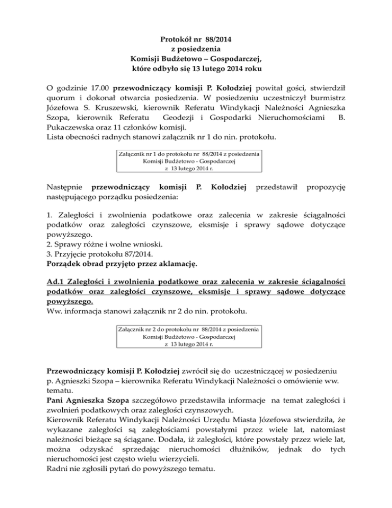 Protokół nr 88/2014 z posiedzenia Komisji Budżetowo – Gospodarczej, które odbyło się 13 lutego 2014 roku O godzinie 17.00 przewodniczący komisji P. Kołodziej powitał gości, stwierdził quorum i dokonał otwarcia posiedzenia. W posiedzeniu uczestniczył burmistrz Józefowa S. Kruszewski, kierownik Referatu Windykacji Należności Agnieszka Szopa, kierownik Referatu Geodezji i Gospodarki Nieruchomościami B. Pukaczewska oraz 11 członków komisji. Lista obecności radnych stanowi załącznik nr 1 do nin. protokołu. Załącznik nr 1 do protokołu nr 88/2014 z posiedzenia Komisji Budżetowo - Gospodarczej z 13 lutego 2014 r. Następnie przewodniczący komisji następującego porządku posiedzenia: P. Kołodziej przedstawił propozycję 1. Zaległości i zwolnienia podatkowe oraz zalecenia w zakresie ściągalności podatków oraz zaległości czynszowe, eksmisje i sprawy sądowe dotyczące powyższego. 2. Sprawy różne i wolne wnioski. 3. Przyjęcie protokołu 87/2014. Porządek obrad przyjęto przez aklamację. Ad.1 Zaległości i zwolnienia podatkowe oraz zalecenia w zakresie ściągalności podatków oraz zaległości czynszowe, eksmisje i sprawy sądowe dotyczące powyższego. Ww. informacja stanowi załącznik nr 2 do nin. protokołu. Załącznik nr 2 do protokołu nr 88/2014 z posiedzenia Komisji Budżetowo - Gospodarczej z 13 lutego 2014 r. Przewodniczący komisji P. Kołodziej zwrócił się do uczestniczącej w posiedzeniu p. Agnieszki Szopa – kierownika Referatu Windykacji Należności o omówienie ww. tematu. Pani Agnieszka Szopa szczegółowo przedstawiła informacje na temat zaległości i zwolnień podatkowych oraz zaległości czynszowych. Kierownik Referatu Windykacji Należności Urzędu Miasta Józefowa stwierdziła, że wykazane zaległości są zaległościami powstałymi przez wiele lat, natomiast należności bieżące są ściągane. Dodała, iż zaległości, które powstały przez wiele lat, można odzyskać sprzedając nieruchomości dłużników, jednak do tych nieruchomości jest często wielu wierzycieli. Radni nie zgłosili pytań do powyższego tematu. Następnie zabrała głos Pani Bożena Pukaczewska - kierownik Referatu Geodezji i Gospodarki Nieruchomościami i przedstawiła sprawozdanie z czynności podjętych w sprawie zadłużenia najemców w mieszkaniowym zasobie Gminy Miasta Józefowa. Ww. sprawozdanie stanowi załącznik nr 3 do nin. protokołu. Załącznik nr 3 do protokołu nr 88/2014 z posiedzenia Komisji Budżetowo - Gospodarczej z 13 lutego 2014 r. Kierownik Referatu GiGN nadmieniła, że sprawy założone w 2010 r. mają swój skutek w późniejszych latach. Dodała, że aby gmina mogła podjąć czynności sądowe musi minąć 6 miesięcy od momentu niepłacenia czynszu. Pani Pukaczewska poinformowała też o możliwości rozkładania długu z tytułu czynszu, na raty maksymalnie do trzech lat. Jest możliwość podpisania porozumienia o rozłożeniu na raty długu albo jego umorzenia, ale tylko w kwocie do 7 tys. zł. W sprawie zaległości czynszowych zabrała też głos radna U. Zielińska, która poinformowała, że w 2012 roku było 30 spraw dotyczących eksmisji z lokalu. Wykonano cztery. Jednak nikt z tych czterech osób nie zgłosił się do hotelu, który zapewniła gmina. Następnie zabrał głos radca prawny Urzędu Miasta Józefowa p. Potrzuska przedstawiając informacje na temat procedury postępowania ze sprawami dotyczącymi niepłacenia czynszu. Pani mecenas nadmieniła też o pomyśle odpracowania przez dłużników zaległości czynszowych, wyrażając opinię, że należałoby to uwzględnić w programie mieszkaniowym gminy. W nawiązaniu do ww. sprawy, kierownik Referatu GiGN, wyjaśniła, że taki program już był i niestety nie sprawdził się. Następnie przewodniczący komisji P. Kołodziej poinformował członków komisji o przedłożonej informacji na temat systemu gospodarowania odpadami komunalnymi za okres od 1 lipca 2013 r. do 31 grudnia 2013 r. Ww. informacja stanowi załącznik br. 4 do nin. protokołu. Załącznik nr 4 do protokołu nr 88/2014 z posiedzenia Komisji Budżetowo - Gospodarczej z 13 lutego 2014 r. Zaległość w opłatach z tytułu opłat za odbiór odpadów komunalnych według stanu na 31.12.2013 r. wyniosła 84 tys. zł. Burmistrz S. Kruszewski nadmienił, że windykacja tych należności spoczywa na gminie. Rozważane jest, czy gminie opłaca się zatrudniać windykatora na pełny etat. Ad.2 Sprawy różne i wolne wnioski. W ww. punkcie porządku obrad przewodniczący komisji P. Kołodziej oddal głos uczestniczącym w posiedzeniu rodzicom dzieci trenującym piłkę nożną w MLKS ,,Józefovia”, korzystającym z miejskich terenów sportowych. Na wstępie przedstawiciel rodziców odczytał list otwarty rodziców dzieci trenujących w MLKS ,,Józefovia” , który, jak deklarowali autorzy listu, w najbliższym czasie wpłynie do Burmistrza i Rady Miasta Józefowa. Ww. liście rodzice wyrazili swe zaniepokojenie następującymi sprawami: • złą kondycją finansową stowarzyszenia MLKS ,,Józefovia”, • niepewnością otrzymywania dotacji na realizację zadań na 2014 rok, mimo złożenia odpowiedniej dokumentacji; • terminem ogłoszenia konkursu przez miasto na organizację zajęć sportowych, co skutkuje zaburzeniem płynności finansowej stowarzyszenia i brakiem możliwości podejmowania kluczowych decyzji przez stowarzyszenie; • uchwaleniem uchwały 378/VI/2014; • przekazaniem terenów sportowo-rekreacyjnych położonych między ulicami: Dolną i Żabią w administrowanie ICSiR w Józefowie; • utratą od 1 lutego br. formalnej możliwości użytkowania przez klub obiektów sportowych między ul. Dolną i ul. Żabią, utratą przez klub siedziby; • brakiem od 01.02.2014 r. obowiązującej umowy między klubem a miastem; • chaosem organizacyjnym; • brakiem możliwości utrzymania ciągłości treningów przez dzieci trenujące w Klubie. Rodzice w swym liście s