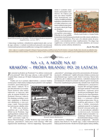 P. Mazur Rynek Główny podczas obchodów 750-lecia lokacji Krakowa na prawie magdeburskim, czerwiec 2007 r. i statycznego myślenia o dziedzictwie pojmowanym jako sacrum do jego ochrony w realiach żywiołowych procesów prywatyzacji i komercjalizacji przestrzeni publicznej wymaga dziś zasadniczych zmian w systemie zarządzania potencjałem dziedzictwa. Im większy jest przy tym sukces transformacji ekonomicznej, tym większy konflikt pomiędzy kapitałem a dziedzictwem, co widać zwłaszcza w centrach wielkich miast historycznych, takich jak Praga czy Kraków. Przykład Krakowa jest szczególnie pouczający. Okładka książki Kraków w Europie Środka Pokazuje on, że po upadku komunizmu transformację przechodzi nie tylko miasto zabytkowe, ale i pojęcie dziedzictwa. Przy tym o ile zabytek należy do przeszłości, o tyle dziedzictwo służy współczesności. Nie ulega więc wątpliwości, że łatwiej mówić o ochronie zabytków, niż tworzyć skuteczny system ochrony dziedzictwa. Jacek Purchla Tekst i zdjęcia (z wyjątkiem fotografii Collegium Maius) pochodzą z publikacji Jacka Purchli Kraków w Europie Środka, która ukazała się nakładem Międzynarodowego Centrum Kultury i Wydawnictwa BOSZ. Polskie Towarzystwo Wydawców Książek nadało jej tytuł Najpiękniejszej Książki Roku 2008. NA +3, A MOŻE NA 4? KRAKÓW – PRÓBA BILANSU PO 20 LATACH J ak zmieniał się Kraków po Przełomie? Czy dobrze wykorzystał „antystołowi”, protestujący przeciwko porozumieniu elit komuniswój potencjał? Jakie były jego sukcesy, a jakie porażki? Jak stycznych i „Solidarności”, żądali rozliczenia włodarzy systemu oraz wypada bilans miasta po 20 latach funkcjonowania III Rzeczpo- natychmiastowego wyjścia wojsk Armii Czerwonej. Starcia były spolitej? gwałtowne, jak w żadnym innym mieście, z udziałem od pięciu lat Trudno jest na te pytania odpowiedzieć, a jeszcze trudniej niewidzianych w Krakowie armatek wodnych i gazów łzawiących. oceniać prace władz miasta, kolejnych prezydentów i ich współpra- Przeciwko manifestacjom protestowały umiarkowane środowiska cowników, przewodniczących solidarnościowe, przed proworady miasta i radnych. Na to kacjami SB ostrzegali kapłani, jest zdecydowanie za wcześnie. ostrzegał kardynał Franciszek Zatem poniższy tekst należy Macharski, wspierany przez traktować, co najwyżej, jako dwóch nowych biskupów: Kaziszkic do portretu Krakowa po mierza Nycza i Jana Szkodonia. Przełomie. Pierwszy i roboczy. Kościół krakowski w Okrągłym Nie obejmuje on kultury wysoStole i w wyborach widział kiej i popkultury w Krakowie nadzieję na lepsze jutro. Nie zaoraz szkolnictwa, w tym wyżwiódł się, gdyż jeszcze w 1989 szego, i nauki. Temu powinien roku w wojsku, więzieniach, być poświęcony odrębny tekst. szpitalach pojawili się kapłani. W 1988 roku Kraków, Kościół otrzymał pełne prapodobnie jak i cała Polska, wo do prowadzenia zakładów zbliżał się do Przełomu. Jego wychowawczych, tworzenia ogólnopolskimi znakami były: parafii, budowy kościołów i reOkrągły Stół, wybory z czerwca windykacji własności. Pozycję Rysunek Janusza Bartkowicza 1989 i powstanie rządu TaKościoła krakowskiego wzmacdeusza Mazowieckiego. „Urodą” Krakowa tego czasu była silna niała duchowa i kilkakrotna – podczas pielgrzymek – obecność opozycja „antystołowa”, która przez wiele miesięcy 1989 roku papieża Jana Pawła II. Na skutek tego, a także wielowiekowych organizowała manifestacje i barwne happeningi. Opozycjoniści tradycji prestiż Kościoła w Krakowie był jak nigdzie indziej stabilny, ALMA MATER 17 a autorytet hierarchów z kardynałem Franciszkiem Macharskim na wrażenie w mieście, w Polsce i za granicą wywołał demontaż poczele – gwarantowany. Siłą Kościoła były też wpływowe duszpa- mnika Lenina – Wielkiego Brata, symbolu podległości politycznej sterstwa akademickie, między innymi dominikańska Beczka, a także Polski i Krakowa. 22 listopada 1989 roku podczas happeningu no„Tygodnik Powszechny”, środowisko „Znaku”, seminaria duchow- wohucki pomnik Lenina został podpalony, a następnie, 10 grudnia ne oraz dwie uczelnie katolickie: Papieska Akademia Teologiczna 1989 roku, zdemontowany. „Żegnaj Włodziu” – skandowali na i dynamicznie rozwijające się Ignatianum. pożegnanie demonstranci. Znakiem symbolicznym było też odrzuWybory 4 czerwca 1989 roku w Krakowie, podobnie jak cenie dotychczasowego patrona Huty im. Lenina i zastąpienie go w całym kraju, wygrała „drużyna Wałęsy”, jednak na zmianę władzy nowym: inżynierem Tadeuszem Sendzimirem, wynalazcą z zakresu w mieście krakowianie musieli czekać jeszcze przez ponad rok. Co technologii hutniczych z USA. Oficjalnie jego imię nosi staraprawda jesienią tego roku Krakowski Komitet Obywatelski „Soli- -nowa huta od 4 maja 1990 roku. Podobnie symboliczne znaczenie darności” wysunął na prezydenta miało przywrócenie w 1990 roku Krakowa kandydaturę Ryszarda starej nazwy miasta: stołeczne Gryglewskiego, światowej sławy i królewskie miasto Kraków, profesora medycyny, jednak „staz czego warszawianie do dzisiaj ra” rada miasta nie potrafiła się zdesobie dworują. W magazynach cydować na jego wybór. Zmiany muzeum miejskiego spoczędokonały się dopiero w następstwie ły portrety przewodniczących uchwalenia przez Sejm ustawy Rady Narodowej i prezydentów o samorządzie terytorialnym. z lat 1945–1989, a w 1992 roku 20 czerwca 1990 roku nowa rada odebrano przyznane wcześniej miasta, wybrana w pierwszych degodności honorowego obywatela mokratycznych wyborach, dokonaKrakowa ministrowi Michałowi ła wyboru na stanowisko prezydenRoli-Żymierskiemu. ta prof. Jacka Woźniakowskiego, Zmiany następowały też a pierwszym przewodniczącym w sferze własności i produkcji. rady został Kazimierz Barczyk. Już w 1988 roku dzięki nowePrezydent Woźniakowski uzyskał mu prawu szybko przyby