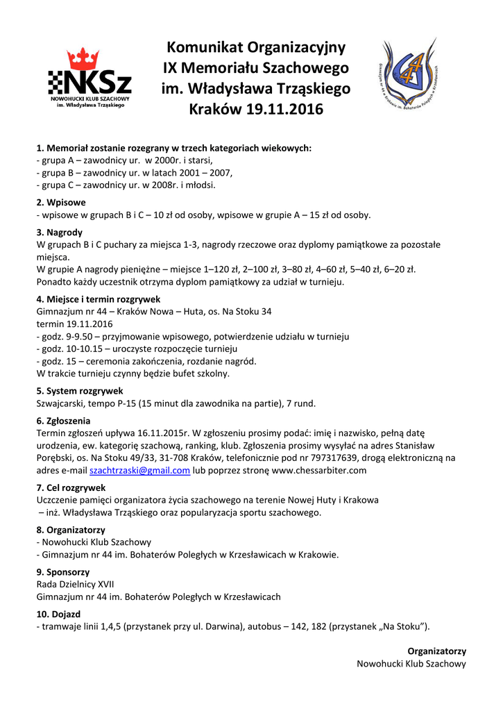 Komunikat Organizacyjny IX Memoriału Szachowego im. Władysława Trząskiego Kraków 19.11.2016 1. Memoriał zostanie rozegrany w trzech kategoriach wiekowych: - grupa A – zawodnicy ur. w 2000r. i starsi, - grupa B – zawodnicy ur. w latach 2001 – 2007, - grupa C – zawodnicy ur. w 2008r. i młodsi. 2. Wpisowe - wpisowe w grupach B i C – 10 zł od osoby, wpisowe w grupie A – 15 zł od osoby. 3. Nagrody W grupach B i C puchary za miejsca 1-3, nagrody rzeczowe oraz dyplomy pamiątkowe za pozostałe miejsca. W grupie A nagrody pieniężne – miejsce 1–120 zł, 2–100 zł, 3–80 zł, 4–60 zł, 5–40 zł, 6–20 zł. Ponadto każdy uczestnik otrzyma dyplom pamiątkowy za udział w turnieju. 4. Miejsce i termin rozgrywek Gimnazjum nr 44 – Kraków Nowa – Huta, os. Na Stoku 34 termin 19.11.2016 - godz. 9-9.50 – przyjmowanie wpisowego, potwierdzenie udziału w turnieju - godz. 10-10.15 – uroczyste rozpoczęcie turnieju - godz. 15 – ceremonia zakończenia, rozdanie nagród. W trakcie turnieju czynny będzie bufet szkolny. 5. System rozgrywek Szwajcarski, tempo P-15 (15 minut dla zawodnika na partie), 7 rund. 6. Zgłoszenia Termin zgłoszeń upływa 16.11.2015r. W zgłoszeniu prosimy podać: imię i nazwisko, pełną datę urodzenia, ew. kategorię szachową, ranking, klub. Zgłoszenia prosimy wysyłać na adres Stanisław Porębski, os. Na Stoku 49/33, 31-708 Kraków, telefonicznie pod nr 797317639, drogą elektroniczną na adres e-mail [email protected] lub poprzez stronę www.chessarbiter.com 7. Cel rozgrywek Uczczenie pamięci organizatora życia szachowego na terenie Nowej Huty i Krakowa – inż. Władysława Trząskiego oraz popularyzacja sportu szachowego. 8. Organizatorzy - Nowohucki Klub Szachowy - Gimnazjum nr 44 im. Bohaterów Poległych w Krzesławicach w Krakowie. 9. Sponsorzy Rada Dzielnicy XVII Gimnazjum nr 44 im. Bohaterów Poległych w Krzesławicach 10. Dojazd - tramwaje linii 1,4,5 (przystanek przy ul. Darwina), autobus – 142, 182 (przystanek „Na Stoku”). Organizatorzy Nowohucki Klub Szachowy