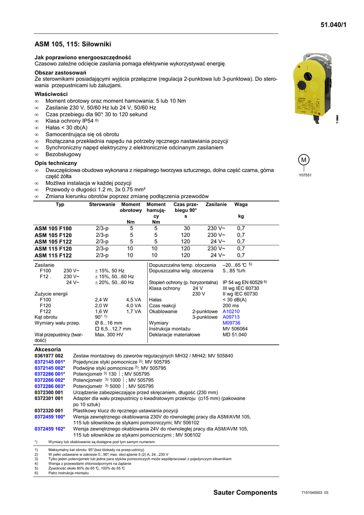 51.040/1 ASM 105, 115: Siłowniki Jak poprawiono energooszczędność Czasowo zaleŜne odcięcie zasilania pomaga efektywnie wykorzystywać energię. Obszar zastosowań Ze sterownikami posiadającymi wyjścia przełączne (regulacja 2-punktowa lub 3-punktowa). Do sterowania przepustnicami lub Ŝaluzjami. Właściwości • Moment obrotowy oraz moment hamowania: 5 lub 10 Nm • Zasilanie 230 V, 50/60 Hz lub 24 V, 50/60 Hz • Czas przebiegu dla 90°: 30 to 120 sekund • Klasa ochrony IP54 6) • Hałas < 30 db(A) • Samocentrująca się oś obrotu • Rozłączana przekładnia napędu na potrzeby ręcznego nastawiania pozycji • Synchroniczny napęd elektryczny z elektronicznie odcinanym zasilaniem • Bezobsługowy Opis techniczny • Dwuczęściowa obudowa wykonana z niepalnego tworzywa sztucznego, dolna część czarna, górna część Ŝółta • MoŜliwa instalacja w kaŜdej pozycji • Przewody o długości 1.2 m, 3x 0.75 mm² • Zmiana kierunku obrotów poprzez zmianę podłączenia przewodów Typ Sterowanie 2/3-p 2/3-p 2/3-p 2/3-p 2/3-p ASM 105 F100 ASM 105 F120 ASM 105 F122 ASM 115 F120 ASM 115 F122 Zasilanie F100 F12 . 230 V~ 230 V~ 24 V~ ZuŜycie energii F100 F120 F122 Kąt obrotu Wymiary wału przep. Wał przepustnicy (twardość) Moment Moment obrotowy hamujący Nm Nm 5 5 5 10 10 ± 15%, 50 Hz ± 15%, 50...60 Hz ± 20%, 50...60 Hz 2,4 W 4,5 VA 2,0 W 4,0 VA 1,6 W 1,7 VA 90° 1) Ø 8...16 mm 6,5...12,7 mm Max. 300 HV 5 5 5 10 10 Czas przebiegu 90° s Zasilanie 30 120 120 120 120 230 V~ 230 V~ 24 V~ 230 V~ 24 V~ M Y07551 Waga kg 0,7 0,7 0,7 0,7 0,7 5) Dopuszczalna temp. otoczenia Dopuszczalna wilg. otoczenia –20...65 °C 5...85 %rh Stopień ochrony (p. horyzontalna) Klasa ochrony 24 V 230 V Hałas Czas reakcji Okablowanie 2-punktowe 3-punktowe Wymiary Instrukcja montaŜu Deklaracje materiałowe IP 54 wg EN 60529 6) III wg IEC 60730 II wg IEC 60730 < 30 dB(A) 200 ms A10210 A09713 M09736 MV 506064 MD 51.040 Akcesoria 0361977 002 0372145 001* 0372145 002* 0372286 001* 0372286 002* 0372286 003* 0372300 001 0372301 001 0372320 001 0372459 100* 0372459 102* Zestaw montaŜowy do zaworów regulacyjnych MH32 / MH42; MV 505840 Pojedyncze styki pomocnicze 2); MV 505795 Podwójne styki pomocnicze 2); MV 505795 Potencjometr 3) 130 Ω; MV 505795 Potencjometr 3) 1000 Ω; MV 505795 Potencjometr 3) 5000 Ω; MV 505795 Urządzenie zabezpieczające przed skręcaniem, długość (230 mm) Adapter dla wału przepustnicy o kwadratowym przekroju (15 mm) (pakowane po 10 sztuk) Plastikowy klucz do ręcznego ustawiania pozycji Wersja zewnętrznego okablowania 230V do równoległej pracy dla ASM/AVM 105, 115 lub siłowników ze stykami pomocniczymi; MV 506102 Wersja zewnętrznego okablowania 24V do równoległej pracy dla ASM/AVM 105, 115 lub siłowników ze stykami pomocniczymi ; MV 506102 *) Wymiary lub okablowanie są dostępne pod tym samym numerem 1) 2) 3) 4) 5) 6) Maksymalny kat obrotu: 95° (bez blokady na przep ustnicy) W pełni ustawiane w zakresie 0...90°; max. obci ąŜenie 5 (2) A, 24...230 V Tylko jeden potencjometr lub jedna para styków pomocniczych moŜe współpracować z pojedynczym siłownikiem Wersja z przewodami chloroodpornymi na Ŝądanie śywotność około 80% do 65 °C, 100% do 55 °C Patrz instrukcja montaŜu Sauter Components 7151040003 03 51.040/2 ASM 105, 115 Funkcje Podłączenie napięcia powoduje przesunięcie urządzenia wykonawczego w dowolne połoŜenie. W 3-punktowym trybie pracy, wrzeciono obraca się zgodnie z ruchem wskazówek zegara jeŜeli napięcie podłączone jest do brązowego przewodu, przeciwnie do ruchu wskazówek zegara jeŜeli napięcie jest podłączone do czarnego przewodu (widoczne jest to na schemacie okablowania na obudowie siłownika). W 2-punktowym trybie pracy, wrzeciono obraca się zgodnie z ruchem wskazówek zegara jeŜeli napięcie jest podłączone do brązowego przewodu, przeciwnie do ruchu wskazówek zegara jeŜeli napięcie nie jest podłączone do brązowego przewodu. Czarny przewód musi zawsze być podłączony do obwodu zasilającego (widoczne jest to na schemacie okablowania na obudowie siłownika). W przypadku osiągnięcia połoŜenia krańcowego (połoŜenie krańcowe wynika z przesunięcia przepustnicy do oporu lub po osiągnięciu maksymalnego kąta obrotu) lub w wypadku przeciąŜenia, włącza się sprzęgło magnetyczne. Sygnał sterujący zostaje odcięty elektronicznie po trzech minutach (60 sekundach dla F100). Efektywna pozycja końcowa jest ustawiana na blokadzie przepustnicy, na ograniczniku obrotów lub, za poprzez osiągniecie maksymalnego kąta obrotu 95°. Ręczna nastawa odbywa się poprzez wysprzęglenie silnika (przesuwając przycisk na obudowie oraz ustawiając nastawnik wrzeciona w określonej pozycji). W 3-punktowym trybie pracy, zmianę kierunków obrotu uzyskuje się poprzez zamianę podłączenia przewodów zasilających. Wskazówki projektowe i montaŜowe Koncepcja silnika elektrycznego gwarantuje równoległą pracę kilku siłowników elektrycznych napędzających przepustnice. Siłownik moŜe być montowany w dowolnym połoŜeniu (włącznie z pionowym w dół). Montowany jest bezpośrednio na oś klapy i przez zatrzaśnięcie zabezpieczony przed przekręceniem. Samocentrująca przystawka gwarantuje łagodne uruchomienie osi przepustnicy. Siłownik przepustnicy moŜna łatwo zdjąć z jej osi bez demontaŜu zabezpieczenia przed przekręceniem. Kąt obrotu moŜe być ograniczony pomiędzy 0 a 90°, i nastawiany płynnie pomi ędzy 5° a 80°. Ogranicznik jest montowany za pomocą śruby regulacyjnej bezpośrednio na siłowniku i ustawiany na samocentrującej się przystawce za pomocą blokady. Przystawka moŜe współpracować z osiami klap o przekrojach Ø 8...16 mm, 6,5...12,7 mm. Siłownik moŜe być wyposaŜony w styki pomocnicze lub w potencjometr. Pomocniczy styk przełączny montowany jest na obudowie w miejscu wskaźnika obrotu osi siłownika. Przed wykonaniem instalacji mechanicznej naleŜy 