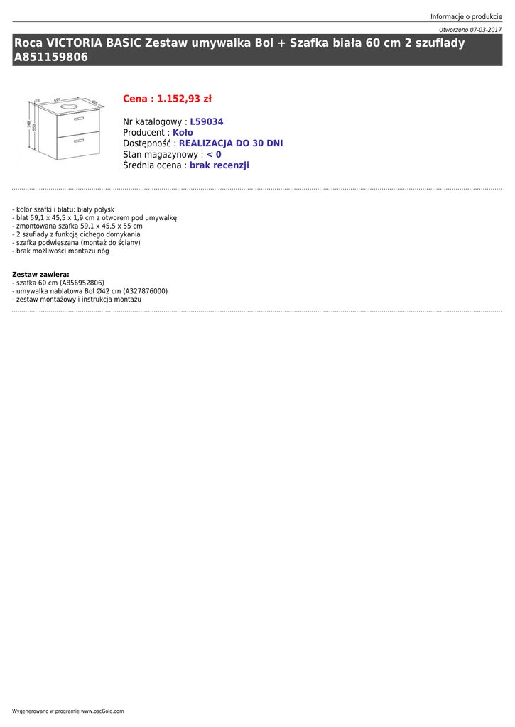 Informacje o produkcie Utworzono 07-03-2017 Roca VICTORIA BASIC Zestaw umywalka Bol + Szafka biała 60 cm 2 szuflady A851159806 Cena : 1.152,93 zł Nr katalogowy : L59034 Producent : Koło Dostępność : REALIZACJA DO 30 DNI Stan magazynowy : < 0 Średnia ocena : brak recenzji - kolor szafki i blatu: biały połysk - blat 59,1 x 45,5 x 1,9 cm z otworem pod umywalkę - zmontowana szafka 59,1 x 45,5 x 55 cm - 2 szuflady z funkcją cichego domykania - szafka podwieszana (montaż do ściany) - brak możliwości montażu nóg Zestaw zawiera: - szafka 60 cm (A856952806) - umywalka nablatowa Bol Ø42 cm (A327876000) - zestaw montażowy i instrukcja montażu Wygenerowano w programie www.oscGold.com