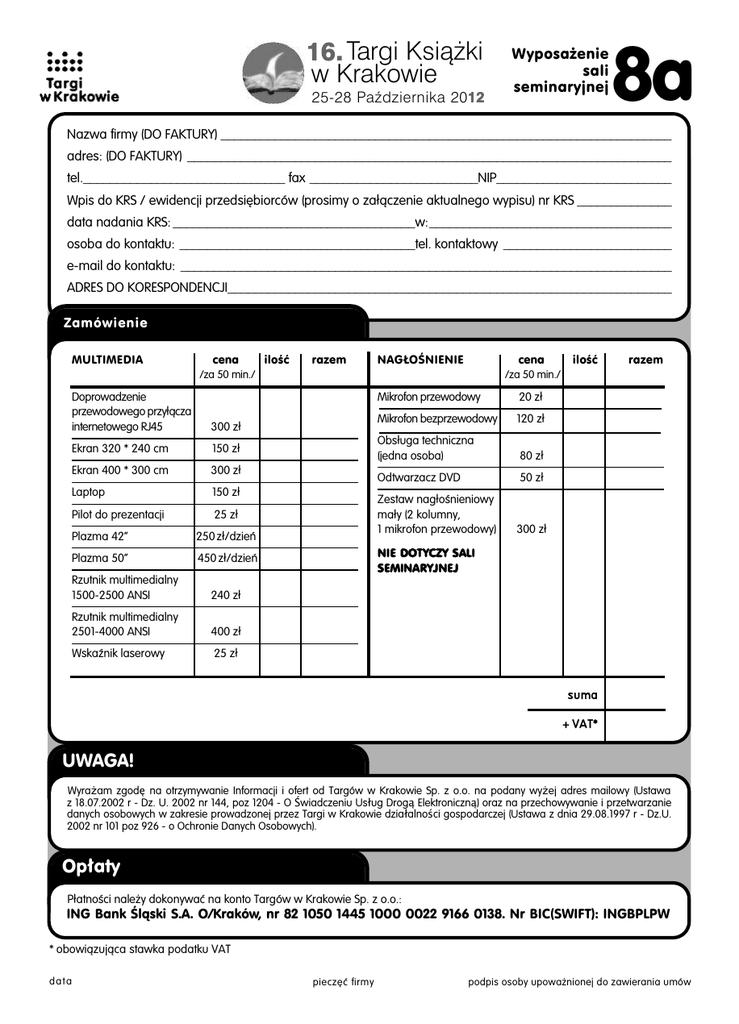 Targi Ksià˝ki w Krakowie 25-28 Paêdziernika 20 Wyposa˝enie sali seminaryjnej 8a Nazwa firmy (DO FAKTURY) ___________________________________________________________________ adres: (DO FAKTURY) ________________________________________________________________________ tel.______________________________ fax _________________________NIP__________________________ Wpis do KRS / ewidencji przedsi´biorców (prosimy o za∏àczenie aktualnego wypisu) nr KRS ______________ data nadania KRS: ____________________________________w:____________________________________ osoba do kontaktu: ___________________________________tel. kontaktowy _________________________ e-mail do kontaktu: _________________________________________________________________________ ADRES DO KORESPONDENCJI__________________________________________________________________ Zamówienie MULTIMEDIA cena iloÊç razem NAGŁOÂNIENIE cena Doprowadzenie przewodowego przy≥πcza internetowego RJ45 300 z≥ Ekran 320 * 240 cm 150 z≥ Ekran 400 * 300 cm 300 z≥ Laptop 150 z≥ Pilot do prezentacji 25 z≥ Plazma 42î Plazma 50î 250 z≥/dzieƒ 240 z≥ Rzutnik multimedialny 2501-4000 ANSI 400 z≥ Wskaênik laserowy 25 z≥ razem Mikrofon przewodowy 20 z≥ Mikrofon bezprzewodowy 120 z≥ Obs≥uga techniczna (jedna osoba) 80 z≥ Odtwarzacz DVD 50 z≥ Zestaw nag∏oÊnieniowy ma∏y (2 kolumny, 1 mikrofon przewodowy) 300 z≥ NIE DOTYCZY SALI SEMINARYJNEJ 450 z≥/dzieƒ Rzutnik multimedialny 1500-2500 ANSI iloÊç /za 50 min./ /za 50 min./ suma + VAT* UWAGA! Wyrażam zgodę na otrzymywanie Informacji i ofert od Targów w Krakowie Sp. z o.o. na podany wyżej adres mailowy (Ustawa z 18.07.2002 r - Dz. U. 2002 nr 144, poz 1204 - O Świadczeniu Usług Drogą Elektroniczną) oraz na przechowywanie i przetwarzanie danych osobowych w zakresie prowadzonej przez Targi w Krakowie działalności gospodarczej (Ustawa z dnia 29.08.1997 r - Dz.U. 2002 nr 101 poz 926 - o Ochronie Danych Osobowych). Op∏aty P∏atnoÊci nale˝y dokonywaç na konto Targów w Krakowie Sp. z o.o.: ING Bank Âlàski S.A. O/Kraków, nr 82 1050 1445 1000 0022 9166 0138. Nr BIC(SWIFT): INGBPLPW * obowiπzujπca stawka podatku VAT data piecz´ç firmy podpis osoby upowa˝nionej do zawierania umów