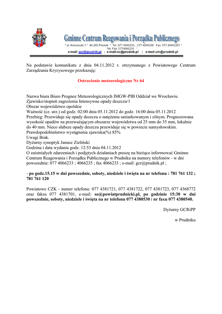 Na podstawie komunikatu z dnia 04.11.2012 r. otrzymanego z Powiatowego Centrum Zarządzania Kryzysowego przekazuję: Ostrzeżenie meteorologiczne Nr 64 Nazwa biura Biuro Prognoz Meteorologicznych IMGW-PIB Oddział we Wrocławiu Zjawisko/stopień zagrożenia Intensywne opady deszczu/1 Obszar województwo opolskie Ważność (cz. urz.) od godz. 02:00 dnia 05.11.2012 do godz. 16:00 dnia 05.11.2012 Przebieg: Przewiduje się opady deszczu o natężeniu umiarkowanym i silnym. Prognozowana wysokość opadów na przeważającym obszarze województwa od 25 mm do 35 mm, lokalnie do 40 mm. Nieco słabsze opady deszczu przewiduje się w powiecie namysłowskim. Prawdopodobieństwo wystąpienia zjawiska(%) 85% Uwagi Brak. Dyżurny synoptyk Janusz Zieliński Godzina i data wydania godz. 12:53 dnia 04.11.2012 O zaistniałych zdarzeniach i podjętych działaniach proszę na bieżąco informować Gminne Centrum Reagowania i Porządku Publicznego w Prudniku na numery telefonów - w dni powszednie: 077 4066233 ; 4066235 ; fax 4066233 ; e-mail: [email protected] ; - po godz.15.15 w dni powszednie, soboty, niedziele i święta na nr telefonu : 781 761 132 ; 781 761 120 Powiatowe CZK - numer telefonu: 077 4381721, 077 4381722, 077 4381723, 077 4368772 oraz faksu 077 4381701, e-mail: [email protected], po godzinie 15:30 w dni powszednie, soboty, niedziele i święta na nr telefonu 077 4380530 i nr faxu 077 4380540. Dyżurny GCRiPP w Prudniku