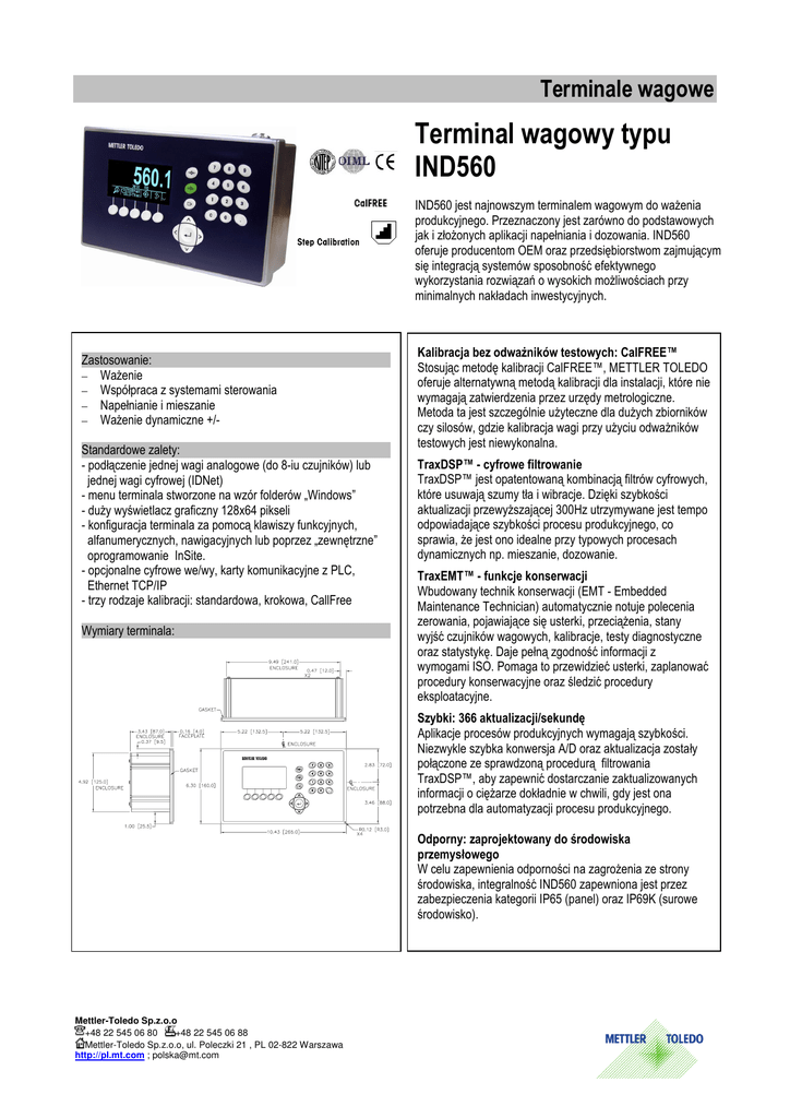 Terminale wagowe Terminal wagowy typu IND560 IND560 jest najnowszym terminalem wagowym do ważenia produkcyjnego. Przeznaczony jest zarówno do podstawowych jak i złożonych aplikacji napełniania i dozowania. IND560 oferuje producentom OEM oraz przedsiębiorstwom zajmującym się integracją systemów sposobność efektywnego wykorzystania rozwiązań o wysokich możliwościach przy minimalnych nakładach inwestycyjnych. Zastosowanie: – Ważenie – Współpraca z systemami sterowania – Napełnianie i mieszanie – Ważenie dynamiczne +/Standardowe zalety: - podłączenie jednej wagi analogowe (do 8-iu czujników) lub jednej wagi cyfrowej (IDNet) - menu terminala stworzone na wzór folderów „Windows” - duży wyświetlacz graficzny 128x64 pikseli - konfiguracja terminala za pomocą klawiszy funkcyjnych, alfanumerycznych, nawigacyjnych lub poprzez „zewnętrzne” oprogramowanie InSite. - opcjonalne cyfrowe we/wy, karty komunikacyjne z PLC, Ethernet TCP/IP - trzy rodzaje kalibracji: standardowa, krokowa, CallFree Wymiary terminala: Kalibracja bez odważników testowych: CalFREE™ Stosując metodę kalibracji CalFREE™, METTLER TOLEDO oferuje alternatywną metodą kalibracji dla instalacji, które nie wymagają zatwierdzenia przez urzędy metrologiczne. Metoda ta jest szczególnie użyteczne dla dużych zbiorników czy silosów, gdzie kalibracja wagi przy użyciu odważników testowych jest niewykonalna. TraxDSP™ - cyfrowe filtrowanie TraxDSP™ jest opatentowaną kombinacją filtrów cyfrowych, które usuwają szumy tła i wibracje. Dzięki szybkości aktualizacji przewyższającej 300Hz utrzymywane jest tempo odpowiadające szybkości procesu produkcyjnego, co sprawia, że jest ono idealne przy typowych procesach dynamicznych np. mieszanie, dozowanie. TraxEMT™ - funkcje konserwacji Wbudowany technik konserwacji (EMT - Embedded Maintenance Technician) automatycznie notuje polecenia zerowania, pojawiające się usterki, przeciążenia, stany wyjść czujników wagowych, kalibracje, testy diagnostyczne oraz statystykę. Daje pełną zgodność informacji z wymogami ISO. Pomaga to przewidzieć usterki, zaplanować procedury konserwacyjne oraz śledzić procedury eksploatacyjne. Szybki: 366 aktualizacji/sekundę Aplikacje procesów produkcyjnych wymagają szybkości. Niezwykle szybka konwersja A/D oraz aktualizacja zostały połączone ze sprawdzoną procedurą filtrowania TraxDSP™, aby zapewnić dostarczanie zaktualizowanych informacji o ciężarze dokładnie w chwili, gdy jest ona potrzebna dla automatyzacji procesu produkcyjnego. Odporny: zaprojektowany do środowiska przemysłowego W celu zapewnienia odporności na zagrożenia ze strony środowiska, integralność IND560 zapewniona jest przez zabezpieczenia kategorii IP65 (panel) oraz IP69K (surowe środowisko). Mettler-Toledo Sp.z.o.o +48 22 545 06 80 +48 22 545 06 88 Mettler-Toledo Sp.z.o.o, ul. Poleczki 21 , PL 02-822 Warszawa http://pl.mt.com ; [email protected] Terminale wagowe Dane techniczne Wymiary (mm) Konstrukcja obudowy Zasilanie Wyświetlacz Klawiatura Wydajność Typy wag Rozdzielczość Połączenia: Opcje interfejsów Kalibracja Warunki zewnętrzne Dopuszczenia Obudowa Wysokość Szerokość Głębokość Masa Panelowa 265 mm 160 mm 91,8 mm 3,5 kg Ścienna/stołowa 265 mm 160 mm 170,3 mm 3,5 kg • Obudowa panelowa: panel przedni ze stali nierdzewnej, typ ochronny IP65 • Obudowa HE: stal nierdzewna, typ ochronny IP69K 87-264 VAC, 49-61Hz ; pobór prądu – 600 mA Próżniowy VDF, 21 mm – maksymalna wysokość wyniku ważenia, 128x64 pikseli 5 definiowalnych klawiszy funkcyjnych, Kasowanie, Tara, Zerowanie, Drukowanie, klawisze nawigacyjne, klawisze numeryczne Maksymalne odświeżanie - Waga analogowa: 366 Hz; porównanie z setpoint’em – 50Hz; interfejs PLC – 20Hz • Waga analogowa: do 8-iu czujników 350Ω, 2 lub 3 mV/V • Waga IDNet: platformy wysokiej rozdzielczości typu K 100,000 działek standard 1 port, COM1: RS-232/RS-422/RS-485; opcje Ethernet TCP/IP z dwoma dodatkowymi interfejsami, COM2: RS-232; COM3: RS-232/RS-422/RS-485 • PLC (jedna opcja/terminal): Allen-Bradley Remote I/O; Profibus L2 DP; Wyjście analogowe: 4-20 mA i 0-10 VDC; zewnętrzny Device Net; • We/Wy dyskretne: wewnętrzne 4 wejścia, 6 wyjść (max 30VDC/250VAC, 1A); dodatkowe zewnętrzne poprzez moduł ARM 100 I/O (4we/6wy) – maksymalnie 2 dodatkowe moduły (całość we/wy – 12 we i 18 wy 1 stopniowa; 5-cio stopniowa; CalFREE (bez odważników kalibracyjnych), tryb programowalny (do 20 kroków) -10 stopni C - +40 stopni C, 10-95% wilgotności powietrza Klasa dokładności -II, III, IIII 100,000d, pamięć Alibi Układy napełniania/mieszania realizowane przez terminal IND560 wyposażony w oprogramowanie FillPac Mettler-Toledo Sp.z.o.o +48 22 545 06 80 +48 22 545 06 88 Mettler-Toledo Sp.z.o.o, ul. Poleczki 21 , PL 02-822 Warszawa http://pl.mt.com ; [email protected]