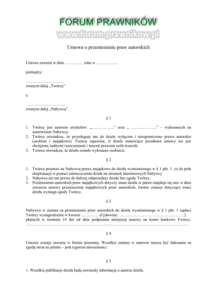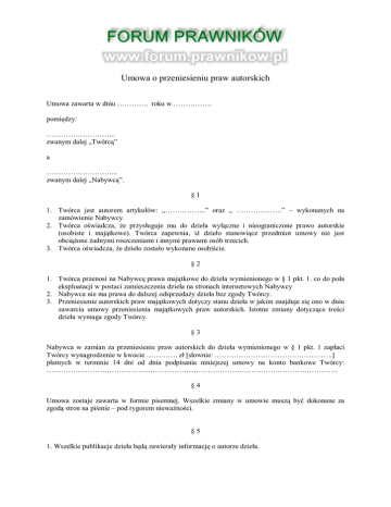 Umowa o przeniesieniu praw autorskich Umowa zawarta w dniu …………. roku w ……………. pomiędzy: ……………………….. zwanym dalej „Twórcą” a ………………………... zwanym dalej „Nabywcą”. §1 1. Twórca jest autorem artykułów: „……………..” oraz „ ……………….” – wykonanych na zamówienie Nabywcy. 2. Twórca oświadcza, że przysługuje mu do dzieła wyłączne i nieograniczone prawo autorskie (osobiste i majątkowe). Twórca zapewnia, iż dzieło stanowiące przedmiot umowy nie jest obciążone żadnymi roszczeniami i innymi prawami osób trzecich. 3. Twórca oświadcza, że dzieło zostało wykonane osobiście. §2 1. Twórca przenosi na Nabywcę prawa majątkowe do dzieła wymienionego w § 1 pkt. 1. co do pola eksploatacji w postaci zamieszczenia dzieła na stronach internetowych Nabywcy 2. Nabywca nie ma prawa do dalszej odsprzedaży dzieła bez zgody Twórcy. 3. Przeniesienie autorskich praw majątkowych dotyczy stanu dzieła w jakim znajduje się ono w dniu zawarcia umowy przeniesienia majątkowych praw autorskich. Istotne zmiany dotyczące treści dzieła wymaga zgody Twórcy. §3 Nabywca w zamian za przeniesienie praw autorskich do dzieła wymienionego w § 1 pkt. 1 zapłaci Twórcy wynagrodzenie w kwocie …………. zł [słownie: ………………………………………….] płatnych w terminie 14 dni od dnia podpisania niniejszej umowy na konto bankowe Twórcy: …………………………………………………………………………………………………………. §4 Umowa zostaje zawarta w formie pisemnej. Wszelkie zmiany w umowie muszą być dokonane za zgodą stron na piśmie – pod rygorem nieważności. §5 1. Wszelkie publikacje dzieła będą zawierały informację o autorze dzieła. §6 W sprawach nieuregulowanych w niniejszej umowie mają zastosowanie przepisy ustawy z dnia 4 lutego 1994 r. Prawo autorskie i prawa pokrewne (Dz.U. 1994 Nr 24 poz. 83 z późn. zm. ) oraz przepisy Kodeksu cywilnego. §7 Umowa została sporządzona w dwóch jednobrzmiących egzemplarzach, po jednym dla każdej strony. Twórca Nabywca