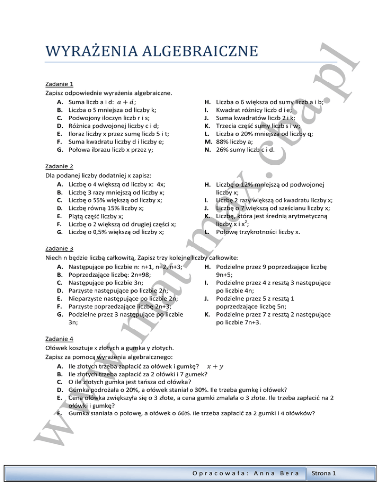 l .cb a.p WYRAZŻ ENIA ALGEBRAICZNE Zadanie 1 Zapisz odpowiednie wyrażenia algebraiczne. A. Suma liczb a i d: 𝑎 + 𝑑; B. Liczba o 5 mniejsza od liczby k; C. Podwojony iloczyn liczb r i s; D. Różnica podwojonej liczby c i d; E. Iloraz liczby x przez sumę liczb 5 i t; F. Suma kwadratu liczby d i liczby e; G. Połowa ilorazu liczb x przez y; H. I. J. K. L. M. N. Zadanie 2 Dla podanej liczby dodatniej x zapisz: A. Liczbę o 4 większą od liczby x: 4x; B. Liczbę 3 razy mniejszą od liczby x; C. Liczbę o 55% większą od liczby x; D. Liczbę równą 15% liczby x; E. Piątą część liczby x; F. Liczbę o 2 większą od drugiej części x; G. Liczbę o 0,5% większą od liczby x; H. Liczbę o 12% mniejszą od podwojonej liczby x; I. Liczbę 2 razy większą od kwadratu liczby x; J. Liczbę o 7 większą od sześcianu liczby x; K. Liczbę, która jest średnią arytmetyczną liczby x i x2; L. Połowę trzykrotności liczby x. t-m ax Liczba o 6 większa od sumy liczb a i b; Kwadrat różnicy liczb d i e; Suma kwadratów liczb 2 i k; Trzecia część sumy liczb s i w; Liczba o 20% mniejsza od liczby q; 88% liczby a; 26% sumy liczb c i d. ma Zadanie 3 Niech n będzie liczbą całkowitą, Zapisz trzy kolejne liczby całkowite: A. Następujące po liczbie n: n+1, n+2, n+3; H. Podzielne przez 9 poprzedzające liczbę 9n+5; B. Poprzedzające liczbę: 2n+98; C. Następujące po liczbie 3n; I. Podzielne przez 4 z resztą 3 następujące D. Parzyste następujące po liczbie 2n; po liczbie 4n; E. Nieparzyste następujące po liczbie 2n; J. Podzielne przez 5 z resztą 1 F. Parzyste poprzedzające liczbę 2n+3; poprzedzające liczbę 5n; G. Podzielne przez 3 następujące po liczbie K. Podzielne przez 7 z resztą 2 następujące 3n; po liczbie 7n+3. ww w. Zadanie 4 Ołówek kosztuje x złotych a gumka y złotych. Zapisz za pomocą wyrażenia algebraicznego: A. Ile złotych trzeba zapłacić za ołówek i gumkę? 𝑥 + 𝑦 B. Ile złotych trzeba zapłacić za 2 ołówki i 7 gumek? C. O ile złotych gumka jest tańsza od ołówka? D. Gumka podrożała o 20%, a ołówek staniał o 30%. Ile trzeba gumkę i ołówek? E. Cena ołówka zwiększyła się o 3 złote, a cena gumki zmalała o 3 złote. Ile trzeba zapłacić na 2 ołówki i gumkę? F. Gumka staniała o połowę, a ołówek o 66%. Ile trzeba zapłacić za 2 gumki i 4 ołówków? Opracowała: Anna Bera Strona 1 .cb a.p l Zadanie 5 W worku jest 𝑎 kilogramów mąki ziemniaczanej, a w skrzynce 𝑏 kilogramów mąki pszennej. Zapisz za pomocą wyrażenia algebraicznego, ile kilogramów mąki będzie w worku, a ile w skrzynce, jeśli: A. Z worka przesypiemy 3 kg mąki do skrzynki: 𝑎 − 3, 𝑏 + 3; B. Z skrzyni przesypiemy 8 kg mąki do worka; C. Ze skrzyni przesypiemy połowę jej zawartości do worka; D. Z worka przesypiemy trzecią część jego zawartości do skrzyni i jeszcze 1 kilogram; E. Ze skrzyni wysypiemy 6 kilogramów, a połowę pozostałej części przesypiemy do worka; F. Z worka przesypano całą zawartość do skrzyni, a następnie połowę jej zawartości przesypano do worka. ax Zadanie 6 Ania ma 𝑎 lat i jest o 4 lata młodsza od Marka oraz 3 razy starsza od Oli. A. Ile lat ma Marek? 𝑎 + 4 B. Ile lat będzie miała Ania, a ile Ola za 10 lat? C. Ile lat miała Ania, gdy urodziła się Ola? D. O ile lat Marek jest starszy od Oli? E. Ile lat będą mieli razem Ania i Marek za 6 lat? F. Ile lat miały dzieci 4 lata temu? ma t-m Zadanie 7 Dane są cztery cyfry 𝑎, 𝑏, 𝑐, 𝑑. Zapisz liczbę: A. Dwucyfrową, której cyfrą dziesiątek jest 𝑎, zaś cyfrą jedności 𝑑: 10𝑎 + 𝑏; B. Dwucyfrową, której cyfrą dziesiątek jest 𝑐, zaś cyfrą jedności 𝑎; C. Trzycyfrową, której cyfrą jedności jest 𝑎, cyfrą dziesiątek 𝑏, zaś cyfrą setek 𝑐; D. Liczbę o 1 większą od liczby dwucyfrowej o cyfrze dziesiątek 𝑐 i jedności 𝑑; E. Liczbę 2 razy większą od liczby trzycyfrowej o cyfrze setek 𝑑, dziesiątek 𝑏 i jedności 𝑎; F. Liczbę trzycyfrową której cyfrą setek jest 𝑎, cyfrą dziesiątek 0, a cyfrą jedności 𝑑; ww w. Zadanie 8 W klasie 1A jest 𝑑 dziewcząt i 𝑐 chłopców. A. Ilu jest uczniów w klasie? 𝑐 + 𝑑; B. Ilu uczniów liczyłaby klasa, gdyby dziewcząt było o 20% więcej? C. Ilu uczniów liczyłaby klasa, gdyby chłopców było 3 razy mniej, a dziewcząt o 3 więcej? D. Ilu uczniów liczyłaby klasa, gdyby dziewcząt było o 60% mniej, a chłopców o 40% więcej? E. Połowa dziewcząt nosi długie włosy i co czwarty chłopiec. Ilu uczniów ma długie włosy, a ilu krótkie? F. 30% dziewcząt i 20% chłopców ma średnią ocen poniżej 4,00. Ilu uczniów ma średnią co najmniej 4,00? Opracowała: Anna Bera Strona 2 (ℎ − 2)(𝑖 + 3) 𝑑𝑙𝑎 ℎ = 3 𝑖 𝑖 = −4 𝑘 2 + 2𝑗 2 − 𝑘𝑗 𝑑𝑙𝑎 𝑘 = −1 𝑖 𝑗 = 3 𝑙(𝑚 − 1) + 𝑚(𝑙 − 1) 𝑑𝑙𝑎 𝑙 = 2 𝑖 𝑚 = 5 −6𝑝𝑛 − 𝑝 + 𝑛 𝑑𝑙𝑎 𝑝 = −2 𝑖 𝑛 = 0 𝑠 − (𝑠 + 𝑟)𝑟 𝑑𝑙𝑎 𝑠 = 3 𝑖 𝑟 = −3 7𝑢 − 8(𝑡 + 10) 𝑑𝑙𝑎 𝑢 = 1 𝑖 𝑡 = 9 t-m ax Zadanie 10 Oblicz wartości liczbowe wyrażeń: A. 𝑥 2 + 1 dla x = −2; 𝑥 2 + 1 = (−2)2 + 1 = 5 H. B. 𝑎2 − 𝑎 + 3 𝑑𝑙𝑎 𝑎 = 3 I. C. 𝑏 − 𝑏(𝑏 + 1) 𝑑𝑙𝑎 𝑏 = 1 2 J. D. 𝑐 − 2(𝑐 + 6) 𝑑𝑙𝑎 𝑐 = −2 3 K. E. 5𝑑 − 𝑑 𝑑𝑙𝑎 𝑑 = −3 L. F. (𝑒 + 1)(𝑒 − 4) 𝑑𝑙𝑎 𝑒 = 5 M. G. 𝑔3 (27 − 𝑔2 ) 𝑑𝑙𝑎 𝑔 = 2 .cb a.p l Zadanie 9 Uczniowie klasy humanistycznej pisali test z matematyki. Dwie osoby dostały ocenę niedostateczną, trzy – ocenę dopuszczającą, 𝑦 osób – ocenę dostateczną, ocenę dobrą dostało o 5 osób więcej niż ocenę dostateczną, ocenę bardzo dobrą otrzymało 3 razy więcej osób niż ocenę dobrą, a ocen celujących nie było. A. Ile osób dostało ocenę dobrą? 𝑦 + 5 B. Ile łącznie osób otrzymało 