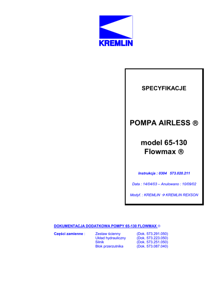 SPECYFIKACJE POMPA AIRLESS model 65-130 Flowmax Instrukcja : 0304 573.020.211 Data : 14/04/03 – Anulowano : 10/09/02 Modyf. : KREMLIN KREMLIN REXSON DOKUMENTACJA DODATKOWA POMPY 65-130 FLOWMAX Części zamienne : Zestaw ścienny Układ hydrauliczny Silnik Blok przerzutnika (Dok. 573.291.050) (Dok. 573.223.050) (Dok. 573.251.050) (Dok. 573.087.040) KREMLIN REXSON - Site de Stains : 150, avenue de Stalingrad 93 245 - STAINS CEDEX - FRANCE Téléphone : 33 (0)1 49 40 25 25 Fax : 33 (0)1 48 26 07 16 SPECYFIKACJE POMPA AIRLESS , model 65-130 Flowmax 1. PARAMETRY TECHNICZNE PompA pneumatyczna z uszczelnieniem mieszkowym . Prosta w obsłudze i łatwa w konserwacji. Bez konieczności smarowania. Zalecana do : Zasilania jednego lub kilku pistoletów typu AIRLESS lub AIRMIX 200 Rozpylania materiałów półpłynnych (produkty antykorozyjne, kleje) Circulating Typ silnika….......................................8000-4 F Typ korpusu pompy ........................ 130 F Przełożenie ciśnieniowe teoretyczne..... 65/1 Przełożenie ciśnieniowe rzeczywiste..... 65/1 Skok silnika. 100 mm Przekrój silnika. 804 cm2 Przekrój hydrauliczny. 12 cm2 Obj. Materiału tłoczonego w cyklu. 240 cm3 Materiały pozostające w bezpośrednim kontakcie z produktem : Stal nierdzewna utwardzana, stal nierdzewna, weglik. Liczba cylki na 1 litr materiału. Dławnice uszczelniające : Mieszek : polietylen Górna dławnica : uszczelka GT (polietylen) Dławnica ruchoma : uszczelka GT (polietylen Ciężar : 4 Wydatek (przy 20 cyklach). 4,8 l Maks. ciśnienie powietrza na wejściu 6 bar Maks. ciśnienie produktu 390 bar Poziom hałasu. 78 dBa Maks. temperatura użytkowania 50°C Pompa ścienna z przewodem ...................................... 120 kg Pompa przenośna ....................................……………… 150 kg Przyłącza Powietrze a wMateriał KREMLIN Pompa bez wyposażenia Pompa z wyposażeniem Wlot Zewnętrzne 3/4 BSP (zawór Zewnętrzne 3/4 BSP (zawór) Wlot Zewnętrzne 1" BSP Złączka MM 1" - 38x150 + Przewód ssący (złączka F 38x150) Wylot Zewnętrzne 3/4 NPS Wewnętrzne 3/4 JIC (wylot z filtra) Strona 1 Instrukcja : 573.020.211 Przewody przyłączeniowe Przewód doprowadzający powietrze do pompy ( min. przy długości 5 m) : 20 mm Przewód materiałowy AIRLESS (między wylotem materiału z pompy a pistoletem) : 9,52 mm int. ROZMIARY Rep. Mm Rep. mm Rep. mm Rep. mm Rep. mm Rep. mm A 1480 B 1165 C 725 D 390 E 1160 F 575 G Ø 380 H 530 I 470 J 180 K 485 L 288 M 107,5 N 251 O 321 P 150 Q 70 R 35 S 17 T 15 U 7x15 V 11 W 22 X 11 Y 18 Stojak ścienny do montazu pompy KREMLIN Strona 2 Instrukcja : 573.020.211 Widok z góry Widok z przodu KREMLIN Strona 3 Instrukcja : 573.020.211 2. KONSERWACJA UWAGA : Przed każdą czynnością wykonywaną na pompie odciąć dopływ sprężonego powietrza i opróżnić przewody z ciśnienia naciskając na spust pistoletu . Wymiana części hydraulicznej lub silnika (POR DOK. 573.291.050) Zdemontować cały osprzęt pompy (przewody, filtr). Zdjąć pompę z wózka a następnie ze stojaka wyciągając nakrętki przytrzymujące strzemiona. Połozyć pompę na stole warsztatowym (pompa jest wyposażona w ucho do podnoszenia). W celu wymiany części hydraulicznej (2) lub silnika (1), należy zdemontować pompę (patrz poniżej) : - Zdemontować część hydrauliczną (patrz dok. 573.223.050) Zdjąć rurę łączącą (41), zawór ssący (30), cylinder (21). Wyjąć 3 nakrętki (11) przytrzymujące 3 kotwy (7) i wysunąć kołnierz górny (1). Przytrzymać drążek sterujący silnika i odkręcić tłok (22). - Zdemontować sprzęgło - Wyjąć silnik Demontaż / powtórny montaż części hydraulicznej Odkręcić nakrętkę złączki (38) oraz śruby (43 i 45) aby zdjąć rurę łączącą (41). Zawór ssący (PATRZ DOK. 573.223.050) Odkręcić zawór ssący (30). (Jeśli cylinder (21) jest połączony z zaworem ssącym Odrkęcić całość, następnie przytrzymać cylinder (21) (za pomocą szpilki włożonej do specjalnego otworu na cylindrze) . Kulka (32) jest utrzymywana w obsadzie zaworu (31) za pomocą okrągłego pierścienia sprężynującego (33). Oczyścić części. Zamontować zawór ssący (30) oraz uszczelkę (24) wymieniając części w razie konieczności. CYLINDER Cylinder (21) posiada na końcach dwa otwory ułatwiające demontaż. W zależności od kolejności odkręcania części włożyć szpilkę w jeden z otworów aby odkręcić drugą część. Przy powtórnym montażu nie zapomnieć o 2 uszczelkach (24). Nasmarować wnętrze cylindra aby nie uszkodzić ruchomej dławnicy. Zawór tłoczny i ruchoma dławnica Odkręcić cylinder (21) i pociągnąć go w dół Odkręcić zawór tłoczny (29) przytrzymując tłok (22). Wyjąć kulkę (25), pierścień (34) i ruchomą dławnicę (uszczelka GT 23). Oczyścić części i zamontować je wymieniając uszczelki w razie potrzeby. W czasie montażu zachować właściwy kierunek ustawienia uszczelki GT. 29 34 23 21 Uszczelka górna KREMLIN Strona 4 Instrukcja : 573.020.211 Odkręcić 4 śruby (26). Wyjąć uszczelkę (27) ciągnąć za kołnierz tłoczny (20) do dołu. Wymienić uszczelkę (27) i pierścienie uszczelniające okrągłe (8 i 24). Powtórny montaż Umieścić uszczelkę GT (27) na stożku (50).(Narzędzie w kształcie stożka dostarczane wraz z hydrauliką). W czasie montażu przestrzegać kierunku ustawienia uszczelki GT. W prowadzić tłok (22) do kołnierza (20) w kierunku od dołu do góry . Umieścić stożek wraz z uszczelką na górze tłoka. Wsunąć uszczelkę na tłok (stożek zapobiega uszkodzeniu uszczelki w czasie montażu tłoka ). Wyjąć stożek. Umieścić uszczelkę w kołnierzu tłocznym (20). Przytrzymać tłok, aby nie ześlizgnął się w dół. Założyć górny pierścień (35) i dokręcić całość za pomocą śrub (26). Demontaż/ powtórny montaż sprzęgła (mieszkowego) Ta operacja może zostać przeprowadzona po demontażu części hydraulicznej. MIESZEK (PATRZ DOK. 