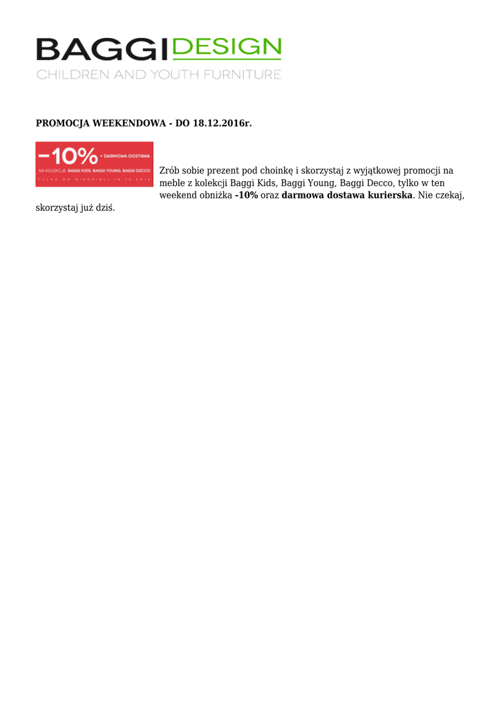 PROMOCJA WEEKENDOWA - DO 18.12.2016r. Zrób sobie prezent pod choinkę i skorzystaj z wyjątkowej promocji na meble z kolekcji Baggi Kids, Baggi Young, Baggi Decco, tylko w ten weekend obniżka -10% oraz darmowa dostawa kurierska. Nie czekaj, skorzystaj już dziś.