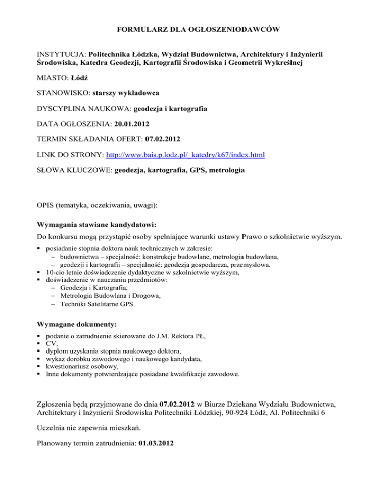 FORMULARZ DLA OGŁOSZENIODAWCÓW INSTYTUCJA: Politechnika Łódzka, Wydział Budownictwa, Architektury i Inżynierii Środowiska, Katedra Geodezji, Kartografii Środowiska i Geometrii Wykreślnej MIASTO: Łódź STANOWISKO: starszy wykładowca DYSCYPLINA NAUKOWA: geodezja i kartografia DATA OGŁOSZENIA: 20.01.2012 TERMIN SKŁADANIA OFERT: 07.02.2012 LINK DO STRONY: http://www.bais.p.lodz.pl/_katedry/k67/index.html SŁOWA KLUCZOWE: geodezja, kartografia, GPS, metrologia OPIS (tematyka, oczekiwania, uwagi): Wymagania stawiane kandydatowi: Do konkursu mogą przystąpić osoby spełniające warunki ustawy Prawo o szkolnictwie wyższym. posiadanie stopnia doktora nauk technicznych w zakresie: budownictwa – specjalność: konstrukcje budowlane, metrologia budowlana, geodezji i kartografii – specjalność: geodezja gospodarcza, przemysłowa. 10-cio letnie doświadczenie dydaktyczne w szkolnictwie wyższym, doświadczenie w nauczaniu przedmiotów: Geodezja i Kartografia, Metrologia Budowlana i Drogowa, Techniki Satelitarne GPS. Wymagane dokumenty: podanie o zatrudnienie skierowane do J.M. Rektora PŁ, CV, dyplom uzyskania stopnia naukowego doktora, wykaz dorobku zawodowego i naukowego kandydata, kwestionariusz osobowy, Inne dokumenty potwierdzające posiadane kwalifikacje zawodowe. Zgłoszenia będą przyjmowane do dnia 07.02.2012 w Biurze Dziekana Wydziału Budownictwa, Architektury i Inżynierii Środowiska Politechniki Łódzkiej, 90-924 Łódź, Al. Politechniki 6 Uczelnia nie zapewnia mieszkań. Planowany termin zatrudnienia: 01.03.2012