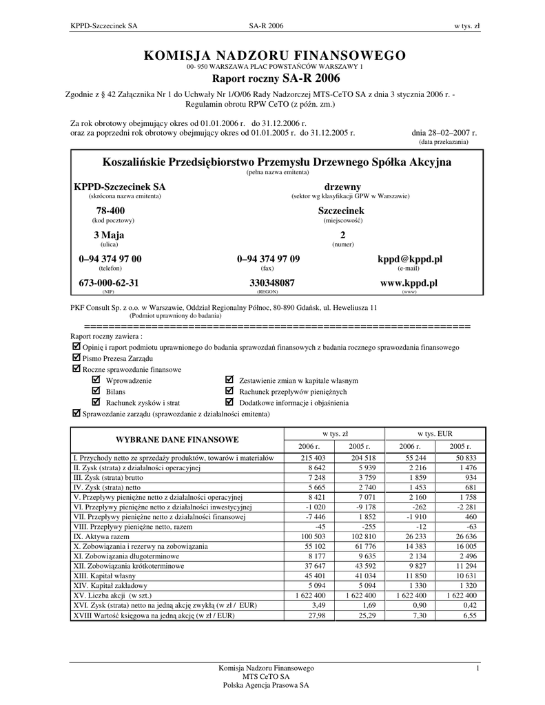 KPPD-Szczecinek SA SA-R 2006 w tys. zł KOMISJA NADZORU FINANSOWEGO 00- 950 WARSZAWA PLAC POWSTA CÓW WARSZAWY 1 Raport roczny SA-R 2006 Zgodnie z § 42 Zał cznika Nr 1 do Uchwały Nr 1/O/06 Rady Nadzorczej MTS-CeTO SA z dnia 3 stycznia 2006 r. Regulamin obrotu RPW CeTO (z pó n. zm.) Za rok obrotowy obejmuj cy okres od 01.01.2006 r. do 31.12.2006 r. oraz za poprzedni rok obrotowy obejmuj cy okres od 01.01.2005 r. do 31.12.2005 r. dnia 28–02–2007 r. (data przekazania) Koszali skie Przedsi biorstwo Przemysłu Drzewnego Spółka Akcyjna (pełna nazwa emitenta) KPPD-Szczecinek SA drzewny (skrócona nazwa emitenta) (sektor wg klasyfikacji GPW w Warszawie) 78-400 Szczecinek (kod pocztowy) (miejscowo ) 3 Maja 2 (ulica) (numer) 0–94 374 97 00 0–94 374 97 09 (telefon) [email protected] (fax) 673-000-62-31 (e-mail) 330348087 (NIP) www.kppd.pl (REGON) (www) PKF Consult Sp. z o.o. w Warszawie, Oddział Regionalny Północ, 80-890 Gda sk, ul. Heweliusza 11 (Podmiot uprawniony do badania) =============================================================== Raport roczny zawiera : Opini i raport podmiotu uprawnionego do badania sprawozda finansowych z badania rocznego sprawozdania finansowego Pismo Prezesa Zarz du Roczne sprawozdanie finansowe Wprowadzenie Zestawienie zmian w kapitale własnym Bilans Rachunek przepływów pieni nych Rachunek zysków i strat Dodatkowe informacje i obja nienia Sprawozdanie zarz du (sprawozdanie z działalno ci emitenta) WYBRANE DANE FINANSOWE I. Przychody netto ze sprzeda y produktów, towarów i materiałów II. Zysk (strata) z działalno ci operacyjnej III. Zysk (strata) brutto IV. Zysk (strata) netto V. Przepływy pieni ne netto z działalno ci operacyjnej VI. Przepływy pieni ne netto z działalno ci inwestycyjnej VII. Przepływy pieni ne netto z działalno ci finansowej VIII. Przepływy pieni ne netto, razem IX. Aktywa razem X. Zobowi zania i rezerwy na zobowi zania XI. Zobowi zania długoterminowe XII. Zobowi zania krótkoterminowe XIII. Kapitał własny XIV. Kapitał zakładowy XV. Liczba akcji (w szt.) XVI. Zysk (strata) netto na jedn akcj zwykł (w zł / EUR) XVIII Warto ksi gowa na jedn akcj (w zł / EUR) w tys. zł w tys. EUR 2006 r. 2005 r. 2006 r. 2005 r. 215 403 8 642 7 248 5 665 8 421 -1 020 -7 446 -45 100 503 55 102 8 177 37 647 45 401 5 094 1 622 400 3,49 27,98 204 518 5 939 3 759 2 740 7 071 -9 178 1 852 -255 102 810 61 776 9 635 43 592 41 034 5 094 1 622 400 1,69 25,29 55 244 2 216 1 859 1 453 2 160 -262 -1 910 -12 26 233 14 383 2 134 9 827 11 850 1 330 1 622 400 0,90 7,30 50 833 1 476 934 681 1 758 -2 281 460 -63 26 636 16 005 2 496 11 294 10 631 1 320 1 622 400 0,42 6,55 Komisja Nadzoru Finansowego MTS CeTO SA Polska Agencja Prasowa SA 1 KPPD-Szczecinek SA SA-R 2006 w tys. zł Szanowni Pa stwo, Akcjonariusze Koszali skiego Przedsi biorstwa Przemysłu Drzewnego SA Min ł kolejny rok, którego efekty przedstawiamy w niniejszym raporcie rocznym. Zapraszam do lektury raportu, tym bardziej e 2006 rok nale y uzna za udany dla naszej Spółki. W zakresie podstawowej działalno ci wyniki były lepsze ni osi gni te w roku 2005. Wy szy był poziom przychodów ze sprzeda y, znacznie wzrósł tak e zysk netto. W 2006 roku działalno ci Spółki sprzyjała dobra koniunktura, której efekty odczuwalne były zwłaszcza w II półroczu. Zwi kszaj ca si sprzeda produktów wysokoprzetworzonych to wyra ny efekt dokonanych w latach ubiegłych inwestycji. W 2006 roku zrealizowane inwestycje tak e były podporz dkowane strategii zmiany struktury produkcji i zwi kszania uszlachetniania tarcicy. Uruchomili my w zakładach nowoczesne: wielopiły, suszarnie, obrzynarki i strugarki. Dodatkowo rozwin li my zagospodarowanie odpadów i obecnie wi kszo powstaj cych w zakładach odpadów jest wykorzystywana przez nie jako paliwo oraz do produkcji brykietów. Poza efektami ekonomicznymi – działalno ta przynosi wymierne korzy ci ekologiczne. W 2006 roku nale no ci handlowe Spółki w obrocie krajowym i zagranicznym obj te były ubezpieczeniem przez polski oddział austriackiej firmy Coface AG. Jednocze nie wprowadzili my bardziej precyzyjny system monitoringu nale no ci. W efekcie nasza Spółka nie poniosła znacz cych strat z tytułu braku płatno ci za wyroby. Kontynuowane były prace kompleksowej informatyzacji Spółki. Rozpocz li my projekt wdra ania zintegrowanego systemu informatycznego klasy ERP mySAP. Prace prowadzone s intensywnie i w I półroczu 2007 roku przeprowadzimy pierwsze próby całego systemu. Rok 2006 przyniósł tak e problemy z którymi borykała si Spółka. Tradycyjnym zagro eniem była monopolistyczna pozycja Lasów Pa stwowych na rynku surowca w zakresie kreowania zasad sprzeda y, cen i dost pu do surowca. W sytuacji bardzo du ego uzale nienia Spółki od tego dostawcy podstawowego surowca produkcyjnego, brak stabilnej, przewidywalnej i wieloletniej polityki w tym zakresie jest głównym czynnikiem ryzyka we współpracy z Lasami. W omawianym roku udało si jednak zaopatrzy nasze tartaki w ilo surowca, która zapewniła nieprzerwan produkcj , a na rok 2007 mamy podobn ilo zagwarantowan umow . Innym, stale wyst puj cym w obrocie gospodarczym zagro eniem jest ryzyko kursowe. W tym wypadku cz przychodów w euro jest zabezpieczona odwrotnymi transakcjami zakupu surowca i materiałów z importu oraz finansowymi instrumentami pochodnymi typu forward. W roku 2007 zakładamy zwi kszenie nakładów inwestycyjnych do 15 mln zł, przy czym jednym z głównych zada inwestycyjnych b dzie kontynuacja informatyzacji. Oczekujemy, e ostatecznie realizacja tego projektu przyczyni si do uporz dkowania i uproszczenia pewnych procesów oraz poprawi organizacj pracy. Przed nami kolejny rok wyt onej pracy, której efekty, mam nadziej , przewy sz wyniki uzyskane w 2006 roku. Teraz jednak zapraszam Pa stwa do zapoznania si z cało ci raportu rocznego 2006. Z powa aniem Longin Graczkowski Prezes Zarz du KPPD-Szczecinek SA Komisja Nadzoru Finansowego MTS CeTO SA Polska Agen