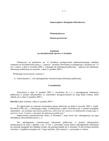 (...) Samorządowe Kolegium Odwoławcze Wnioskodawca: Strona przeciwna: Zażalenie na niezałatwienie sprawy w terminie Niniejszym na podstawie art. 37 Kodeksu postępowania administracyjnego składam zażalenie na niezałatwienie przez (...) sprawy - pomimo obowiązku wynikającego z przepisu art. 13 ust 1 ustawy z dnia 6 września 2001 r. o dostępie do informacji publicznej – poprzez nie udzielenie informacji publicznej na wniosek z dniu 21 grudnia 2007 r. Wskazując na powyższe, wnoszę o: 1) zobowiązanie (...) do udostępnienia wnioskowanej informacji publicznej. Uzasadnienie Wnioskiem z dnia 21 grudnia 2007 r. zwróciłem do (...) o udostępnienie informacji publicznej w postaci dokumentów, tj. materiałów przygotowanych na sesję Rady Gminy, która odbyła się w dniu 21 grudnia 2007 r. Dowód: kopia wniosku z dnia 21 grudnia 2007 r. W odpowiedzi na wniosek otrzymałem pismo datowane na dzień 4 stycznia 2007 r. (znak: RO.0824-2/08) od (...) informujące mnie, iż dokumenty o jakie zwróciłem się, w postaci kompletu materiałów „nie podlega informacji publicznej, albowiem nie stanowi on dokumentu urzędowego w myśl art. 6 ust. 2 ustawy o dostępie do informacji publicznej.” Jednocześnie poinformowano mnie, iż Protokół z sesji może być udostępniony po jego formalnym zatwierdzeniu przez (...). Nie udostępniono wnioskowanej informacji publicznej, w postaci dokumentów przekazanych na sesji z zgodnie z art. 13 ust. 1 cytowanej wyżej ustawy udostępnienie informacji na wniosek następuje bez zbędnej zwłoki, nie później jednak niż w terminie 14 dni od dnia złożenia wniosku z wyjątkiem przepisu ust. 2 tego artykułu. Tym samym (...) pozostaje w zwłoce. W myśl w wpisanego w art. 61 Konstytucji prawa dostępu do informacji publicznej oraz zgodnie z zasadami zawartymi w ustawie o dostępie do informacji publicznej nie sposób zgodzić się ze stanowiskiem zawartym w piśmie (...) iż komplet materiałów „nie podlega informacji publicznej, albowiem nie stanowi on dokumentu urzędowego w myśl art. 6 ust. 2 ustawy o dostępie do informacji publicznej , a to z następujących przyczyn. I. (...) nie udostępnia informacji publicznej powołując się na fakt, iż podczas sesji radni nie otrzymali żadnego dokumentu urzędowego w myśl art. 6 ust. 2 ustawy o dostępie do informacji publicznej. Jednakże ja nie wnosiłem o udostępnienie informacji publicznej, którą miał być dokument urzędowy, lecz dokument, który został wręczony podczas sesji. W art. 61 Konstytucji oraz w przepisach ustawy o dostępie do informacji publicznej brak jest jakichkolwiek przepisów wskazujących, iż udostępnieniu podlegają jedynie dokumenty urzędowe. Przeciwnie prawo do informacji publicznej ustanowione w art. 61 Konstytucji stanowi w ust. 2 m. in., iż „Prawo do uzyskiwania informacji obejmuje dostęp do dokumentów”, tym samym zagwarantowany został dostęp do informacji publicznej w postaci dokumentów bez względu czy jest on dokumentem urzędowym w myśl przepisu art. 6 ust. 2 ustawy o dostępie do informacji publicznej, czy też nie ma takiego charakteru. Prawo do informacji publicznej zostało zapisane w art. 61 Konstytucji, natomiast ustawa o dostępie do informacji publicznej wypełnia przepis art. 61 ust. 4, czyli reguluje tryb udzielania informacji o jakich mowa w art. 61 ust. 1 i 2 Konstytucji. Tym samym ustawa o dostępie do informacji publicznej reguluje m. in. dostęp do dokumentów (art. 61 ust. 2) Konstytucji. Zgodnie z powyższym na podstawie art. 10 ust. 1 ustawy o dostępie do informacji publicznej zwróciłem się do (...) o udostępnienie dokumentu, wypełniając moje prawo człowieka zapisane w Konstytucji. Przedstawiona argumentacja przez (...) prowadzi do niezgodnego z prawem ograniczenia prawa człowieka i jako taka jest bezzasadna. Przypomnieć należy, iż ograniczenie prawa do informacji publicznej może nastąpić wyłącznie zgodnie z art. 61 ust. 3 Konstytucji oraz w myśl art. 31 ust. 3 Konstytucji. W przypadku przepisu art. 61 ust. 2 w zakresie dostępu do dokumentów należy sięgnąć do definicji językowej słowa dokument. Zgodnie ze Słownikiem Języka Polskiego, Wydawnictwo PWN, dokumentem jest: 1. pismo urzędowe, 2. dowód stwierdzający czyjąś tożsamość, 3. materiał w postaci tekstu, fotografii lub jakikolwiek przedmiot, mający wartość dowodową lub informacyjną, 4. plik komputerowy zawierający informacje zapisane w odpowiednim formacie, 5. środ. «film dokumentalny. Powyższe wskazuje, iż dokument jaki otrzymali Radni podczas spotkania (...) mieści się w słownikowym rozumieniu dojęcia „dokument” jako materiału w postaci tekstu. Obowiązkiem (...) jest udostępnienie żądanych informacji . Stanowisko takie potwierdza wyrok Wojewódzkiego Sądu Administracyjnego w Gdańsku, sygn,. akt II SA/Gd 897/05 z dnia 21 lutego 2006 r. w uzasadnieniu, którego podniesione zostało m. in: „(...) Ważne jest też, że prawo do uzyskania informacji obejmuje m.in. dostęp do dokumentów. Wynika to wprost z art. 61 ust. 2 Konstytucji i, co istotne, Konstytucja nie ogranicza tego dostępu jedynie do dokumentów urzędowych. O uprawnieniu do wglądu jedynie do dokumentów urzędowych, rozumianych jako treść oświadczenia woli lub wiedzy, utrwalona i podpisana w dowolnej formie przez funkcjonariusza publicznego w rozumieniu przepisów Kodeksu karnego mówi art. 3 ust. 1 pkt 2 w zw. z art. 6 ust. 2 ustawy o dostępie do informacji publicznej. (...) Jednakże skoro Konstytucja stanowi o dostępie do dokumentów w szerszym znaczeniu, to przepis art. 3 ust. 1 ustawy o dostępie do informacji publicznej, określający zakres prawa do informacji, należy wykładać w zgodzie z Konstytucją i w konsekwencji przyjąć, że dostęp do dokumentów innych niż urzędowe jest zagwarantowany w art. 3 ust. 1 pkt 1 ustawy o dostępie do informacji publicznej, który mówi o dostępie do informacji publicznej w ogólności.”. Na ma