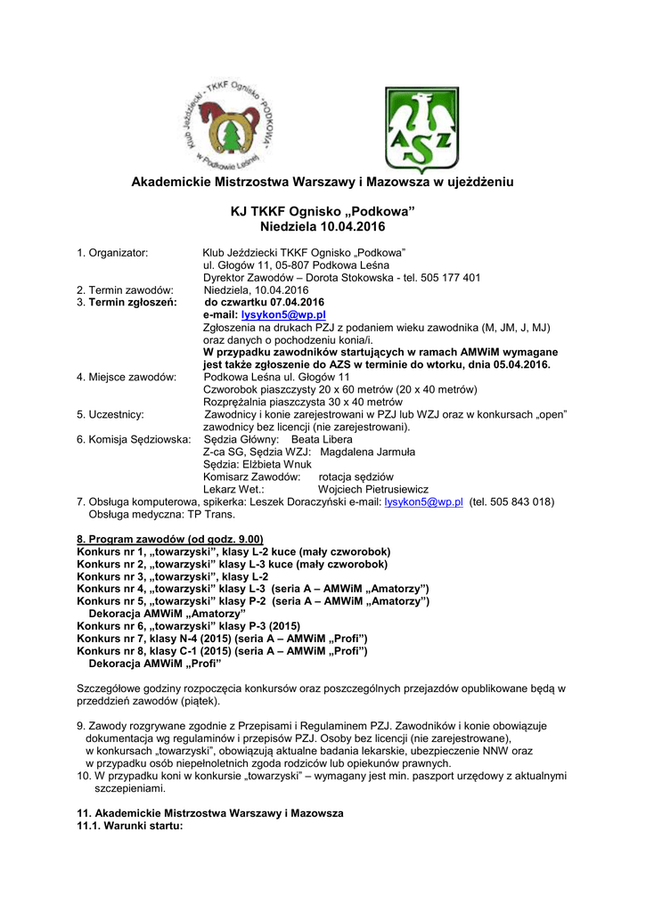 Akademickie Mistrzostwa Warszawy i Mazowsza w ujeżdżeniu KJ TKKF Ognisko „Podkowa” Niedziela 10.04.2016 1. Organizator: Klub Jeździecki TKKF Ognisko „Podkowa” ul. Głogów 11, 05-807 Podkowa Leśna Dyrektor Zawodów – Dorota Stokowska - tel. 505 177 401 2. Termin zawodów: Niedziela, 10.04.2016 3. Termin zgłoszeń: do czwartku 07.04.2016 e-mail: [email protected] Zgłoszenia na drukach PZJ z podaniem wieku zawodnika (M, JM, J, MJ) oraz danych o pochodzeniu konia/i. W przypadku zawodników startujących w ramach AMWiM wymagane jest także zgłoszenie do AZS w terminie do wtorku, dnia 05.04.2016. 4. Miejsce zawodów: Podkowa Leśna ul. Głogów 11 Czworobok piaszczysty 20 x 60 metrów (20 x 40 metrów) Rozprężalnia piaszczysta 30 x 40 metrów 5. Uczestnicy: Zawodnicy i konie zarejestrowani w PZJ lub WZJ oraz w konkursach „open” zawodnicy bez licencji (nie zarejestrowani). 6. Komisja Sędziowska: Sędzia Główny: Beata Libera Z-ca SG, Sędzia WZJ: Magdalena Jarmuła Sędzia: Elżbieta Wnuk Komisarz Zawodów: rotacja sędziów Lekarz Wet.: Wojciech Pietrusiewicz 7. Obsługa komputerowa, spikerka: Leszek Doraczyński e-mail: [email protected] (tel. 505 843 018) Obsługa medyczna: TP Trans. 8. Program zawodów (od godz. 9.00) Konkurs nr 1, „towarzyski”, klasy L-2 kuce (mały czworobok) Konkurs nr 2, „towarzyski” klasy L-3 kuce (mały czworobok) Konkurs nr 3, „towarzyski”, klasy L-2 Konkurs nr 4, „towarzyski” klasy L-3 (seria A – AMWiM „Amatorzy”) Konkurs nr 5, „towarzyski” klasy P-2 (seria A – AMWiM „Amatorzy”) Dekoracja AMWiM „Amatorzy” Konkurs nr 6, „towarzyski” klasy P-3 (2015) Konkurs nr 7, klasy N-4 (2015) (seria A – AMWiM „Profi”) Konkurs nr 8, klasy C-1 (2015) (seria A – AMWiM „Profi”) Dekoracja AMWiM „Profi” Szczegółowe godziny rozpoczęcia konkursów oraz poszczególnych przejazdów opublikowane będą w przeddzień zawodów (piątek). 9. Zawody rozgrywane zgodnie z Przepisami i Regulaminem PZJ. Zawodników i konie obowiązuje dokumentacja wg regulaminów i przepisów PZJ. Osoby bez licencji (nie zarejestrowane), w konkursach „towarzyski”, obowiązują aktualne badania lekarskie, ubezpieczenie NNW oraz w przypadku osób niepełnoletnich zgoda rodziców lub opiekunów prawnych. 10. W przypadku koni w konkursie „towarzyski” – wymagany jest min. paszport urzędowy z aktualnymi szczepieniami. 11. Akademickie Mistrzostwa Warszawy i Mazowsza 11.1. Warunki startu: - W AMWIM mogą brać udział studenci wszystkich typów studiów, mający ważny certyfikat przynależności akademickiej - wypełnia się go w internecie i podstemplowuje na swojej uczelni - oraz mający legitymację ISIC – AZS (szczegóły regulaminu i zgłoszeń na stronie www.azs.waw.pl), - kategoria „Amatorzy” – wyłącznie zawodnicy, którzy w latach 2014-2015 nie posiadali III klasy sportowej i jednocześnie: posiadający min. jeździecką licencję zawodnika WZJ/PZJ „A” (wstępną) i licencję konia WZJ/PZJ oraz zawodnicy i/lub konie nie zarejestrowani w WZJ/PZJ. - kategoria „Profi” – zawodnicy, którzy w roku 2014 lub 2015 posiadali III klasę sportową i posiadający aktualnie minimum III licencję WZJ/PZJ, konie z licencją WZJ/PZJ. 11.2. W przejazdach zaliczanych do AMWiM niedopuszczalne są przejazdy z batem oraz czytanie programu konkursu. 11.3. Do klasyfikacji AMWiM zaliczać się będą wyniki: - kategoria „Amatorzy” – konkursów L-3 i P-2 - kategoria „Profi” – konkursów N-4 i C-1 O zajętym miejscu decyduje łączny wynik dwóch startów. Sklasyfikowani będą zawodnicy, którzy ukończą obydwa przejazdy. W przypadku równej ilości punktów procentowych w dwóch startach o zajętym miejscu decyduje wynik w konkursie wyższej klasy. 12. Nie przewiduje się odprawy technicznej. Zawodnicy zobowiązani są do przedstawienia dokumentów i wniesienia opłat na minimum godzinę przed rozpoczęciem konkursu. 13. Wpisowe: 100 PLN / jeden start; 170 PLN / dwa starty. Organizator nie zapewnia miejsca dla koni oraz paszy. 14. Nagrody ZR: flots, puchary i nagrody rzeczowe. Ogólna pula nagród: min. 1.500 PLN Począwszy od konkursu nr 3 prowadzona będzie osobna klasyfikacja wyników końcowych dla Kucy i Dużych Koni. Nagrody AMWiM w gestii AZS. Do dekoracji poszczególnych klasyfikacji zaproszeni będą medaliści. 15. Wstęp na zawody bezpłatny. Katering – bar na terenie zawodów. 16. Organizator nie ponosi odpowiedzialności za kradzieże, wypadki i inne szkody mogące powstać w trakcie zawodów oraz w czasie transportu na i po zawodach. 17. Organizator zastrzega sobie prawo do korekt w programie i propozycjach zawodów. 18. Zawody zatwierdzone przez WMZJ. KODEKS POSTĘPOWANIA Z KONIEM I. Na wszystkich etapach treningu i przygotowań konia do startu w zawodach, dobrostan konia musi stać ponad wszelkimi innymi wymaganiami. Dotyczy to stałej opieki, metod treningu, starannego obrządku, kucia oraz transportu. II. Konie i jeźdźcy muszą być zdrowi, kompetentni i wytrenowani, zanim wezmą udział w zawodach. Dotyczy to także stosowanych leków, środków medycznych oraz zabiegów chirurgicznych zagrażających dobrostanowi konia lub ciąży klaczy, oraz przypadków nadużywania pomocy medycznej. III. Zawody nie mogą zagrażać dobrostanowi konia. Należy zwracać szczególną uwagę na teren zawodów, stan techniczny podłoża, warunki stajenne i atmosferyczne, kondycję koni i ich bezpieczeństwo, także podczas podroży powrotnej z zawodów. IV. Należy dołożyć wszelkich starań, aby zapewnić koniom staranną opiekę po zakończeniu zawodów, a także humanitarne traktowanie po zakończeniu kariery sportowej. Dotyczy to właściwej opieki weterynaryjnej, leczenia obrażeń odniesionych na zawodach, spokojnej starości, ewentualnie eutanazji. V. Polski Związek Jeździecki usilnie zachęca wszystkie osoby działające w sporcie jeździeckim do stałego podnoszenia swojej wiedzy oraz umiejęt