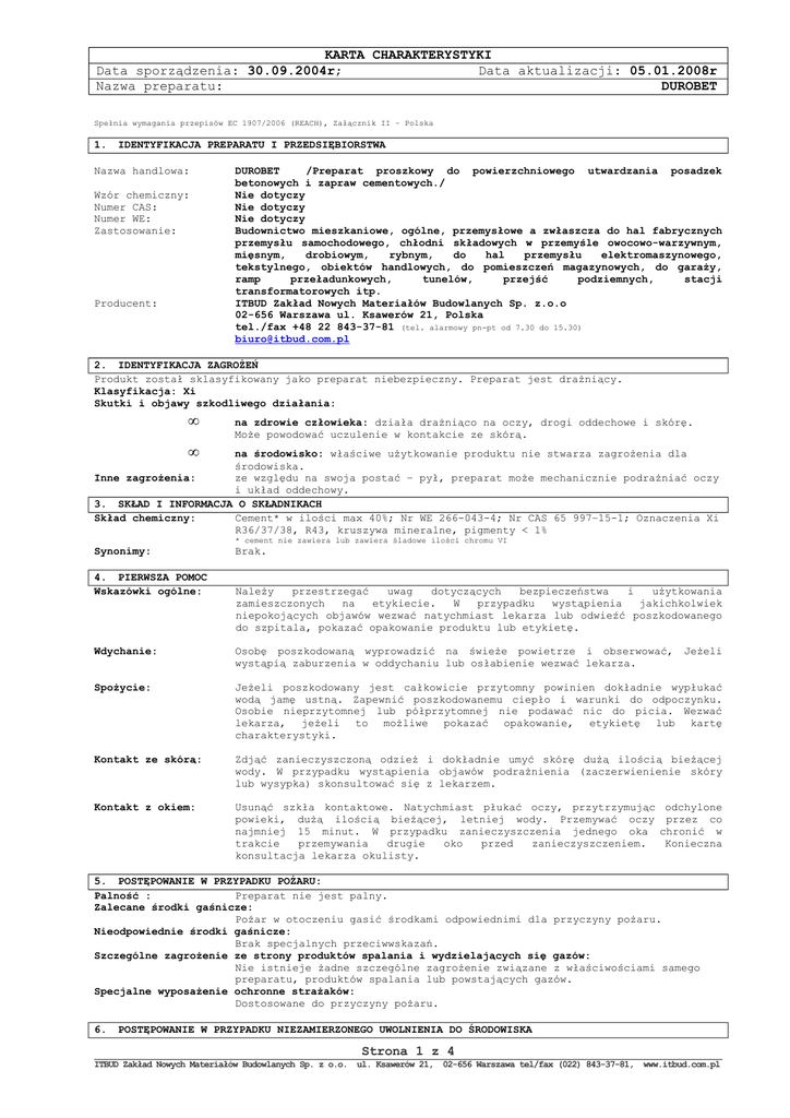 KARTA CHARAKTERYSTYKI Data sporządzenia: 30.09.2004r; Data aktualizacji: 05.01.2008r Nazwa preparatu: DUROBET Spełnia wymagania przepisów EC 1907/2006 (REACH), Załącznik II – Polska 1. IDENTYFIKACJA PREPARATU I PRZEDSIĘBIORSTWA Nazwa handlowa: Wzór chemiczny: Numer CAS: Numer WE: Zastosowanie: Producent: DUROBET /Preparat proszkowy do powierzchniowego utwardzania posadzek betonowych i zapraw cementowych./ Nie dotyczy Nie dotyczy Nie dotyczy Budownictwo mieszkaniowe, ogólne, przemysłowe a zwłaszcza do hal fabrycznych przemysłu samochodowego, chłodni składowych w przemyśle owocowo-warzywnym, mięsnym, drobiowym, rybnym, do hal przemysłu elektromaszynowego, tekstylnego, obiektów handlowych, do pomieszczeń magazynowych, do garaży, ramp przeładunkowych, tunelów, przejść podziemnych, stacji transformatorowych itp. ITBUD Zakład Nowych Materiałów Budowlanych Sp. z.o.o 02-656 Warszawa ul. Ksawerów 21, Polska tel./fax +48 22 843-37-81 (tel. alarmowy pn-pt od 7.30 do 15.30) [email protected] 2. IDENTYFIKACJA ZAGROŻEŃ Produkt został sklasyfikowany jako preparat niebezpieczny. Preparat jest drażniący. Klasyfikacja: Xi Skutki i objawy szkodliwego działania: • • na zdrowie człowieka: działa drażniąco na oczy, drogi oddechowe i skórę. Może powodować uczulenie w kontakcie ze skórą. na środowisko: właściwe użytkowanie produktu nie stwarza zagrożenia dla środowiska. Inne zagrożenia: ze względu na swoja postać – pył, preparat może mechanicznie podrażniać oczy i układ oddechowy. 3. SKŁAD I INFORMACJA O SKŁADNIKACH Skład chemiczny: Cement* w ilości max 40%; Nr WE 266-043-4; Nr CAS 65 997–15-1; Oznaczenia Xi R36/37/38, R43, kruszywa mineralne, pigmenty < 1% * cement nie zawiera lub zawiera śladowe ilości chromu VI Synonimy: 4. PIERWSZA POMOC Wskazówki ogólne: Brak. Należy przestrzegać uwag dotyczących bezpieczeństwa i użytkowania zamieszczonych na etykiecie. W przypadku wystąpienia jakichkolwiek niepokojących objawów wezwać natychmiast lekarza lub odwieźć poszkodowanego do szpitala, pokazać opakowanie produktu lub etykietę. Wdychanie: Osobę poszkodowaną wyprowadzić na świeże powietrze i obserwować, wystąpią zaburzenia w oddychaniu lub osłabienie wezwać lekarza. Jeżeli Spożycie: Jeżeli poszkodowany jest całkowicie przytomny powinien dokładnie wypłukać wodą jamę ustną. Zapewnić poszkodowanemu ciepło i warunki do odpoczynku. Osobie nieprzytomnej lub półprzytomnej nie podawać nic do picia. Wezwać lekarza, jeżeli to możliwe pokazać opakowanie, etykietę lub kartę charakterystyki. Kontakt ze skórą: Zdjąć zanieczyszczoną odzież i dokładnie umyć skórę dużą ilością bieżącej wody. W przypadku wystąpienia objawów podrażnienia (zaczerwienienie skóry lub wysypka) skonsultować się z lekarzem. Kontakt z okiem: Usunąć szkła kontaktowe. Natychmiast płukać oczy, przytrzymując powieki, dużą ilością bieżącej, letniej wody. Przemywać oczy najmniej 15 minut. W przypadku zanieczyszczenia jednego oka trakcie przemywania drugie oko przed zanieczyszczeniem. konsultacja lekarza okulisty. odchylone przez co chronić w Konieczna 5. POSTĘPOWANIE W PRZYPADKU POŻARU: Palność : Preparat nie jest palny. Zalecane środki gaśnicze: Pożar w otoczeniu gasić środkami odpowiednimi dla przyczyny pożaru. Nieodpowiednie środki gaśnicze: Brak specjalnych przeciwwskazań. Szczególne zagrożenie ze strony produktów spalania i wydzielających się gazów: Nie istnieje żadne szczególne zagrożenie związane z właściwościami samego preparatu, produktów spalania lub powstających gazów. Specjalne wyposażenie ochronne strażaków: Dostosowane do przyczyny pożaru. 6. POSTĘPOWANIE W PRZYPADKU NIEZAMIERZONEGO UWOLNIENIA DO ŚRODOWISKA Strona 1 z 4 ITBUD Zakład Nowych Materiałów Budowlanych Sp. z o.o. ul. Ksawerów 21, 02-656 Warszawa tel/fax (022) 843-37-81, www.itbud.com.pl KARTA CHARAKTERYSTYKI Data sporządzenia: 30.09.2004r; Data aktualizacji: 05.01.2008r Nazwa preparatu: DUROBET Spełnia wymagania przepisów EC 1907/2006 (REACH), Załącznik II – Polska Indywidualne środki ostrożności: Unikać wdychania pyłu, kontaktu ze skórą i oczami. Środki ostrożności w zakresie ochrony środowiska: Nie należy dopuścić do przedostania się dużych ilości produktu do kanalizacji, wód gruntowych lub powierzchniowych oraz gleby. Metody oczyszczania/usuwania: Odkurzyć powierzchnie lub zamieść nie wzbijając pyłów. Duże ilości odpadów usuwać zgodnie z obowiązującymi przepisami. Stwardniały pod wpływem wilgoci produkt można traktować jako gruz budowlany. 7. POSTĘPOWANIE Z SUBSTANCJĄ I JEJ MAGAZYNOWANIE Postępowanie z preparatem: Podczas przenoszenia unikać wzbijania pyłu. Magazynowanie: Przechowywać w zamkniętych oryginalnych opakowaniach w suchych pomieszczeniach, najlepiej na paletach. Chronić przed wilgocią – produkt pod wpływem wilgoci ulega stwardnieniu. Specyficzne zastosowania: Brak. 8. KONTROLA NARAŻENIA I ŚRODKI OCHRONY INDYWIDUALNEJ Rozporządzenie Ministra Pracy i Polityki Społecznej z dnia 29 listopada 2002 roku w sprawie najwyższych dopuszczalnych stężeń i natężeń czynników szkodliwych dla zdrowia w środowisku pracy (Dz.U. nr 217 z 2002 r., poz. 1833): NDS i NDSCh: pyły cementu portlandzkiego i hutniczego: - pył całkowity NDS – 6 mg/m3 - pył respirabilny NDS mg/m3 Normy biologiczne (DSB): Brak Kontrola narażenia w miejscu pracy: Zapewnić właściwą wentylację pomieszczenia podczas pracy z preparatem oraz środki ochrony indywidualnej. Zachowywać warunki higieny pracy; nie jeść, nie pić, nie palić tytoniu w trakcie pracy. Ochrona dróg oddechowych: Jednorazowa półmaska przeciwpyłowa (w przypadku pracy w atmosferze z zawartością pyłu) Ochrona rąk: Rękawice ochronne gumowe lub z innego nieprzepuszczalnego materiału – podczas pracy z produktem po dodaniu wody. Ochrona oczu: Gogle ochronne szczelnie przylegające d