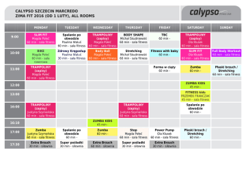 CALYPSO SZCZECIN MARCREDO ZIMA FIT 2016 (OD 1 LUTY), ALL ROOMS 9:00 10:00 11:00 MONDAY TUESDAY WEDNESDAY THURSDAY FRIDAY SATURDAY SLIM FIT Magda Połeć 60 min - sala fitness Spalanie po obwodzie Paulina Waluś 60 min - sala fitness TRAMPOLINY (zapisy) Magda Połeć 60 min - sala fitness BODY SHAPE Michał Skudniewski 60 min - sala fitness TBC 60 min - TRAMPOLINY (zapisy) Ola Kłusek 60 min - sala fitness BIKE Magda Połeć 60 min - sala rowerowa Zdrowy Kręgosłup Paulina Waluś 30 min - sala fitness Body Ball Magda Połeć 60 min - sala fitness Stretching Michał Skudniewski 60 min - sala fitness Fitness with baby 60 min - TRAMPOLINY (zapisy) Magda Połeć 60 min - sala fitness Forma w ciąży 60 min - TRAMPOLINY (zapisy) Justyna Szymańska 60 min - sala fitness TRAMPOLINY (zapisy) Justyna Szymańska 60 min - sala fitness 17:30 Spalanie po obwodzie 60 min - ZUMBA KIDS 45 min - 16:10 17:00 Zumba 60 min - FITNESS kids PRZEMEK FRANCZAK 45 min - sala fitness 13:00 16:00 SLIM FIT Full Body Workout Ola Kłusek 60 min - sala fitness 60 min - sala fitness ZUMBA KIDS 45 min - 12:00 Zumba Justyna Szymańska 60 min - sala fitness Spalanie po obwodzie 60 min - Zumba 60 min - Step Magda Połeć 60 min - sala fitness Power Pump Ola Kłusek 60 min - sala fitness Extra Brzuch 30 min - siłownia Super pośladki 30 min - siłownia Extra Brzuch 60 min - siłownia Super pośladki 30 min - siłownia Extra Brzuch 30 min - siłownia SUNDAY Płaski brzuch / Stretching 60 min - Płaski brzuch / Stretching 60 min - sala fitness 18:00 Pilates / Stretch 60 min BIKE Magda Połeć 60 min - sala rowerowa 18:30 19:00 GREEN FITNESS 60 min - Zumba Justyna Szymańska 60 min - sala fitness TRAMPOLINY (zapisy) 60 min - BIKE 60 min - Super pośladki 30 min - siłownia BIKE Magda Połeć 60 min - sala rowerowa BIKE Ola Kłusek 60 min - sala rowerowa BODY SHAPE 60 min - Pilates / Stretch Magda Połeć 60 min - sala fitness Spalanie po obwodzie Krzysztof Barcz 60 min - sala fitness TRAMPOLINY (zapisy) Krzysztof Barcz 60 min - sala fitness Extra Brzuch 30 min - siłownia Turbo Express 30 min - siłownia Power Pump Ola Kłusek 60 min - sala fitness Zdrowy Kręgosłup Krzysztof Barcz 60 min - sala fitness Płaski brzuch / Stretching Krzysztof Barcz 60 min - sala fitness TRAMPOLINY Zdrowy Kręgosłup (zapisy) Ola Kłusek PAULINA ŁUKOMSKA 60 min - sala fitness 60 min - sala fitness TRAMPOLINY (zapisy) Krzysztof Barcz 60 min - sala fitness BIKE Ola Kłusek 60 min - sala rowerowa 19:30 21:00 Zdrowy Kręgosłup 60 min - Samoobrona dla kobiet DAMIAN SZYNKOWSKI 60 min - sala fitness Super pośladki Krzysztof Barcz 60 min - sala fitness BIKE Magda Połeć 60 min - sala rowerowa BIKE 55 min - 20:00 Zumba Justyna Szymańska 60 min - sala fitness Joga 60 min -