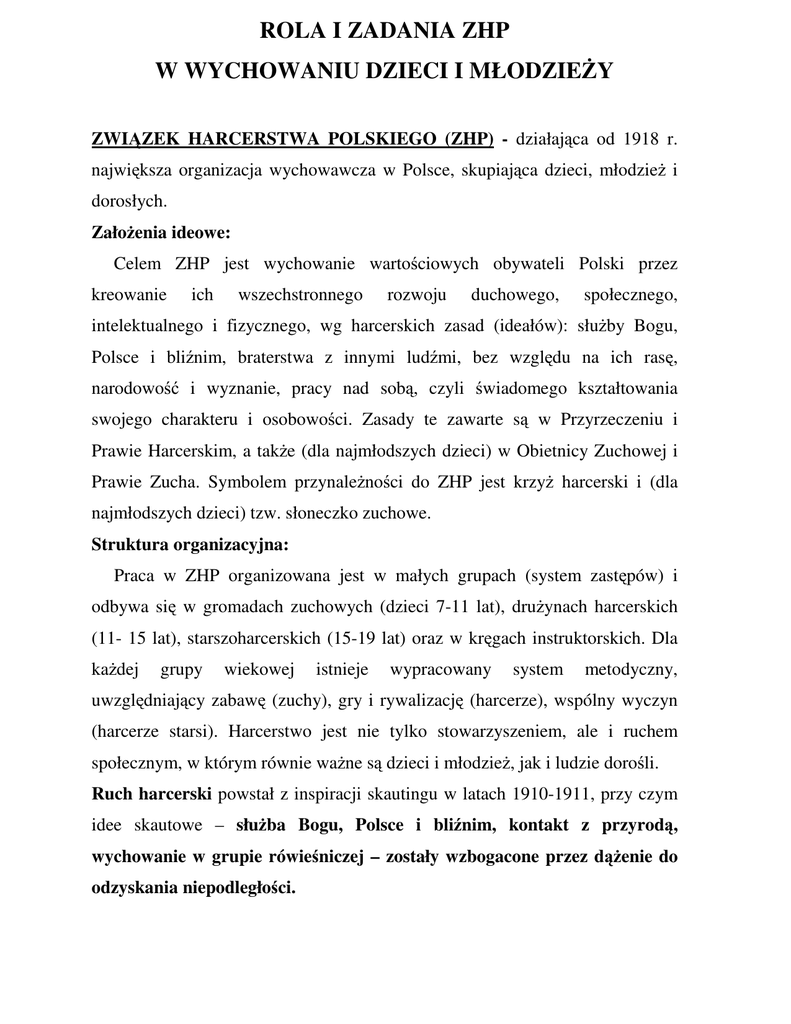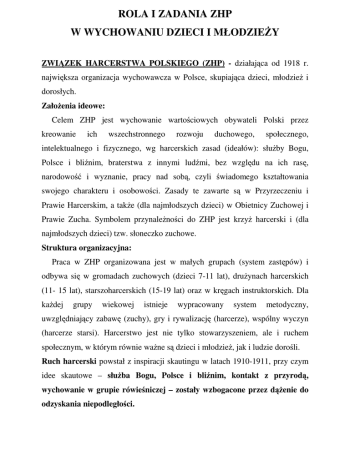 ROLA I ZADANIA ZHP W WYCHOWANIU DZIECI I MŁODZIE Y ZWI ZEK HARCERSTWA POLSKIEGO (ZHP) - działaj ca od 1918 r. najwi ksza organizacja wychowawcza w Polsce, skupiaj ca dzieci, młodzie i dorosłych. Zało enia ideowe: Celem ZHP jest wychowanie warto ciowych obywateli Polski przez kreowanie ich wszechstronnego rozwoju duchowego, społecznego, intelektualnego i fizycznego, wg harcerskich zasad (ideałów): słu by Bogu, Polsce i bli nim, braterstwa z innymi lud mi, bez wzgl du na ich ras , narodowo i wyznanie, pracy nad sob , czyli wiadomego kształtowania swojego charakteru i osobowo ci. Zasady te zawarte s w Przyrzeczeniu i Prawie Harcerskim, a tak e (dla najmłodszych dzieci) w Obietnicy Zuchowej i Prawie Zucha. Symbolem przynale no ci do ZHP jest krzy harcerski i (dla najmłodszych dzieci) tzw. słoneczko zuchowe. Struktura organizacyjna: Praca w ZHP organizowana jest w małych grupach (system zast pów) i odbywa si w gromadach zuchowych (dzieci 7-11 lat), dru ynach harcerskich (11- 15 lat), starszoharcerskich (15-19 lat) oraz w kr gach instruktorskich. Dla ka dej grupy wiekowej istnieje wypracowany system metodyczny, uwzgl dniaj cy zabaw (zuchy), gry i rywalizacj (harcerze), wspólny wyczyn (harcerze starsi). Harcerstwo jest nie tylko stowarzyszeniem, ale i ruchem społecznym, w którym równie wa ne s dzieci i młodzie , jak i ludzie doro li. Ruch harcerski powstał z inspiracji skautingu w latach 1910-1911, przy czym idee skautowe – słu ba Bogu, Polsce i bli nim, kontakt z przyrod , wychowanie w grupie rówie niczej – zostały wzbogacone przez d enie do odzyskania niepodległo ci. Zwi zek Harcerstwa Polskiego to organizacja przede wszystkim wychowawcza, której zadaniem jest wychowanie młodego człowieka. Główne zało enia programu wychowawczego Zwi zku Harcerstwa Polskiego to wychowanie ka dego członka na człowieka: wra liwego na krzywd społeczn , odwa nego i nieust pliwego w walce ze złem, staj cego zawsze w obronie krzywdzonych i prze ladowanych; wiadomie pracuj cego nad własnym charakterem, pot piaj cego egoizm, skromnego, prawdomównego, samodzielnego i zdyscyplinowanego, umiej cego współ y w zespole i podporz dkowa si jego decyzjom, znajduj cego rado w działaniu, pracy i zabawie, my l cego, pogł biaj cego sw wiedz , pod aj cego za post pem nauki i techniki, gotowego ulepsza wiat własnym wysiłkiem. GŁÓWNE ZASADY WYCHOWAWCZE ZHP 1. ZASADA WYCHOWANIA SPOŁECZN . PRZEZ DZIAŁALNO 2. ZASADA ROZWIJANIA W TOKU DZIAŁALNO CI SPOŁECZNEJ AKTYWNO CI I INICJATYWY KA DEGO CZŁONKA ORGANIZACJI, A TAK E JEGO UMIEJ TNO CI YCIA I WSPÓŁRZ DZENIA W ZESPOLE. 3. ZASADA UDZIAŁU W YCIU PODSTAWOWEGO OGNIWA WYCHOWAWCZEGO (DRU YNY) CZŁONKA TEJ SAMEJ ORGANIZACJI, INSTRUKTORA HARCERSKIEGO WYCHOWAWCY. Ad. zasady 1. (Zasada wychowania przez działalno Działalno działalno społeczna - pod tym terminem społeczn ) rozumiana jest wszelka dzieci i młodzie y, która: posiada cel ponadjednostkowy (czyli ma przynie w efekcie jakie dobro dla zespołu, kolegów, rodowiska, społecze stwa), wymaga współpracy w osi gni ciu tego celu. Działalno charakteryzuj ca si obu tymi cechami przynosi w efekcie nie tylko zaspokojenie potrzeb dzieci i młodzie y, ale tak e pewne dobro społeczne w postaci zmian w osobowo ci wychowanka. W toku tak poj tej pracy społecznej chłopiec, czy dziewczyna zdobywa umiej tno : • współdziałania z innymi, • uczy si podporz dkowywa interes własny interesowi zespołu, jeli dobro tego wymaga, • nabywa zdolno ci kierowania innymi i sob , • uczy si ponosi odpowiedzialno za siebie i innych, trudnej sztu- ki zachowywania si w stosunkach nadrz dno ci i podrz dno ci. Działalno harcersk mo na podzieli na zadania i zaj cia. Ró ni si one charakterem uczestnictwa i rol , jak w nich spełniaj harcerze. Zadania harcerze planuj , wykonuj i oceniaj samodzielnie. Zaj cia kto dla nich przygotowuje, a oni bior w nich udział. Gdyby role przy wykonywaniu zada i zaj podzieli na role kierowników - organizatorów, wykonawców i konsumen- tów, to zadanie wi załoby si z rol pierwsz i drug , za zaj cie z trzeci . Ad. zasady 2. (zasada rozwijania inicjatywy i aktywno ci, umiej tno ci ycia w zespole oraz współrz dzenia) Do rozwijania aktywno ci, inicjatywy i samorz dno ci konieczne s odpowiednie warunki i „klimat”. Harcerstwo nawi zuje do potrzeb dzieci (np. u zuchów potrzeba zabawy, ruchu, krzyku), stwarza dzieciom warunki robienia tego, co lubi robi , a to jest podstawow przesłank aktywno ci. U podstaw aktywno ci le jeszcze inne czynniki: wiedza, umiej tno ci, pogl - dy wyniesione z domu i szkoły, stopie rozumienia sensu ró nych społecznych poczyna . Wreszcie uczucia społeczne powinny by kształtowane wcze nie, a w ród nich jedno szczególnie wa ne i w kulturze naszego społecze stwa – uczucie patriotyzmu. W toku aktywnego działania chłopcy i dziewcz ta gromadz pewn sum do wiadcze ro nego rodzaju. To do wiadczenie staje si podstaw i motywem ich inicjatywy. Zgłaszaj projekty i ch uczestnictwa w ich reali- zacji. W harcerstwie stworzone s pewne reguły post powania dzieci i instruktorów. Zaliczamy do nich: 1. Organizacyjne bod ce samowychowania Do bod ców samowychowania zaliczamy: • u zuchów: Prawo Zucha, gwiazdki, sprawno ci zuchowe, • u harcerzy młodszych: Prawo Harcerskie, stopnie, sprawno ci zespołowe i fachowe, • u harcerzy starszych: Prawo Harcerskie, stopnie, sprawno ci fachowe. 2. Struktura organizacji i okre lone przez ni zasady organizowania si do pracy. Struktura organizacji jest drugim, obok bod ców samowychowania, czynnikiem wspieraj cym realizacj zasady rozwijania aktywno ci, inicjatywy, samodzielno ci, umiej tno ci ycia w zespole i samorz dno ci w pracy zespołów harcerskich. Podstawowymi jednostkami organizacyjnymi s dru yny harcerskie, w których koncentruje si podstawowa praca wychowawcza, i kr gi instruktorskie. Ka dy członek organizacji musi nale e do okre lonej jednostki organizacyjnej. Ad. zasady 3. (zasada udziału ins