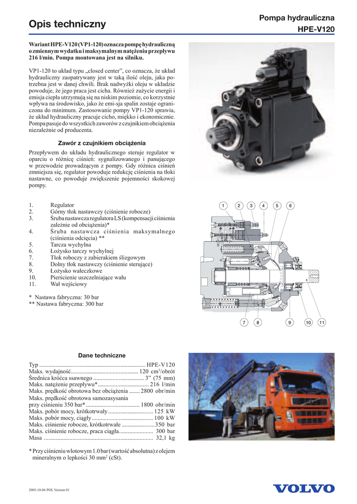 Pompa hydrauliczna HPE-V120 Opis techniczny Wariant HPE-V120 (VP1-120) oznacza pompę hydrauliczną o zmiennym wydatku i maksymalnym natężeniu przepływu 216 l/min. Pompa montowana jest na silniku. VP1-120 to układ typu „closed center”, co oznacza, że układ hydrauliczny zaopatrywany jest w taką ilość oleju, jaka potrzebna jest w danej chwili. Brak nadwyżki oleju w układzie powoduje, że jego praca jest cicha. Również zużycie energii i emisja ciepła utrzymują się na niskim poziomie, co korzystnie wpływa na środowisko, jako że emi-sja spalin zostaje ograniczona do minimum. Zastosowanie pompy VP1-120 sprawia, że układ hydrauliczny pracuje cicho, miękko i ekonomicznie. Pompa pasuje do wszystkich zaworów z czujnikiem obciążenia niezależnie od producenta. Zawór z czujnikiem obciążenia Przepływem do układu hydraulicznego steruje regulator w oparciu o różnicę ciśnień: sygnalizowanego i panującego w przewodzie prowadzącym z pompy. Gdy różnica ciśnień zmniejsza się, regulator powoduje redukcję ciśnienia na tłoki nastawne, co powoduje zwiększenie pojemności skokowej pompy. 1. 2. 3. 4. 5. 6. 7. 8. 9. 10. 11. Regulator Górny tłok nastawczy (ciśnienie robocze) Śruba nastawcza regulatora LS (kompensacji ciśnienia zależnie od obciążenia)* Śruba nastawcza ciśnienia maksymalnego (ciśnienia odcięcia) ** Tarcza wychylna Łożysko tarczy wychylnej Tłok roboczy z zabierakiem ślizgowym Dolny tłok nastawczy (ciśnienie sterujące) Łożysko wałeczkowe Pierścienie uszczelniające wału Wał wejściowy 1 2 3 4 5 6 * Nastawa fabryczna: 30 bar ** Nastawa fabryczna: 300 bar 7 Dane techniczne Typ ....................................................................... HPE-V120 Maks. wydajność............................................. 120 cm3/obrót Średnica króćca ssawnego .................................. 3” (75 mm) Maks. natężenie przepływu* .................................. 216 l/min Maks. prędkość obrotowa bez obciążenia ....... 2800 obr/min Maks. prędkość obrotowa samozasysania przy ciśnieniu 350 bar* .................................... 1800 obr/min Maks. pobór mocy, krótkotrwały .............................. 125 kW Maks. pobór mocy, ciągły ......................................... 100 kW Maks. ciśnienie robocze, krótkotrwałe ......................350 bar Maks. ciśnienie robocze, praca ciągła....................... 300 bar Masa ......................................................................... 32,1 kg * Przy ciśnieniu wlotowym 1.0 bar (wartość absolutna) z olejem mineralnym o lepkości 30 mm2 (cSt). 2005-10-06 POL Version 01 8 9 10 11