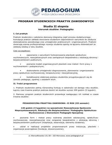 PROGRAM STUDENCKICH PRAKTYK ZAWODOWYCH Studia II stopnia kierunek studiów: Pedagogika I. Cel praktyk Praktyki studenckie z założenia stanowią integralną część procesu dydaktycznego. Koncepcja praktyk zakłada stworzenie studentom odpowiednich warunków do zdobycia doświadczenia zawodowego oraz umiejętności praktycznych i organizacyjnych. Praktyki stwarzają szansę profesjonalnego rozwoju studenta opartą na łączeniu doświadczeń ze zdobytą wiedzą w toku studiów. Cele szczegółowe: • zapoznanie z warunkami funkcjonowania placówek opiekuńczowychowawczych, resocjalizacyjnych oraz zawiązanych bezpośrednio z edukacją obronną i bezpieczeństwem publicznym, • poznanie modeli organizacyjnych placówki oraz metod i form pracy z wychowankami i podopiecznymi, • doskonalenie umiejętności diagnozowania, planowania i organizowania pracy opiekuńczo-wychowawczej, terapeutycznej i resocjalizacyjnej, • kształtowanie właściwej postawy studentów przygotowujących się do zawodu pedagoga, zgodnej z zasadami etyki. II. Treści programowe 1. Praktyki studenckie pełnią różnorodną funkcję w zależności od danego roku studiów. Łączny czas trwania praktyk podczas dwóch lat studiów wynosi 200 godzin (5 tygodni). 2. Ramowy program praktyk studenckich przewiduje następujący ich rozkład w czasie trwania studiów: PEDAGOGICZNA PRAKTYKA ZAWODOWA -II ROK (III semestr) 120 godzin (3 tygodnie) na specjalności Resocjalizacja Społecznie Nieprzystosowanych, Edukacja dla Bezpieczeństwa i Pedagogika OpiekuńczoWychowawcza z Elementami Pedagogiki Specjalnej • poznanie form i metod pracy wybranej placówki edukacyjnej, opiekuńczowychowawczej, resocjalizacyjnej oraz związanej bezpośrednio z edukacją obronną i bezpieczeństwem publicznym (hospitacje, obserwacje, elementy działania); • udział w realizacji projektów proponowanych organizacje pozarządowe (fundacje, stowarzyszenia); przez instytucje, ul. Marszałkowska 115, 00 – 102 Warszawa, www.pedagogium.pl placówki i • poznanie możliwości diagnozowania, opiekuńczo-wychowawczej i resocjalizacyjnej; • planowania i organizowania pracy poznanie dokumentacji placówki/organizacji/instytucji; • uczestnictwo w zadaniach realizowanych przez placówkę/instytucję/organizację pozarządową – twórcze włączenie się w formy pracy z wykorzystaniem wiedzy i umiejętności warsztatowych nabytych w czasie studiów; • samodzielne wykonywanie zadań na rzecz placówki, instytucji lub organizacji, uzgodnionych z opiekunem praktyk – w trakcie praktyki student jest zobowiązany do samodzielnego prowadzenia zajęć w wymiarze co najmniej 1/5 wyznaczonych godzin (25-30) praktyki przy uzyskaniu akceptacji scenariuszy przez bezpośredniego opiekuna praktyk w placówce. PRAKTYKA DYPLOMOWA - II ROK (IV semestr) 80 godzin (dwa tygodnie) na specjalności Resocjalizacja Społecznie Nieprzystosowanych, Edukacja dla Bezpieczeństwa i Pedagogika OpiekuńczoWychowawcza z Elementami Pedagogiki Specjalnej • zaleca się, aby wybór placówki umożliwił zaprojektowanie i przeprowadzenie analiz związanych z problematyką pracy dyplomowej; • w trakcie praktyk wymagana jest ścisła współpraca studenta z kierownictwem placówki czy organizacji, w której realizowana jest praktyka; • w trakcie praktyki dyplomowej student jest zobowiązany do samodzielnego prowadzenia zajęć, nadzorowanych przez opiekuna w placówce, określonych specyfiką placówki przy uzyskaniu akceptacji scenariuszy przez bezpośredniego opiekuna praktyk w placówce; • studenci studiów stacjonarnych realizują praktykę dyplomową w marcu danego roku kalendarzowego (w okresie tym nie odbywają się zajęcia dydaktyczne). ul. Marszałkowska 115, 00 – 102 Warszawa, www.pedagogium.pl