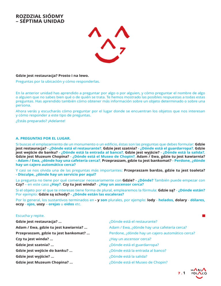 ROZDZIAŁ SIÓDMY – SÉPTIMA UNIDAD Gdzie jest restauracja? Prosto i na lewo. Preguntas por la ubicación y cómo responderlas. En la anterior unidad has aprendido a preguntar por algo o por alguien, y cómo preguntar el nombre de algo o alguien que no sabes bien qué o de quién se trata. Te hemos mostrado las posibles respuestas a todas estas preguntas. Has aprendido también cómo obtener más información sobre un objeto determinado o sobre una persona. Ahora verás y escucharás cómo preguntar por el lugar donde se encuentran los objetos que nos interesan y cómo responder a este tipo de preguntas. ¿Estás preparado? ¡Adelante! A. PREGUNTAS POR EL LUGAR. Si buscas el emplazamiento de un monumento o un edificio, éstas son las preguntas que debes formular: Gdzie jest restauracja? - ¿Dónde está el restaurante?, Gdzie jest szatnia? - ¿Dónde está el guardarropa?, Gdzie jest wejście do banku? - ¿Dónde está la entrada al banco?, Gdzie jest wyjście? - ¿Dónde está la salida?, Gdzie jest Muzeum Chopina? - ¿Dónde está el Museo de Chopin?, Adam / Ewa, gdzie tu jest kawiarnia? - Adam / Ewa, ¿dónde hay una cafetería cerca?, Przepraszam, gdzie tu jest bankomat? - Perdone, ¿dónde hay un cajero automático cerca? Y casi se nos olvida una de las preguntas más importantes: Przepraszam bardzo, gdzie tu jest toaleta? - Disculpe, ¿dónde hay un servicio por aquí? La pregunta no tiene por qué comenzar necesariamente con Gdzie? - ¿Dónde? También puede empezar con Czy? – en este caso ¿Hay?. Czy tu jest winda? - ¿Hay un ascensor cerca? Si el objeto por el que te interesas tiene forma de plural, emplearemos la fórmula: Gdzie są? - ¿Dónde están? Por ejemplo: Gdzie są schody? - ¿Dónde están las escaleras? Por lo general, los sustantivos terminados en - y son plurales, por ejemplo: lody - helados, dolary - dólares, oczy - ojos, uszy – orejas u oidos etc. Escucha y repite. Gdzie jest restauracja? … ¿Dónde está el restaurante? Adam / Ewa, gdzie tu jest kawiarnia? … Adam / Ewa, ¿dónde hay una cafetería cerca? Przepraszam, gdzie tu jest bankomat? … Perdone, ¿dónde hay un cajero automático cerca? Czy tu jest winda? … ¿Hay un ascensor cerca? Gdzie jest szatnia? … ¿Dónde está el guardarropa? Gdzie jest wejście do banku? … ¿Dónde está la entrada al banco? Gdzie jest wyjście? … ¿Dónde está la salida? Gdzie jest Muzeum Chopina? … ¿Dónde está el Museo de Chopin? 7.1 Gdzie są schody? … ¿Dónde están las escaleras? Przepraszam bardzo, gdzie tu jest toaleta? … Disculpe, ¿dónde hay un servicio por aquí? B. RESPUESTAS A LAS PREGUNTAS POR EL LUGAR. A este tipo de preguntas te responderán: Tu., Tutaj. - Aquí., Acá. (cerca) Tam. - Allí. (más lejos), Na lewo. - A la izquierda., Na prawo. - A la derecha., Prosto i na lewo. - De frente y a la izquierda., Na dole. - Abajo., Na górze. - Arriba., Bankomat jest koło recepcji. - El cajero automático está junto a la recepción., Muzeum Chopina jest w centrum. Ulica Tamka. - El Museo de Chopin está en el centro. En la calle Tamka. ¿Os acordáis de las preguntas que empiezan con Czy? – en este caso ¿Hay??. Czy tu jest winda? - ¿Hay un ascensor cerca? Una de las respuestas posibles será: Winda jest za rogiem. - El ascensor está a la vuelta. ¿Y las preguntas en plural, Gdzie są?, Gdzie są schody?? A este tipo de preguntas te podrían contestar: Schody są na końcu korytarza., Schody są tam. Escucha y repite. Tu. Tutaj. (blisko) … Aquí. Acá. (cerca) Tam. (dalej) … Allí. (más lejos) Na lewo. … A la izquierda. Na prawo. … A la derecha. Prosto i na lewo. … De frente y a la izquierda. Na dole. … Abajo. Na górze. … Arriba. Winda jest za rogiem. … El ascensor está a la vuelta. Schody są na końcu korytarza. … Las escaleras están al final del pasillo. Bankomat jest koło recepcji. … El cajero automático está junto a la recepción. Muzeum Chopina jest w centrum. … El Museo de Chopin está en el centro. Ulica Tamka. … En la calle Tamka. Una advertencia gramatical importante: Seguramente has observado que en las últimas oraciones aparecen unas palabras un tanto extrañas: rogiem, końcu, korytarza, recepcji. No te esfuerces en buscarlas en el diccionario porque no están, a pesar de que se usan con frecuencia. En polaco, los sustantivos, adjetivos, pronombres y numerales adoptan terminaciones diferentes según la función que cumplen en la oración, llamada también caso. Decimos que estas palabras se declinan, es decir que su forma varía según el caso. En polaco hay siete casos en singular y siete en plural. En el español antiguo y en el latín –madre de todas las lenguas románicas– existió un procedimiento similar. La gramática polaca resulta pues bastante arcaica en este aspecto. Pero no te preocupes porque es más sencillo de lo que parece. De modo que en el diccionario únicamente están las formas de nominativo, es decir, la que normalmente cumple en la oración la función de sujeto. El nominativo de las palabras rogiem, końcu, korytarza, recepcji es, respectivamente, róg, koniec, korytarz, recepcja. Éstas son las palabras que puedes buscar en el diccionario. En futuras lecciones explicaremos la declinación con más detalle. 7.2 C. DIÁLOGO. Escucha atentamente. Adam: Ewa, co to jest? Ewa: To? Adam: Tak. Ewa: Hotel. Adam: A co to za hotel? Ewa: Hotel Victoria. Adam: A czy to jest bank? Ewa: Nie. To nie jest bank. To muzeum. Ahora escucha y repite. Ewa, co to jest? … To? … Tak. … Hotel. … A co to za hotel? … Hotel Victoria. … A czy to jest bank? … Nie. To nie jest bank. To muzeum. … D. EJERCICIO. Di las preguntas que correspondan a las siguientes respuestas. Szatnia jest na dole. … Przepraszam, gdzie jest szatnia? Toaleta jest końcu korytarza. … Przepraszam bardzo, gdzie jest toaleta? Tak, to jest bank. … Czy to jest bank? To jest lekarka. … Kto to jest? To jest szkoła. … Co to jest? To jest kino Kultu