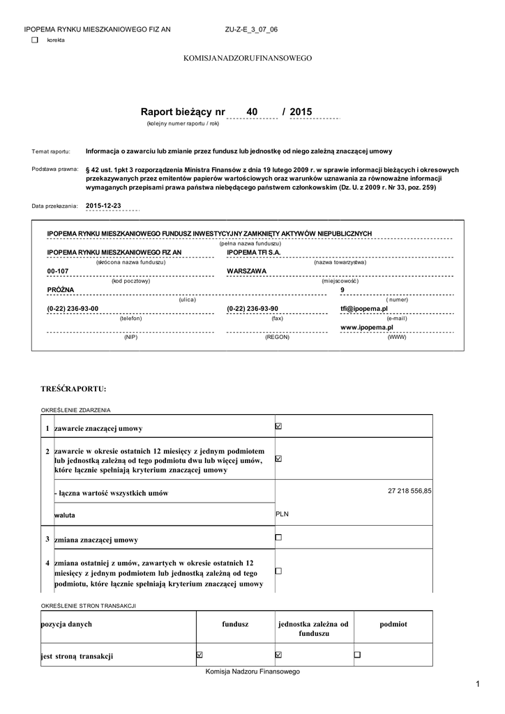 IPOPEMA RYNKU MIESZKANIOWEGO FIZ AN ZU-Z-E_3_07_06 korekta KOMISJA NADZORU FINANSOWEGO Raport bieżący nr 40 / 2015 (kolejny numer raportu / rok) Temat raportu: Informacja o zawarciu lub zmianie przez fundusz lub jednostkę od niego zależną znaczącej umowy Podstawa prawna: § 42 ust. 1pkt 3 rozporządzenia Ministra Finansów z dnia 19 lutego 2009 r. w sprawie informacji bieżących i okresowych przekazywanych przez emitentów papierów wartościowych oraz warunków uznawania za równoważne informacji wymaganych przepisami prawa państwa niebędącego państwem członkowskim (Dz. U. z 2009 r. Nr 33, poz. 259) Data przekazania: 2015-12-23 IPOPEMA RYNKU MIESZKANIOWEGO FUNDUSZ INWESTYCYJNY ZAMKNIĘTY AKTYWÓW NIEPUBLICZNYCH (pełna nazwa funduszu) IPOPEMA RYNKU MIESZKANIOWEGO FIZ AN IPOPEMA TFI S.A. (skróc ona nazwa funduszu) (nazwa towarzystwa) 00-107 WARSZAWA (kod poc ztowy) (miejscowość) PRÓŻNA 9 (ulica) (0-22) 236-93-00 ( numer) (0-22) 236-93-90 (telefon) [email protected] (fax) (e-mail) www.ipopema.pl (NIP) (REGON) (WWW) TREŚĆRAPORTU: OKREŚLENIE ZDARZENIA 1 zawarcie znaczącej umowy 2 zawarcie w okresie ostatnich 12 miesięcy z jednym podmiotem lub jednostką zależną od tego podmiotu dwu lub więcej umów, które łącznie spełniają kryterium znaczącej umowy 27 218 556,85 - łączna wartość wszystkich umów PLN waluta 3 zmiana znaczącej umowy 4 zmiana ostatniej z umów, zawartych w okresie ostatnich 12 miesięcy z jednym podmiotem lub jednostką zależną od tego podmiotu, które łącznie spełniają kryterium znaczącej umowy OKREŚLENIE STRON TRANSAKCJI pozycja danych fundusz jednostka zależna od funduszu podmiot jest stroną transakcji Komisja Nadzoru Finansowego 1 IPOPEMA RYNKU MIESZKANIOWEGO FIZ AN ZU-Z-E_3_07_06 SPV Support 3 Spółka z ograniczoną odpowiedzialnością spółka komandytowo – akcyjna nazwa podmiotu Warszawa siedziba podmiotu SZCZEGÓŁY UMOWY data zawarcia lub zmiany umowy przedmiot umowy istotne warunki umowy, ze szczególnym uwzględnieniem warunków finansowych umowy 2015-12-23 Przedmiotem raportu jest umowa dotycząca weksla własnego zupełnego wystawionego przez SPV Support 3 Spółka z ograniczoną odpowiedzialnością spółka komandytowo – akcyjna 1. Wartość nominalna weksla wynosi 10 583 461,18 zł. Weksel jest oprocentowany 6% w skali roku płatne przy wykupie weksla (odsetki na wekslu będą liczone wg formuły Act\360). Weksel będzie przedstawiony do zaznaczenia wizy nie później niż 31 grudnia 2016 r. 2.Fundusz przyjmie od SPV Support 3 Spółki z ograniczoną odpowiedzialnością spółka komandytowo – akcyjna ("Wystawca") Weksel w zamian za wydanie na rzecz Wystawcy weksla wystawionego przez Wystawcę w dniu 30 listopada 2015 roku na kwotę 11.290.074,56 zł („Weksel rolowany”) oraz częściową spłatę w kwocie 749.892,00 zł (słownie: siedemset czterdzieści dziewięć tysięcy osiemset dziewięćdziesiąt dwa złote 00/100) dokonaną w dniu 23 grudnia 2015 roku. 3. Wydanie Weksla rolowanego przez Fundusz w zamian za Weksel nastąpi do dnia 31 grudnia 2015 r. określone przez strony specyficzne warunki, charakterystyczne dla tej umowy, w Umowa nie zawiera specyficznych warunków. szczególności te, które odbiegają od warunków powszechnie stosowanych dla danego typu umów umowa zawiera postanowienia dotyczące kar umownych - zapłata kar umownych wyłącza uprawnienia do dochodzenia roszczeń odszkodowawczych przekraczających wysokość tych kar umowa zawiera zastrzeżenie warunku umowa zawiera zastrzeżenie terminu kryterium uznania umowy za znaczącą umowę Zgodnie z § 2 ust. 1 pkt 44) oraz § 2 ust. 2 Rozporządzenia Ministra Finansów z dnia 19 lutego 2009 r. w sprawie informacji bieżących i okresowych przekazywanych przez emitentów papierów wartościowych oraz warunków uznawania za równoważne informacji wymaganych przepisami prawa państwa niebędącego państwem członkowskim (Dz. U. 2014 r. poz. 133), Jednostka zależna zawarła znaczącą umowę w rozumieniu ww. rozporządzenia, ponieważ łączna wartość wszystkich umów zawartych w okresie krótszym niż 12 miesięcy z Funduszem i podmiotami zależnymi od Funduszu spełnia kryteria, o których mowa w § 2 ust. 1 pkt 44 ww. rozporządzenia. Fundusz zawarł w okresie 12 miesięc y z SPV Support 3 Spółka z ogranic zoną odpowiedzialnośc ią spółka komandytowo – akc yjna umowy dotyczące papierów wartośc iowych na łączną kwotę 27 218 556,85 zł, które łącznie spełniają kryterium znaczącej umowy. Istotne warunki poprzedniej umowy zawartej między SPV Support 3 Spółka z ograniczoną odpowiedzialnością spółka komandytowo – akcyjna a Funduszem bądź jednostkami zależnymi od Funduszu: 1) datę zawarc ia lub zmiany znaczącej umowy: 2015-11-30 2) oznac zenie stron umowy; ”SPV SUPPORT 3 spółka z ogranic zoną odpowiedzialnością Spółka komandytowo-akcyjna” z siedzibą w Warszawie (adres: 00-107 Warszawa, ulica Próżna nr 9, REGON: 141963976, NIP: 5272609781), wpisanej do Rejestru Przedsiębiorc ów, prowadzonego przez Sąd Rejonowy dla m.st. Warszawy, XII Wydział Gospodarc zy Krajowego Rejestru Sądowego, pod numerem KRS 0000335190, Komisja Nadzoru Finansowego 2 IPOPEMA RYNKU MIESZKANIOWEGO FIZ AN ZU-Z-E_3_07_06 XII Wydział Gospodarc zy Krajowego Rejestru Sądowego, pod numerem KRS 0000335190, „IPOPEMA RYNKU MIESZKANIOWEGO FUNDUSZ INWESTYCYJNY ZAMKNIĘTY AKTYWÓW NIEPUBLICZNYCH” 3) oznac zenie przedmiotu umowy; Przedmiotem raportu była umowa dotyc ząc a weksla własnego zupełnego wystawionego przez SPV Support 3 Spółka z ograniczoną odpowiedzialnością spółka komandytowo – akcyjna 4) istotne warunki umowy, ze szczególnym uwzględnieniem warunków finansowych umowy, oraz wskazanie określonych przez strony specyficznych warunków, c harakterystyc znyc h dla tej umowy, w szczególności tych, które odbiegają od warunków powszechnie stosowanych dla danego typu umów; Wartość nominalna 