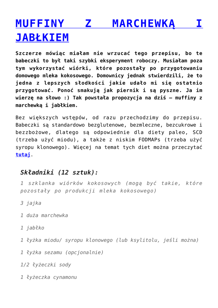 MUFFINY JABŁKIEM Z MARCHEWKĄ I Szczerze mówiąc miałam nie wrzucać tego przepisu, bo te babeczki to był taki szybki eksperyment roboczy. Musiałam poza tym wykorzystać wiórki, które pozostały po przygotowaniu domowego mleka kokosowego. Domownicy jednak stwierdzili, że to jedna z lepszych słodkości jakie udało mi się ostatnio przygotować. Ponoć smakują jak piernik i są pyszne. Ja im wierzę na słowo :) Tak powstała propozycja na dziś – muffiny z marchewką i jabłkiem. Bez większych wstępów, od razu przechodzimy do przepisu. Babeczki są standardowo bezglutenowe, bezmleczne, bezcukrowe i bezzbożowe, dlatego są odpowiednie dla diety paleo, SCD (trzeba użyć miodu), a także z niskim FODMAPs (trzeba użyć syropu klonowego). Więcej na temat tych diet można przeczytać tutaj. Składniki (12 sztuk): 1 szklanka wiórków kokosowych (mogą być takie, które pozostały po produkcji mleka kokosowego) 3 jajka 1 duża marchewka 1 jabłko 1 łyżka miodu/ syropu klonowego (lub ksylitolu, jeśli można) 1 łyżka sezamu (opcjonalnie) 1/2 łyżeczki sody 1 łyżeczka cynamonu ekstrakt wanilii Przygotowanie Marchew i jabłko umyć, obrać (w jabłku także usunąć gniazdo nasienne), a następnie zetrzeć na tarce o grubych oczkach. Wiórki zmielić w młynku lub blenderem odrobinę, ale nie na mąkę. Wymieszać wszystkie składniki mikserem. Ciasto przełożyć silikonowych). do foremek na muffiny (ja używam Piec w 180 st.C przez 20-25 minut. Najlepiej wyjmować muffiny jak przestygną. Będą wtedy bardziej zwarte i łatwiej odstaną od foremek. Te muffiny z marchewką i jabłkiem są dobrą propozycją na II śniadanie w pracy lub jako przekąska na wynos, ponieważ nie kruszą się, łatwo je zatem przewieźć i zjeść na uboczu, kiedy nie mamy zbytnio czasu na spokojny posiłek przy stole. Przechowywać w lodówce. Z powodzeniem nadmiar można zamrozić na później. Ze względu na to, że są to muffiny wysokobłonnikowe (przez obecność wiórków), należy pamiętać o odpowiedniej ilości płynów (minimum 2 litry dziennie). Smacznego! :)
