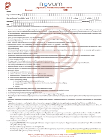 Abonent: Załącznik nr 3. Oświadczenie sprzedaży telefonu Umowa nr:_______________/____________/MOB/______________ Imię i nazwisko/Nazwa firmy* Adres zameldowania / Adres siedziby* (ulica) Miejscowość nr domu nr lokalu kod pocztowy - PESEL Oświadczam, że w przed zawarciem Umowy z Novum S.A. otrzymałem/am wszystkie wymienione poniżej informacje: • Novum S.A. z siedzibą w Warszawie, przy ulicy Racławickiej 146, wpisana do rejestru przedsiębiorców prowadzonego przez Sąd Rejonowy dla M. st. Warszawy w Warszawie, XII Wydział Gospodarczy Krajowego Rejestru Sądowego pod numerem KRS 0000368094, NIP 9491924705, Regon 152185875, o kapitale zakładowym 29 408 671 zł w pełni opłaconym, wykonująca działalność telekomunikacyjną na podstawie wpisu do rejestru przedsiębiorców telekomunikacyjnych pod numerem 9324 prowadzonego przez Prezesa Urzędu Komunikacji Elektronicznej jest firmą telekomunikacyjną konkurencyjną wobec Orange Polska i innych dostawców usług telekomunikacyjnych • Novum S.A. dostarczy urządzenie w terminie 30 dni od daty zawarcia umowy; • Novum S.A. stosuje procedurę reklamacyjną w zakresie zgłoszeń związanych z uprawnieniami wynikającymi z rękojmi, zgodnie z którą: 1. Abonent może złożyć reklamację: a) ustnie – osobiście do protokołu w Biurze Obsługi Klienta przy ul. Przemysłowej 1, 07-411 Rzekuń albo telefonicznie pod numerem telefonu 0 801 048 048, b) w formie pisemnej - osobiście w Biurze Obsługi Klienta albo przesyłką pocztową na adres Novum S.A., ul. Przemysłowa 1, 07-411 Rzekuń, 2. Uprawnienia wynikające z rękojmi wygasają z upływem 2 lat od daty wydania urządzenia. Roszczenie o usunięcie wady lub wymianę rzeczy sprzedanej na wolną od wad przedawnia się z upływem roku, licząc od dnia stwierdzenia wady. 3. Jeżeli konsument zażąda wymiany rzeczy lub usunięcia wady albo złożył oświadczenie o obniżeniu ceny, określając kwotę, o którą cena ma być obniżona, a Novum S.A. nie ustosunkuje się do tego żądania w terminie czternastu dni, uważa się, że żądanie to uznał za uzasadnione. • Novum S.A. zobowiązana jest do dostarczenia urządzenia bez wad; • W ramach usług posprzedażnych Novum S.A. udziela informacji dotyczących urządzenia, przyjmuje reklamacje, udziela informacji odnośnie obsługi urządzenia oraz dokonuje konserwacji i napraw; • Producent urządzenia udziela gwarancji począwszy od daty zakupu przez pierwszego użytkownika końcowego na następujących warunkach: a. 24 miesiące na urządzenie (telefon), b. 6 miesięcy na części i akcesoria ulegające zużyciu, np. baterię, ładowarkę czy zestaw słuchawkowy, c. usterki urządzenia ujawnione w okresie gwarancyjnym będą bezpłatnie usuwane w terminie 14 dni roboczych od daty dostarczenia urządzenia do autoryzowanego serwisu Producenta . d. okres gwarancji ulega przedłużeniu o czas, jaki produkt spędzi w serwisie, e. warunkiem wykonania naprawy jest dostarczenie produktu z prawidłowo wypełnioną kartą gwarancyjną, dowodem zakupu i opisem usterki, f. wykonywanie napraw, w tym ingerencję w oprogramowanie przez osoby nieupoważnione jest podstawą do odmowy naprawy w ramach gwarancji, g. gwarancja nie obejmuje: a) normalnego zużycia, w tym baterii (akumulatorów), b) uszkodzeń mechanicznych, termicznych, chemicznych i wywołanych nimi wadami, c) problemów związanych ze współpracą sprzętu z urządzeniami i akcesoriami innych producentów , d) czynności związanych z konfiguracją i obsługą urządzenia opisanych w instrukcji obsługi, e) uszkodzeń i wad powstałych na skutek: i. niewłaściwego lub niezgodnego z instrukcją obsługi użytkowania, ii. przepięć w sieci energetycznej lub telefonicznej, wyładowań atmosferycznych, nieprawidłowego napięcia zasilającego, iii. zamoczenia cieczą, iv. transportu. h. Szczegółowe warunki gwarancji w tym adres serwisu Producenta znajdują sie w Karcie Gwarancyjnej. i. decyzję o ewentualnej wymianie sprzętu lub zwrocie gotówki podejmuje autoryzowany serwis lub sprzedawca po konsultacji z serwisem, j. niewłaściwie lub nieczytelnie wypełniona karta gwarancyjna jest nieważna, k. naruszenie plomb, uszkodzenie numerów seryjnych urządzenia unieważnia zawartą umowę gwarancyjną na zakupiony sprzęt, l. Producent nie ponosi odpowiedzialności za utratę oprogramowania lub danych przechowywanych w urządzeniu podczas naprawy sprzętu. Zaleca się regularne wykonywanie kopii bezpieczeństwa oprogramowania i danych, m.gwarancja nie nadaje kupującemu prawa do domagania się zwrotu utraconych zysków związanych z uszkodzeniem urządzenia oraz strat związanych z utratą danych na dysku twardym oraz innych nośnikach danych. • w przypadku zwrotu urządzenia w ramach odstąpienia od Umowy Konsument zobowiązany jest ponieść jego koszty. Koszt wysyłki urządzenia w przypadku Poczty Polskiej S.A. wynosi 8,30 zł brutto; • Konsument może dochodzić roszczeń w postępowaniu mediacyjnym, prowadzonym przez Prezesa UKE lub przed stałym polubownym sądem konsumenckim przy Prezesie UKE, o których mowa w art. 109 i art. 110 Prawa Telekomunikacyjnego; w celu skorzystania z tych procedur należy zgłosić się ze stosownym wnioskiem do Prezesa UKE; • Otrzymałem/am wszystkie elementy wyposażenia urządzenia oraz sporządzone w języku polskim instrukcje obsługi i konserwacji. Ponadto oświadczam, że przed zawarciem umowy zostałem poinformowany w sposób rzetelny, jasny i zrozumiały o: • prawie do odstąpienia od Umowy zawartej poza lokalem przedsiębiorstwa/na odległość, bez podawania przyczyn i bez ponoszenia kosztów, z wyjątkiem kosztów określonych w art. 33, art. 34 ust. 2 i art. 35 w ustawie z dnia 30 maja 2014 r. o prawach konsumenta (Dz. U. z 2014 r. poz. 827) , w terminie 14 (czternastu) dni od dnia wydania urządzenia oraz otrzymałem wzór oświadczenia o odstąpieniu; • skutkach rozwiązania Umowy- o świadczenie usług telek