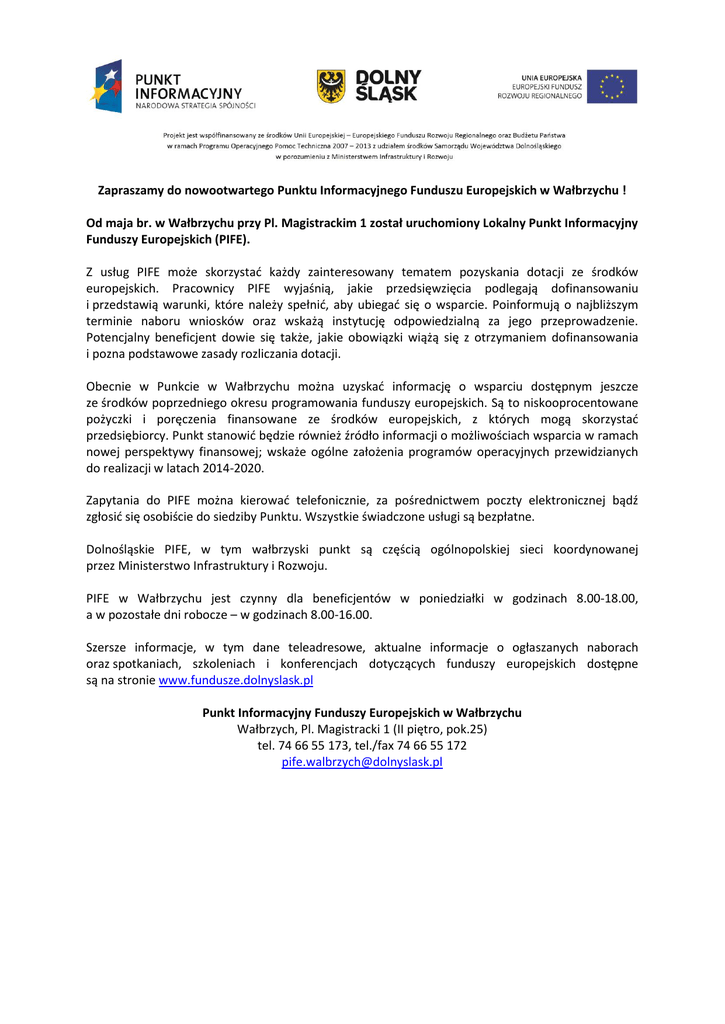 Zapraszamy do nowootwartego Punktu Informacyjnego Funduszu Europejskich w Wałbrzychu ! Od maja br. w Wałbrzychu przy Pl. Magistrackim 1 został uruchomiony Lokalny Punkt Informacyjny Funduszy Europejskich (PIFE). Z usług PIFE może skorzystać każdy zainteresowany tematem pozyskania dotacji ze środków europejskich. Pracownicy PIFE wyjaśnią, jakie przedsięwzięcia podlegają dofinansowaniu i przedstawią warunki, które należy spełnić, aby ubiegać się o wsparcie. Poinformują o najbliższym terminie naboru wniosków oraz wskażą instytucję odpowiedzialną za jego przeprowadzenie. Potencjalny beneficjent dowie się także, jakie obowiązki wiążą się z otrzymaniem dofinansowania i pozna podstawowe zasady rozliczania dotacji. Obecnie w Punkcie w Wałbrzychu można uzyskać informację o wsparciu dostępnym jeszcze ze środków poprzedniego okresu programowania funduszy europejskich. Są to niskooprocentowane pożyczki i poręczenia finansowane ze środków europejskich, z których mogą skorzystać przedsiębiorcy. Punkt stanowić będzie również źródło informacji o możliwościach wsparcia w ramach nowej perspektywy finansowej; wskaże ogólne założenia programów operacyjnych przewidzianych do realizacji w latach 2014-2020. Zapytania do PIFE można kierować telefonicznie, za pośrednictwem poczty elektronicznej bądź zgłosić się osobiście do siedziby Punktu. Wszystkie świadczone usługi są bezpłatne. Dolnośląskie PIFE, w tym wałbrzyski punkt są częścią ogólnopolskiej sieci koordynowanej przez Ministerstwo Infrastruktury i Rozwoju. PIFE w Wałbrzychu jest czynny dla beneficjentów w poniedziałki w godzinach 8.00-18.00, a w pozostałe dni robocze – w godzinach 8.00-16.00. Szersze informacje, w tym dane teleadresowe, aktualne informacje o ogłaszanych naborach oraz spotkaniach, szkoleniach i konferencjach dotyczących funduszy europejskich dostępne są na stronie www.fundusze.dolnyslask.pl Punkt Informacyjny Funduszy Europejskich w Wałbrzychu Wałbrzych, Pl. Magistracki 1 (II piętro, pok.25) tel. 74 66 55 173, tel./fax 74 66 55 172 [email protected]