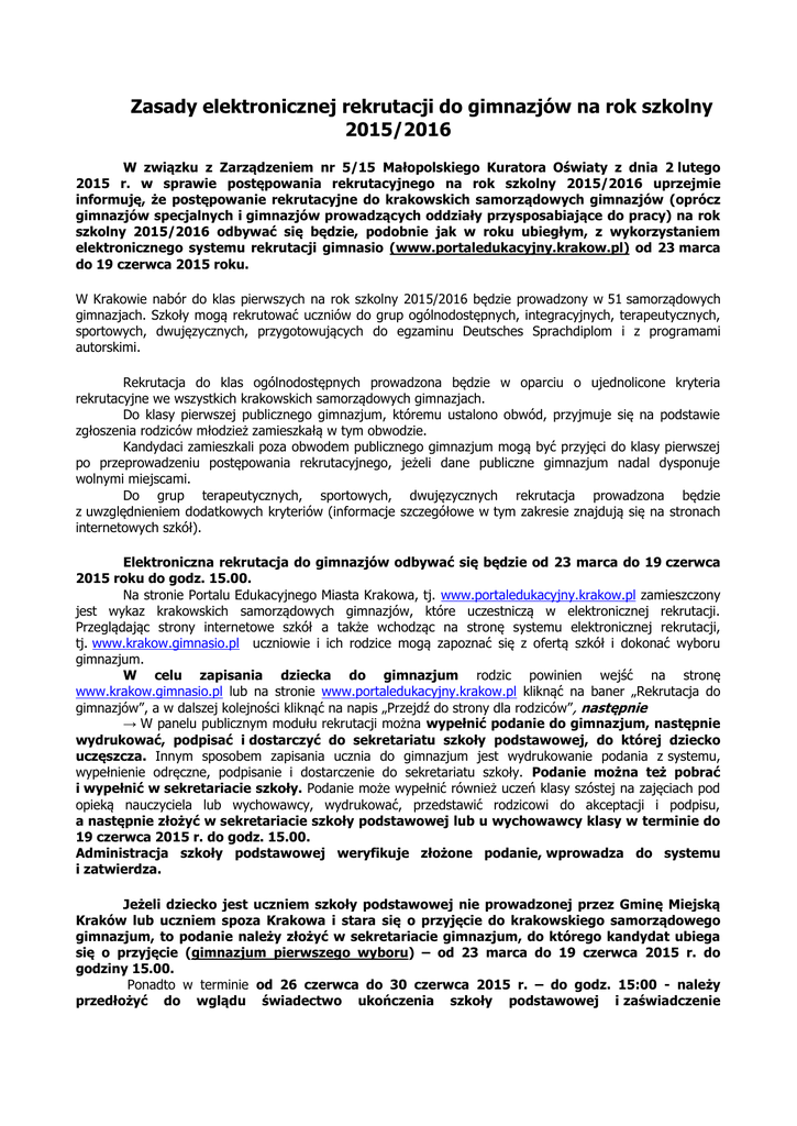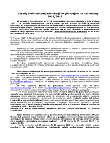 Zasady elektronicznej rekrutacji do gimnazjów na rok szkolny 2015/2016 W związku z Zarządzeniem nr 5/15 Małopolskiego Kuratora Oświaty z dnia 2 lutego 2015 r. w sprawie postępowania rekrutacyjnego na rok szkolny 2015/2016 uprzejmie informuję, że postępowanie rekrutacyjne do krakowskich samorządowych gimnazjów (oprócz gimnazjów specjalnych i gimnazjów prowadzących oddziały przysposabiające do pracy) na rok szkolny 2015/2016 odbywać się będzie, podobnie jak w roku ubiegłym, z wykorzystaniem elektronicznego systemu rekrutacji gimnasio (www.portaledukacyjny.krakow.pl) od 23 marca do 19 czerwca 2015 roku. W Krakowie nabór do klas pierwszych na rok szkolny 2015/2016 będzie prowadzony w 51 samorządowych gimnazjach. Szkoły mogą rekrutować uczniów do grup ogólnodostępnych, integracyjnych, terapeutycznych, sportowych, dwujęzycznych, przygotowujących do egzaminu Deutsches Sprachdiplom i z programami autorskimi. Rekrutacja do klas ogólnodostępnych prowadzona będzie w oparciu o ujednolicone kryteria rekrutacyjne we wszystkich krakowskich samorządowych gimnazjach. Do klasy pierwszej publicznego gimnazjum, któremu ustalono obwód, przyjmuje się na podstawie zgłoszenia rodziców młodzież zamieszkałą w tym obwodzie. Kandydaci zamieszkali poza obwodem publicznego gimnazjum mogą być przyjęci do klasy pierwszej po przeprowadzeniu postępowania rekrutacyjnego, jeżeli dane publiczne gimnazjum nadal dysponuje wolnymi miejscami. Do grup terapeutycznych, sportowych, dwujęzycznych rekrutacja prowadzona będzie z uwzględnieniem dodatkowych kryteriów (informacje szczegółowe w tym zakresie znajdują się na stronach internetowych szkół). Elektroniczna rekrutacja do gimnazjów odbywać się będzie od 23 marca do 19 czerwca 2015 roku do godz. 15.00. Na stronie Portalu Edukacyjnego Miasta Krakowa, tj. www.portaledukacyjny.krakow.pl zamieszczony jest wykaz krakowskich samorządowych gimnazjów, które uczestniczą w elektronicznej rekrutacji. Przeglądając strony internetowe szkół a także wchodząc na stronę systemu elektronicznej rekrutacji, tj. www.krakow.gimnasio.pl uczniowie i ich rodzice mogą zapoznać się z ofertą szkół i dokonać wyboru gimnazjum. W celu zapisania dziecka do gimnazjum rodzic powinien wejść na stronę www.krakow.gimnasio.pl lub na stronie www.portaledukacyjny.krakow.pl kliknąć na baner „Rekrutacja do gimnazjów”, a w dalszej kolejności kliknąć na napis „Przejdź do strony dla rodziców”, następnie → W panelu publicznym modułu rekrutacji można wypełnić podanie do gimnazjum, następnie wydrukować, podpisać i dostarczyć do sekretariatu szkoły podstawowej, do której dziecko uczęszcza. Innym sposobem zapisania ucznia do gimnazjum jest wydrukowanie podania z systemu, wypełnienie odręczne, podpisanie i dostarczenie do sekretariatu szkoły. Podanie można też pobrać i wypełnić w sekretariacie szkoły. Podanie może wypełnić również uczeń klasy szóstej na zajęciach pod opieką nauczyciela lub wychowawcy, wydrukować, przedstawić rodzicowi do akceptacji i podpisu, a następnie złożyć w sekretariacie szkoły podstawowej lub u wychowawcy klasy w terminie do 19 czerwca 2015 r. do godz. 15.00. Administracja szkoły podstawowej weryfikuje złożone podanie, wprowadza do systemu i zatwierdza. Jeżeli dziecko jest uczniem szkoły podstawowej nie prowadzonej przez Gminę Miejską Kraków lub uczniem spoza Krakowa i stara się o przyjęcie do krakowskiego samorządowego gimnazjum, to podanie należy złożyć w sekretariacie gimnazjum, do którego kandydat ubiega się o przyjęcie (gimnazjum pierwszego wyboru) – od 23 marca do 19 czerwca 2015 r. do godziny 15.00. Ponadto w terminie od 26 czerwca do 30 czerwca 2015 r. – do godz. 15:00 - należy przedłożyć do wglądu świadectwo ukończenia szkoły podstawowej i zaświadczenie o szczegółowych wynikach ze sprawdzianu w klasie szóstej w celu wprowadzenia danych do systemu. Obowiązek wprowadzenia danych należy do administracji gimnazjum. Do oddziałów integracyjnych, na wniosek rodziców (prawnych opiekunów), przyjmowani są: 1) na podstawie skierowania uczniowie posiadający orzeczenie o potrzebie kształcenia specjalnego (3-5 uczniów w oddziale liczącym nie więcej niż 20 uczniów) wydanego przez zespół orzekający działający w publicznej poradni psychologiczno-pedagogicznej, w tym publicznej poradni specjalistycznej. Uczniów zamieszkałych na terenie Gminy Miejskiej Kraków do odpowiedniej szkoły kieruje Wydział Edukacji UMK. Przy wskazywaniu szkoły bierze się pod uwagę odległość miejsca zamieszkania ucznia od szkoły. Dla uczniów zamieszkałych poza Gminą Miejską Kraków skierowanie wydaje również Wydział Edukacji UMK, w miarę wolnych miejsc (obowiązek zapewnienia odpowiedniej formy kształcenia dla dziecka posiadającego orzeczenie o potrzebie kształcenia specjalnego ciąży na jednostce samorządu terytorialnego właściwej ze względu na miejsce zamieszkania dziecka). 2) uczniowie nieposiadający orzeczenia o potrzebie kształcenia specjalnego (15-17 uczniów w oddziale liczącym nie więcej niż 20 uczniów) na takich samych zasadach jak do oddziału ogólnodostępnego. Kandydat do gimnazjum, które objęte jest systemem rekrutacji elektronicznej, ma możliwość dokonania wyboru dowolnej liczby szkół (wskazuje się kolejność wybranych gimnazjów w porządku od najbardziej do najmniej preferowanych szkół). Na ostatniej pozycji kandydat powinien zaznaczyć w szkole obwodowej grupę rekrutacyjną, która ma zaznaczone kryterium obwodowości. Postępowanie takie zapewni – w razie niezakwalifikowania się do wcześniej wskazanych grup – miejsce w szkole obwodowej. W przypadku, gdy kandydat zostanie zakwalifikowany do szkoły innej niż szkoła obwodowa będzie można prowadzić na to miejsce rekrutację dla innych uczniów. Kandydat, który jako pierwsze wybiera gimnazjum obwodowe (tj. w gimnazjum obwodowym gru