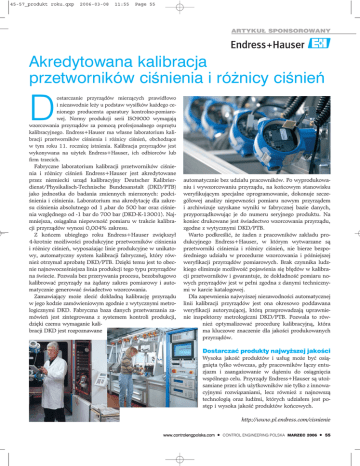 45-57_produkt roku.qxp 2006-03-08 11:55 Page 55 ARTYKU£ SPONSOROWANY Akredytowana kalibracja przetworników ciśnienia i różnicy ciśnień D ostarczanie przyrządów mierzących prawidłowo i niezawodnie leży u podstaw wysiłków każdego cenionego producenta aparatury kontrolno-pomiarowej. Normy produkcji serii ISO9000 wymagają wzorcowania przyrządów za pomocą profesjonalnego osprzętu kalibracyjnego. Endress+Hauser ma własne laboratorium kalibracji przetworników ciśnienia i różnicy ciśnień, obchodzące w tym roku 11. rocznicę istnienia. Kalibracja przyrządów jest wykonywana na użytek Endress+Hauser, ich odbiorców lub firm trzecich. Fabryczne laboratorium kalibracji przetworników ciśnienia i różnicy ciśnień Endress+Hauser jest akredytowane przez niemiecki urząd kalibracyjny Deutscher Kalibrierdienst/Physikalisch-Technische Bundesanstalt (DKD/PTB) jako jednostka do badania zmiennych mierzonych: podciśnienia i ciśnienia. Laboratorium ma akredytację dla zakresu ciśnienia absolutnego od 1 µbar do 500 bar oraz ciśnienia względnego od -1 bar do 700 bar (DKD-K-13001). Najmniejsza, osiągalna niepewność pomiaru w trakcie kalibracji przyrządów wynosi 0,004% zakresu. Z końcem ubiegłego roku Endress+Hauser zwiększył 4-krotnie możliwości produkcyjne przetworników ciśnienia i różnicy ciśnień, wyposażając linie produkcyjne w unikatowy, automatyczny system kalibracji fabrycznej, który również otrzymał aprobatę DKD/PTB. Dzięki temu jest to obecnie najnowocześniejsza linia produkcji tego typu przyrządów na świecie. Pozwala bez przerywania procesu, bezobsługowo kalibrować przyrządy na żądany zakres pomiarowy i automatycznie generować świadectwo wzorcowania. Zamawiający może zlecić dokładną kalibrację przyrządu w jego kodzie zamówieniowym zgodnie z wytycznymi metrologicznymi DKD. Fabryczna baza danych przetwarzania zamówień jest zintegrowana z systemem kontroli produkcji, dzięki czemu wymaganie kalibracji DKD jest rozpoznawane automatycznie bez udziału pracowników. Po wyprodukowaniu i wywzorcowaniu przyrządu, na końcowym stanowisku weryfikującym specjalne oprogramowanie, dokonuje szczegółowej analizy niepewności pomiaru nowym przyrządem i archiwizuje uzyskane wyniki w fabrycznej bazie danych, przyporządkowując je do numeru seryjnego produktu. Na koniec drukowane jest świadectwo wzorcowania przyrządu, zgodne z wytycznymi DKD/PTB. Warto podkreślić, że żaden z pracowników zakładu produkcyjnego Endress+Hauser, w którym wytwarzane są przetworniki ciśnienia i różnicy ciśnień, nie bierze bezpośredniego udziału w procedurze wzorcowania i późniejszej weryfikacji przyrządów pomiarowych. Brak czynnika ludzkiego eliminuje możliwość pojawienia się błędów w kalibracji przetworników i gwarantuje, że dokładność pomiaru nowych przyrządów jest w pełni zgodna z danymi technicznymi w karcie katalogowej. Dla zapewnienia najwyższej niezawodności automatycznej linii kalibracji przyrządów jest ona okresowo poddawana weryfikacji autoryzującej, którą przeprowadzają uprawnienie inspektorzy metrologiczni DKD/PTB. Pozwala to również optymalizować procedurę kalibracyjną, która ma kluczowe znaczenie dla jakości produkowanych przyrządów. Dostarczać produkty najwyższej jakości Wysoka jakość produktów i usług może być osiągnięta tylko wówczas, gdy pracowników łączy entuzjazm i zaangażowanie w dążeniu do osiągnięcia wspólnego celu. Przyrządy Endress+Hauser są utożsamiane przez ich użytkowników nie tylko z innowacyjnymi rozwiązaniami, lecz również z najnowszą technologią oraz ludźmi, których udziałem jest postęp i wysoka jakość produktów końcowych. http://www.pl.endress.com/cisnienie www.controlengpolska.com l CONTROL ENGINEERING POLSKA MARZEC 2006 l 55