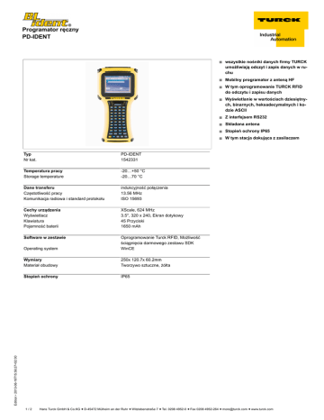 Programator ręczny PD-IDENT ■ ■ ■ ■ PD-IDENT 1542331 Temperatura pracy Storage temperature -20…+50 °C -20…70 °C Dane transferu Częstotliwość pracy Komunikacja radiowa i standard protokołu indukcyjność połączenia 13.56 MHz ISO 15693 Cechy urządzenia Wyświetlacz Klawiatura Pojemność baterii XScale, 624 MHz 3.5'', 320 x 240, Ekran dotykowy 45 Przyciski 1650 mAh Software w zestawie Operating system Oprogramowanie Turck RFID, Możliwość ściągnięcia darmowego zestawu SDK WinCE Wymiary Materiał obudowy 250x 120.7x 60.2mm Tworzywo sztuczne, żółta Stopień ochrony IP65 Mobilny programator z anteną HF W tym oprogramowanie TURCK RFID do odczytu i zapisu danych Wyświetlanie w wartościach dziesiętnych, binarnych, heksadecymalnych i kodzie ASCII ■ Z interfejsem RS232 ■ Składana antena ■ Stopień ochrony IP65 ■ W tym stacja dokująca z zasilaczem Edition • 2013-06-18T15:56:27+02:00 Typ Nr kat. wszystkie nośniki danych firmy TURCK umożliwiają odczyt i zapis danych w ruchu 1/2 Hans Turck GmbH & Co.KG ñ D-45472 Mülheim an der Ruhr ñ Witzlebenstraße 7 ñ Tel. 0208 4952-0 ñ Fax 0208 4952-264 ñ [email protected] ñ www.turck.com Programator ręczny PD-IDENT Akcesoria montażowe Nr kat. PD-IDENT-PF 1542336 folia ochronna (25 szt.) Wymiary PD-IDENT-DS 1542333 stacja bazowa, zawiera zasilacz, przewód RS232 PD-IDENT-RB 1542337 zamienna bateria PD-IDENT-BC 1542335 ładowarka baterii PD-IDENT-RS 1542338 zamienne piny (25 szt.) PD-IDENT-CB 1542334 futerał Edition • 2013-06-18T15:56:27+02:00 Typ 2/2 Hans Turck GmbH & Co.KG ñ D-45472 Mülheim an der Ruhr ñ Witzlebenstraße 7 ñ Tel. 0208 4952-0 ñ Fax 0208 4952-264 ñ [email protected] ñ www.turck.com