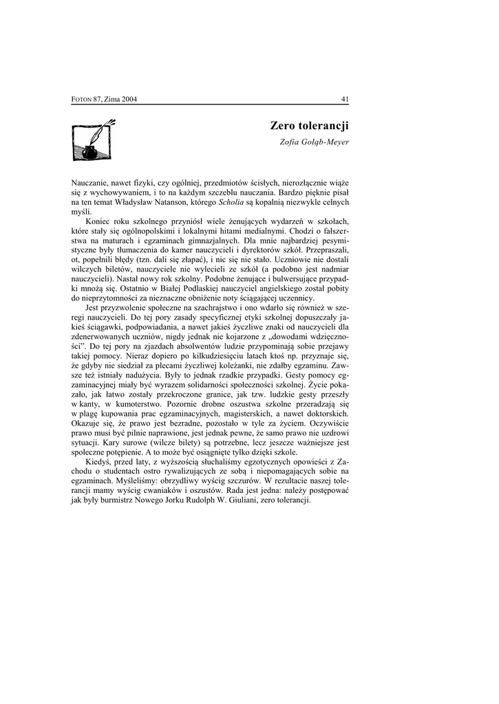 FOTON 87, Zima 2004 41 Zero tolerancji Zofia Gołąb-Meyer Nauczanie, nawet fizyki, czy ogólniej, przedmiotów ścisłych, nierozłącznie wiąże się z wychowywaniem, i to na każdym szczeblu nauczania. Bardzo pięknie pisał na ten temat Władysław Natanson, którego Scholia są kopalnią niezwykle celnych myśli. Koniec roku szkolnego przyniósł wiele żenujących wydarzeń w szkołach, które stały się ogólnopolskimi i lokalnymi hitami medialnymi. Chodzi o fałszerstwa na maturach i egzaminach gimnazjalnych. Dla mnie najbardziej pesymistyczne były tłumaczenia do kamer nauczycieli i dyrektorów szkół. Przepraszali, ot, popełnili błędy (tzn. dali się złapać), i nic się nie stało. Uczniowie nie dostali wilczych biletów, nauczyciele nie wylecieli ze szkół (a podobno jest nadmiar nauczycieli). Nastał nowy rok szkolny. Podobne żenujące i bulwersujące przypadki mnożą się. Ostatnio w Białej Podlaskiej nauczyciel angielskiego został pobity do nieprzytomności za nieznaczne obniżenie noty ściągającej uczennicy. Jest przyzwolenie społeczne na szachrajstwo i ono wdarło się również w szeregi nauczycieli. Do tej pory zasady specyficznej etyki szkolnej dopuszczały jakieś ściągawki, podpowiadania, a nawet jakieś życzliwe znaki od nauczycieli dla zdenerwowanych uczniów, nigdy jednak nie kojarzone z „dowodami wdzięczności”. Do tej pory na zjazdach absolwentów ludzie przypominają sobie przejawy takiej pomocy. Nieraz dopiero po kilkudziesięciu latach ktoś np. przyznaje się, że gdyby nie siedział za plecami życzliwej koleżanki, nie zdałby egzaminu. Zawsze też istniały nadużycia. Były to jednak rzadkie przypadki. Gesty pomocy egzaminacyjnej miały być wyrazem solidarności społeczności szkolnej. Życie pokazało, jak łatwo zostały przekroczone granice, jak tzw. ludzkie gesty przeszły w kanty, w kumoterstwo. Pozornie drobne oszustwa szkolne przeradzają się w plagę kupowania prac egzaminacyjnych, magisterskich, a nawet doktorskich. Okazuje się, że prawo jest bezradne, pozostało w tyle za życiem. Oczywiście prawo musi być pilnie naprawione, jest jednak pewne, że samo prawo nie uzdrowi sytuacji. Kary surowe (wilcze bilety) są potrzebne, lecz jeszcze ważniejsze jest społeczne potępienie. A to może być osiągnięte tylko dzięki szkole. Kiedyś, przed laty, z wyższością słuchaliśmy egzotycznych opowieści z Zachodu o studentach ostro rywalizujących ze sobą i niepomagających sobie na egzaminach. Myśleliśmy: obrzydliwy wyścig szczurów. W rezultacie naszej tolerancji mamy wyścig cwaniaków i oszustów. Rada jest jedna: należy postępować jak były burmistrz Nowego Jorku Rudolph W. Giuliani, zero tolerancji. 42 FOTON 87, Zima 2004 Nie chodzi o to, by nauczyciel był policjantem, lecz o to, by były jasne reguły gry i by były one przestrzegane z żelazną konsekwencją. By kary za oszustwa, nawet drobne, były wysokie. Instynkty i nawyki solidarnościowe, umiejętności kolektywnej pracy można osiągać i premiować w inny sposób, choćby przez nagradzanie tych, którzy jawnie pomagają innym, np. jeśli paru uczniów potrafi zrobić zadanie, to powinni się z tym podzielić z innymi. W dobrze ustawionym systemie nagród (ocen) można nawet element rywalizacji, tak przecież potrzebny, wykorzystać do kształcenia nawyków solidarności. Przecież macie Państwo na to swoje metody. Klasówka, sprawdzian, egzamin ma się odbywać uczciwie. Mamy obowiązek tak je przeprowadzać, by nie kusić uczniów, okazja bowiem czyni złodzieja. Ponadto należy bardzo sprawiedliwie przyznawać oceny. Poczucie krzywdy prowokuje do oszukiwania. Jeśli chcemy wymagać od uczniów absolutnej uczciwości na klasówkach, egzaminach, na maturze musimy zadbać, by zadania na nich były „uczciwe”. Uczciwe to znaczy poprawne merytorycznie, sprawdzające to, czego się uczniowie uczyli w szkole, zgodnie z podstawą programową, przyjazne uczniowi, a nie przygotowane pod kątem wygody poprawiających te zadania. Wszyscy musimy wymusić na MENiS, by te zadania były takie. Wobec spełnienia powszechności nauczania nauczyciel ze swoim kagankiem ma docierać do wszystkich uczniów. Fizyka jest jednym z bardziej demokratycznych przedmiotów, w tym sensie, że wyniki osiągane przez uczniów mało zależą od wpływu domu, a znacznie więcej od zdolności i pracowitości ucznia oraz od szkoły, do której uczęszcza. To na lekcjach fizyki uczniowie z każdego środowiska mogą się wykazać i wybić, mieć sukcesy i w konsekwencji dobrze urządzić się w życiu, wyrwać się z kręgu biedy i bezrobocia. Wyrwać uczciwie. Internet to wspaniałe narzędzie, lecz też uczy łatwizny. Uczniowie przepisują gotowe teksty bezkrytycznie, nawet ich nie czytając. Forma często przerasta treść. Trzeba być czujnym, by nagradzać wysiłek i efekty pracy uczniów, a z drugiej strony, by nie dać się naiwnie nabrać na formę. Kolejna sprawa, na którą mamy wpływ, to lekceważący stosunek uczniów i rodziców do obecności w szkole. Wyjazd na narty, imieniny wujka są ważniejsze od szkoły. I wszyscy to akceptują. Jest to nie do pomyślenia w innych krajach, np. w Szwajcarii czy Niemczech. Dotyczy to uczniów od najmłodszych klas; tam jest po prostu obowiązek szkolny. Uczeń jednak nie może mieć poczucia, że marnuje w szkole czas. Nie powinny się zdarzać sytuacje, w których uczeń zmaga się cały tydzień z zadaniem, a potem nikt o nie nie zapyta. Nie powinny przepadać lekcje z błahych powodów. Młodzież i dzieci mamy wspaniałe, a w miarę dorastania stają się do nas podobni. Powinniśmy być dla nich mistrzami, również pod względem etycznym.