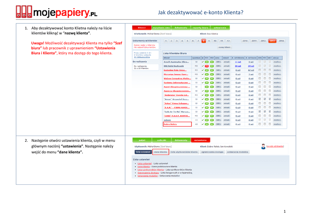 Jak dezaktywować e-konto Klienta? 1. Aby dezaktywować konto Klietna należy na liście klientów kliknąć w “nazwę klienta”. Uwaga! Możliwość dezaktywacji Klienta ma tylko “Szef biura” lub pracownik z uprawnieniem “Ustawienia Biura i Klienta”, który ma dostęp do tego klienta. 2. Następnie otwórz ustawienia klienta, czyli w menu głównym naciśnij “ustawienia”. Następnie należy wejść do menu “dane klienta”. 1 3. Na dole okna naciśnij “dezaktywuj” 2