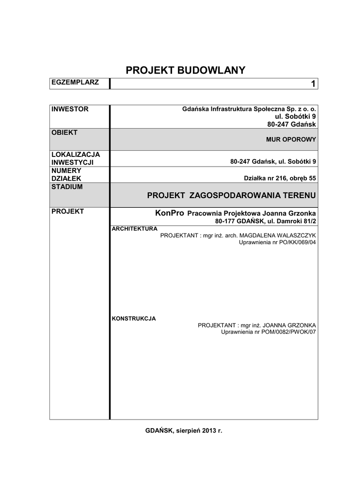 PROJEKT BUDOWLANY EGZEMPLARZ 1 Gdańska Infrastruktura Społeczna Sp. z o. o. INWESTOR ul. Sobótki 9 80-247 Gdańsk OBIEKT MUR OPOROWY LOKALIZACJA INWESTYCJI NUMERY DZIAŁEK STADIUM 80-247 Gdańsk, ul. Sobótki 9 Działka nr 216, obręb 55 PROJEKT ZAGOSPODAROWANIA TERENU PROJEKT KonPro Pracownia Projektowa Joanna Grzonka 80-177 GDAŃSK, ul. Damroki 81/2 ARCHITEKTURA PROJEKTANT : mgr inż. arch. MAGDALENA WALASZCZYK Uprawnienia nr PO/KK/069/04 KONSTRUKCJA PROJEKTANT : mgr inż. JOANNA GRZONKA Uprawnienia nr POM/0082/PWOK/07 GDAŃSK, sierpień 2013 r. PROJEKT BUDOWLANY ZAWARTOŚĆ OPRACOWANIA: 1 Dokumenty formalno-prawne Oświadczenie projektantów Kserokopie zaświadczeń przynależności do Pomorskiej Izby Architektów i Inżynierów Kserokopie uprawnień projektantów Mapa do celów projektowych 2 Projekt zagospodarowania terenu Opis techniczny Część rysunkowa ARCHITEKTURA A-1 Projekt zagospodarowania terenu 3 skala 1:500 Projekt konstrukcyjny muru oporowego Opis techniczny Część rysunkowa KONSTRUKCJA K-1 Mur oporowy – sytuacja K-2 Mur oporowy – rzut i widok K-3 Mur oporowy – przekrój A-A K-4 Mur oporowy – przekrój A-A 4 skala 1:250 skala 1:100 skala 1:33 skala 1:33 INFORMACJA BIOZ _____________________________________________________________________________________________ 2 Projekt muru oporowego przy budynku użytkowym w Gdańsku, ul. Sobótki 9, 80-247 Gdańsk PROJEKT BUDOWLANY SPIS TREŚCI ZAWARTOŚĆ OPRACOWANIA: ................................................................................................................................ 2 SPIS TREŚCI .................................................................................................................................................................... 3 1. DANE OGÓLNE: .......................................................................................................................................................... 4 1.1. Podstawa opracowania................................................................................................................................................. 4 1.2. Inwestor ........................................................................................................................................................................ 4 1.3. Jednostka projektowa ................................................................................................................................................... 4 1.4. Dane do opracowania ................................................................................................................................................... 4 1.5. Cel i zakres opracowania.............................................................................................................................................. 4 2. OPIS TECHNICZNY DO PROJEKTU ZAGOSPODAROWANIA TERENU ............................................................................... 5 2.1. Stan prawny .................................................................................................................................................................. 5 2.2. Opis lokalizacji ............................................................................................................................................................. 5 2.3. Opis zieleni – bez zmian................................................................................................................................................ 5 2.4. Opis projektowanego terenu zagospodarowania .......................................................................................................... 5 2.5. Dojazd i dojścia do budynków – bez zmian .................................................................................................................. 5 2.6. Uzbrojenie terenu – bez zmian ...................................................................................................................................... 5 2.7. Ogólne wymiary muru, dane liczbowe i odległość od granic ...................................................................................... 6 2.8. Dane liczbowe budynku (dane inwestora) – bez zmian................................................................................................. 6 2.9. Rzędne projektowanego terenu ..................................................................................................................................... 6 2.10. Bilans terenu i dane urbanistyczne ............................................................................................................................. 6 2.11. Zieleń i mała architektura – bez zmian ....................................................................................................................... 6 2.12. Dojazd i dojścia do budynków – bez zmian ................................................................................................................ 6 2.13. Właściwości ekologiczne obiektu ................................................................................................................................ 7 2.14. Ochrona środowiska ................................................................................................................................................... 7 2.15. Charakterystyka ekologiczna budynku........................................................................................................................ 7 3. ZAKRES ROBÓT NA TERENIE .................................................................................................................................... 7 4. BEZPIECZEŃSTWO POŻAROWE ...................................................................................................................................... 7 5. CHARAKTERYSTYKA EKOLOGICZNA ............................................................................................................... 7 6. UWAGI KOŃCOWE.