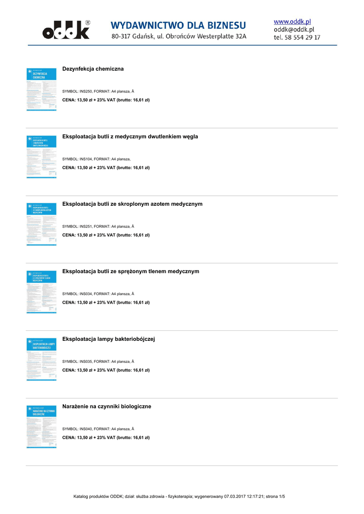 Dezynfekcja chemiczna SYMBOL: INS250, FORMAT: A4 plansza, Â CENA: 13,50 zł + 23% VAT (brutto: 16,61 zł) Eksploatacja butli z medycznym dwutlenkiem węgla SYMBOL: INS104, FORMAT: A4 plansza, CENA: 13,50 zł + 23% VAT (brutto: 16,61 zł) Eksploatacja butli ze skroplonym azotem medycznym SYMBOL: INS251, FORMAT: A4 plansza, Â CENA: 13,50 zł + 23% VAT (brutto: 16,61 zł) Eksploatacja butli ze sprężonym tlenem medycznym SYMBOL: INS034, FORMAT: A4 plansza, Â CENA: 13,50 zł + 23% VAT (brutto: 16,61 zł) Eksploatacja lampy bakteriobójczej SYMBOL: INS035, FORMAT: A4 plansza, Â CENA: 13,50 zł + 23% VAT (brutto: 16,61 zł) Narażenie na czynniki biologiczne SYMBOL: INS040, FORMAT: A4 plansza, Â CENA: 13,50 zł + 23% VAT (brutto: 16,61 zł) Katalog produktów ODDK; dział: służba zdrowia - fizykoterapia; wygenerowany 07.03.2017 12:17:21; strona 1/5 Obsługa aparatów diadynamic DD5A i STYMAT (S-100, S-120, S-200, S-300) SYMBOL: INS099, FORMAT: A4 plansza, CENA: 13,50 zł + 23% VAT (brutto: 16,61 zł) Obsługa aparatów DIAMAT G-110 i TERAPULS GS-200 SYMBOL: INS097, FORMAT: A4 plansza, CENA: 13,50 zł + 23% VAT (brutto: 16,61 zł) Obsługa aparatu ALPHATRON 4100 przy stosowaniu pola magnetycznego SYMBOL: INS098, FORMAT: A4 plansza, CENA: 13,50 zł + 23% VAT (brutto: 16,61 zł) Obsługa aparatu biostymulacyjnego laserowego SYMBOL: INS100, FORMAT: A4 plansza, CENA: 13,50 zł + 23% VAT (brutto: 16,61 zł) Obsługa aparatu inhalacyjnego SYMBOL: INS249, FORMAT: A4 plansza, Â CENA: 13,50 zł + 23% VAT (brutto: 16,61 zł) Obsługa aparatu kriostymulacyjnego bezciśnieniowego SYMBOL: INS235, FORMAT: A4 plansza, CENA: 13,50 zł + 23% VAT (brutto: 16,61 zł) Katalog produktów ODDK; dział: służba zdrowia - fizykoterapia; wygenerowany 07.03.2017 12:17:21; strona 2/5 Obsługa aparatu LASER IR 904-30 i lasera z aparatem ALPHATRON SYMBOL: INS252, FORMAT: A4 plansza, Â CENA: 13,50 zł + 23% VAT (brutto: 16,61 zł) Obsługa aparatu terapeutycznego ultradźwiękowego SYMBOL: INS101, FORMAT: A4 plansza, Â CENA: 13,50 zł + 23% VAT (brutto: 16,61 zł) Obsługa kotła do podgrzewania parafiny dla celów leczniczych SYMBOL: INS355, FORMAT: A4 plansza CENA: 13,50 zł + 23% VAT (brutto: 16,61 zł) Obsługa lamp SOLLUX i EMITA SYMBOL: INS234, FORMAT: A4 plansza, CENA: 13,50 zł + 23% VAT (brutto: 16,61 zł) Obsługa sterylizatorów parowych (autoklawów) SYMBOL: INS327, FORMAT: A4 plansza CENA: 13,50 zł + 23% VAT (brutto: 16,61 zł) Obsługa urządzeń do leczniczych kąpieli wirowych SYMBOL: INS253, FORMAT: A4 plansza, Â CENA: 13,50 zł + 23% VAT (brutto: 16,61 zł) Katalog produktów ODDK; dział: służba zdrowia - fizykoterapia; wygenerowany 07.03.2017 12:17:21; strona 3/5 Personel medyczny SYMBOL: INS043, FORMAT: A3 plansza, Â CENA: 13,50 zł + 23% VAT (brutto: 16,61 zł) Postępowanie w razie skażenia chemicznego dla stacji pogotowia ratunkowego i straży pożarnej (zestaw trzech zafoliowanych tablic z graficznym przedstawieniem procedur postępowania) Cena obejmuje pakiet 3 instrukcji: Ogólne zasady postępowania w przypadku katastrof chemicznych chemicznych - segregacja (triage), dekontaminacja Ogólne zasady postępowania w przypadku ostrych zatruć Ogólne zasady postępowania w przypadku katastrof SYMBOL: INS231/3, FORMAT: 3 plansze A4, CENA: 45,00 zł + 23% VAT (brutto: 55,35 zł) Praca przy biurku protetycznym (stół dla techników dentystycznych) SYMBOL: INS248, FORMAT: A4 plansza, Â CENA: 13,50 zł + 23% VAT (brutto: 16,61 zł) Praca z substancją chemiczną - formaliną SYMBOL: INS333, FORMAT: A4 plansza CENA: 13,50 zł + 23% VAT (brutto: 16,61 zł) Pracownia stomatologiczna SYMBOL: INS299, FORMAT: A4 plansza, Â CENA: 13,50 zł + 23% VAT (brutto: 16,61 zł) Transport i przechowywanie butli ze sprężonym tlenem medycznym SYMBOL: INS015, FORMAT: A3 plansza, Â CENA: 13,50 zł + 23% VAT (brutto: 16,61 zł) Katalog produktów ODDK; dział: służba zdrowia - fizykoterapia; wygenerowany 07.03.2017 12:17:21; strona 4/5 Wykonywanie masażu ręcznego SYMBOL: INS233, FORMAT: A4 plansza, CENA: 13,50 zł + 23% VAT (brutto: 16,61 zł) Katalog produktów ODDK; dział: służba zdrowia - fizykoterapia; wygenerowany 07.03.2017 12:17:21; strona 5/5