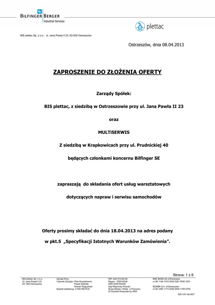 BIS plettac Sp. z o.o. ul. Jana Pawła II 23, 63-500 Ostrzeszów Ostrzeszów, dnia 08.04.2013 ZAPROSZENIE DO ZŁOŻENIA OFERTY Zarządy Spółek: BIS plettac, z siedzibą w Ostrzeszowie przy ul. Jana Pawła II 23 oraz MULTiSERWIS Z siedzibą w Krapkowicach przy ul. Prudnickiej 40 będących członkami koncernu Bilfinger SE zapraszają do składania ofert usług warsztatowych dotyczących napraw i serwisu samochodów Oferty prosimy składać do dnia 18.04.2013 na adres podany w pkt.5 „Specyfikacji Istotnych Warunków Zamówienia”. Strona: 1 z 6 BIS plettac Sp. z o.o. Ul. Jana Pawła II 23 63- 500 Ostrzeszów Zarząd firmy: Członek Zarządu: Piotr Kraszkiewicz Paweł Zieliński Roman Rogoziński Kapitał zakładowy: 4 000 000 PLN NIP: 622-010-84-06 Regon: 250016326 KRS 0000162330 Sąd Rejonowy Poznań Nowe Miasto i Wilda w Poznaniu IX Wydział Gospodarczy KRS BRE BANK SA o/Warszawa nr 68 1140 1010 0000 5281 0500 1001 BZWBK S.A. o/Ostrzeszów nr 82 1090 1173 0000 0000 1700 5794 BIS V/01.00.06/7 BIS plettac Sp. z o.o. ul. Jana Pawła II 23, 63-500 Ostrzeszów Ostrzeszów, dnia 08.04.2013 SPECYFIKACJA ISTOTNYCH WARUNKÓW ZAMÓWIENIA na usługi napraw samochodów osobowych oraz dostawczych marek Ranault i Citroen Strona: 2 z 6 BIS plettac Sp. z o.o. Ul. Jana Pawła II 23 63- 500 Ostrzeszów Zarząd firmy: Członek Zarządu: Piotr Kraszkiewicz Paweł Zieliński Roman Rogoziński Kapitał zakładowy: 4 000 000 PLN NIP: 622-010-84-06 Regon: 250016326 KRS 0000162330 Sąd Rejonowy Poznań Nowe Miasto i Wilda w Poznaniu IX Wydział Gospodarczy KRS BRE BANK SA o/Warszawa nr 68 1140 1010 0000 5281 0500 1001 BZWBK S.A. o/Ostrzeszów nr 82 1090 1173 0000 0000 1700 5794 BIS V/01.00.06/7 BIS plettac Sp. z o.o. ul. Jana Pawła II 23, 63-500 Ostrzeszów 1. ZAMAWIAJĄCY: BIS plettac Sp. z o.o., ul. Jana Pawła II 23, 63-500 Ostrzeszów MULTiSERWIS Sp. z o.o., ul. Prudnicka 40, 47-300 Krapkowice 2. PRZEDMIOT ZAMÓWIENIA: Usługa napraw pojazdów osobowych i dostawczych marek Renault Trafic, Citroen Jumper i Citroen Berlingo w asortymencie i ilościach podanych w ofercie, stanowiących własność BIS plettac i MULTiSERWIS. 3. TRYB UDZIELENIA ZAMÓWIENIA: Postępowanie prowadzone będzie w trybie wyboru ofertowego 4. OPIS I PARAMETRY ZAMÓWIENIA: 4.1 Samochody podlegające naprawom : Zadanie nr: Ilość posiadanych Samochodów przez obie spółki: Opis zadania: 1 Renault Trafic 2.0 DCI 39 2 Citroen Jumper 2.2HDI 23 3 Citroen Berlingo III 1,6 HDI 60 Strona: 3 z 6 BIS plettac Sp. z o.o. Ul. Jana Pawła II 23 63- 500 Ostrzeszów Zarząd firmy: Członek Zarządu: Piotr Kraszkiewicz Paweł Zieliński Roman Rogoziński Kapitał zakładowy: 4 000 000 PLN NIP: 622-010-84-06 Regon: 250016326 KRS 0000162330 Sąd Rejonowy Poznań Nowe Miasto i Wilda w Poznaniu IX Wydział Gospodarczy KRS BRE BANK SA o/Warszawa nr 68 1140 1010 0000 5281 0500 1001 BZWBK S.A. o/Ostrzeszów nr 82 1090 1173 0000 0000 1700 5794 BIS V/01.00.06/7 BIS plettac Sp. z o.o. ul. Jana Pawła II 23, 63-500 Ostrzeszów 4.2 Warunki realizacji zamówienia; - Każda naprawa powinna być przeprowadzona zgodnie z zasadami wiedzy i sztuki technicznej. Celem naprawy jest przywrócenie naprawianemu pojazdowi parametrów technicznych i użytkowych. - BIS plettac i MULTiSERWIS zlecać będą wykonanie określonych usług warsztatowych składając zamówienia w formie pisemnej – drogą elektroniczną, faxem, listownie. - W zamówieniu określony zostanie przedmiot usługi, wymagania dotyczące jej realizacji, dane kontaktowe osoby zamawiającej oraz dane niezbędne do wystawienia faktury. - Materiały eksploatacyjne użyte w czasie naprawy muszą być zgodne z zaleceniem producenta pojazdu. Preferowani producenci części zostali wyszczególnieni w Formularzu oferty stanowiącym Załącznik nr1 do SIWZ - Nowe części Wykonawca zakupi na własny koszt. Uszkodzone części i podzespoły nie podlegają zwrotowi. - Wykonawca zobowiązuje się do udzielenia gwarancji na wykonane przez siebie usługi, której długość określi przy składaniu oferty - Wymagana jest należyta staranność przy realizacji zobowiązań wynikających z umowy - Nie dopuszcza się zmian konstrukcyjnych pojazdów oraz ich podzespołów i układów. - Naprawy będą dokonywane w siedzibie Wykonawcy 5. MIEJSCE ORAZ TERMIN SKŁADANIA OFERT: Oferty prosimy składać w formie mailowej do dnia 18.04.2013 pod adresem mailowym [email protected] Osoba do kontaktu: Krzysztof Niżnik tel. 604 250 612 Strona: 4 z 6 BIS plettac Sp. z o.o. Ul. Jana Pawła II 23 63- 500 Ostrzeszów Zarząd firmy: Członek Zarządu: Piotr Kraszkiewicz Paweł Zieliński Roman Rogoziński Kapitał zakładowy: 4 000 000 PLN NIP: 622-010-84-06 Regon: 250016326 KRS 0000162330 Sąd Rejonowy Poznań Nowe Miasto i Wilda w Poznaniu IX Wydział Gospodarczy KRS BRE BANK SA o/Warszawa nr 68 1140 1010 0000 5281 0500 1001 BZWBK S.A. o/Ostrzeszów nr 82 1090 1173 0000 0000 1700 5794 BIS V/01.00.06/7 BIS plettac Sp. z o.o. ul. Jana Pawła II 23, 63-500 Ostrzeszów 6. KRYTERIA ORAZ SPOSÓB OCENY OFERT: 6.1 Zamawiający zastrzega sobie prawo swobodnego wyboru oferty. 6.2 Składającemu ofertę nie przysługują żadne roszczenia wobec BIS plettac oraz MULTiSERWIS z tytułu przygotowania i złożenia oferty. 6.3 O wyborze oferty decydować będzie: - najniższa cena - szybkość realizacji zlecenia - długość udzielonej gwarancji 7. WARUNKI UDZIAŁU W POSTĘPOWANIU: Do oferty należy dołączyć wypełniony Formularz oferty stanowiący Załącznik nr1 do SIWZ. Zawiera on tabelę z podziałem na modele samochodów oraz dokładnie wyszczególnione czynności warsztatowe z uwzględnieniem cen za materiał oraz robociznę. Oferta musi zawierać deklarację długości okresu gwarancyjnego na wykonaną usługę. 8. WARUNKI OGÓLNE: 8.1 Czas trwania zamówienia – Wykonawca będzie związany złożoną ofertą cenową przez 12 miesięcy od podpisania umowy 8.2 Za wykonaną usługę Wykonawca zobowiązuje się po każdym zleceniu wystawiać