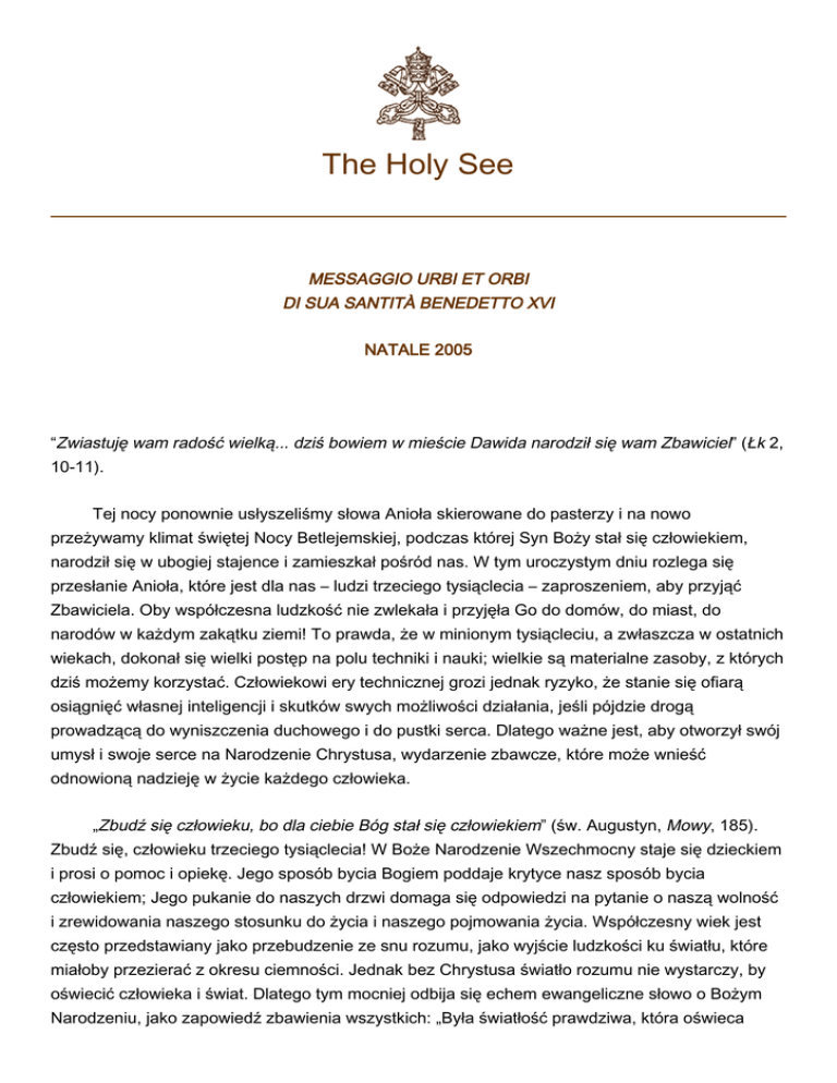 The Holy See MESSAGGIO URBI ET ORBI DI SUA SANTITÀ BENEDETTO XVI NATALE 2005 “Zwiastuję wam radość wielką... dziś bowiem w mieście Dawida narodził się wam Zbawiciel” (Łk 2, 10-11). Tej nocy ponownie usłyszeliśmy słowa Anioła skierowane do pasterzy i na nowo przeżywamy klimat świętej Nocy Betlejemskiej, podczas której Syn Boży stał się człowiekiem, narodził się w ubogiej stajence i zamieszkał pośród nas. W tym uroczystym dniu rozlega się przesłanie Anioła, które jest dla nas – ludzi trzeciego tysiąclecia – zaproszeniem, aby przyjąć Zbawiciela. Oby współczesna ludzkość nie zwlekała i przyjęła Go do domów, do miast, do narodów w każdym zakątku ziemi! To prawda, że w minionym tysiącleciu, a zwłaszcza w ostatnich wiekach, dokonał się wielki postęp na polu techniki i nauki; wielkie są materialne zasoby, z których dziś możemy korzystać. Człowiekowi ery technicznej grozi jednak ryzyko, że stanie się ofiarą osiągnięć własnej inteligencji i skutków swych możliwości działania, jeśli pójdzie drogą prowadzącą do wyniszczenia duchowego i do pustki serca. Dlatego ważne jest, aby otworzył swój umysł i swoje serce na Narodzenie Chrystusa, wydarzenie zbawcze, które może wnieść odnowioną nadzieję w życie każdego człowieka. „Zbudź się człowieku, bo dla ciebie Bóg stał się człowiekiem” (św. Augustyn, Mowy, 185). Zbudź się, człowieku trzeciego tysiąclecia! W Boże Narodzenie Wszechmocny staje się dzieckiem i prosi o pomoc i opiekę. Jego sposób bycia Bogiem poddaje krytyce nasz sposób bycia człowiekiem; Jego pukanie do naszych drzwi domaga się odpowiedzi na pytanie o naszą wolność i zrewidowania naszego stosunku do życia i naszego pojmowania życia. Współczesny wiek jest często przedstawiany jako przebudzenie ze snu rozumu, jako wyjście ludzkości ku światłu, które miałoby przezierać z okresu ciemności. Jednak bez Chrystusa światło rozumu nie wystarczy, by oświecić człowieka i świat. Dlatego tym mocniej odbija się echem ewangeliczne słowo o Bożym Narodzeniu, jako zapowiedź zbawienia wszystkich: „Była światłość prawdziwa, która oświeca 2 każdego człowieka, gdy na świat przychodzi” (J 1, 9). „W istocie misterium człowieka wyjaśnia się prawdziwie jedynie w misterium Słowa Wcielonego” (Gaudium et spes, 22). Kościół niestrudzenie powtarza to przesłanie nadziei przypomniane przez Sobór Watykański II, który się zakończył dokładnie czterdzieści lat temu. Współczesny człowieku, dojrzały, ale często ograniczony myśleniu i o słabej woli, pozwól wziąć się za rękę Dziecięciu z Betlejem; nie bój się, zaufaj Mu! Ożywcza moc Jego światła zachęca cię do wysiłku na rzecz tworzenia nowego porządku światowego, opartego na sprawiedliwych relacjach etycznych i ekonomicznych. Niech Jego miłość prowadzi narody i budzi we wszystkich świadomość, że jesteśmy „rodziną” wezwaną do budowania więzi pełnych zaufania i wzajemnego wsparcia. Ludzkość zjednoczona zdoła stawić czoło wielu niepokojącym problemom współczesnego świata: od zagrożenia terroryzmem do stanu upokarzającego ubóstwa, w jakim żyją miliony ludzi, od rozprzestrzeniania broni do epidemii i wyniszczenia środowiska naturalnego, które zagraża przyszłości planety. Bóg, który stał się człowiekiem z miłości do człowieka, niech wspiera tych, którzy w Afryce działają na rzecz pokoju i integralnego rozwoju, przeciwstawiając się bratobójczym wojnom, aby utrwaliły się słabe jeszcze przemiany polityczne i były zachowane najbardziej podstawowe prawa ludzi znajdujących się w tragicznej sytuacji humanitarnej, jak w Darfurze i innych regionach Afryki Środkowej. Niech poprowadzi ludy Ameryki Łacińskiej do życia w pokoju i zgodzie. Niech wleje odwagę w serca ludzi dobrej woli, którzy pracują w Ziemi Świętej, w Iraku, w Libanie, gdzie znaki nadziei, których nie brak, muszą być jeszcze potwierdzone przez postępowanie inspirowane uczciwością i mądrością; niech wpiera procesy dialogu na Półwyspie Koreańskim i w innych krajach azjatyckich, aby gdy zostaną pokonane niebezpieczne rozbieżności, można było w duchu przyjaźni dojść do spójnych, pokojowych rozwiązań tak oczekiwanych przez tamtejsze ludy. W Boże Narodzenie nasz duch otwiera się na nadzieję, gdy kontempluje chwałę Bożą ukrytą w ubóstwie Dzieciątka owiniętego w pieluszki i leżącego w żłobie: to Stworzyciel świata, umniejszony do bezsilności nowo narodzonego! Przyjęcie tego paradoksu – paradoksu Bożego Narodzenia – to odkrycie Prawdy, która czyni nas wolnymi, Miłości, która przemienia istnienie. W Noc Betlejemską Zbawiciel stał się jednym z nas, aby stać się towarzyszem na zdradliwych drogach historii. Podejmijmy dłoń, którą do nas wyciąga: jest to dłoń, która niczego nie chce nam odebrać, a jedynie dawać. Z pasterzami wchodzimy do betlejemskiej stajni, gdzie spogląda na nas Maryja, milczący świadek cudownych narodzin. Niech Ona pomoże nam przeżywać dobrze święta Bożego Narodzenia; niech nas nauczy jak zachować w sercu tajemnicę Boga, który dla nas stał się człowiekiem; niech nas prowadzi, abyśmy dawali światu świadectwo Jego prawdy, miłości i pokoju. 3 © Copyright 2005 - Libreria Editrice Vaticana © Copyright - Libreria Editrice Vaticana
