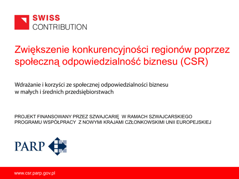 Zwiększenie konkurencyjności regionów poprzez społeczną odpowiedzialność biznesu (CSR) PROJEKT FINANSOWANY PRZEZ SZWAJCARIĘ W RAMACH SZWAJCARSKIEGO PROGRAMU WSPÓŁPRACY Z NOWYMI KRAJAMI CZŁONKOWSKIMI UNII EUROPEJSKIEJ www.csr.parp.gov.pl Plan prezentacji 1. Wprowadzenie do społecznej odpowiedzialności (CSR) w MŚP. 2. Korzyści z wdrażania CSR w małych i średnich firmach według badań. 3. Praktyka CSR w przedsiębiorstwach. Corporate social responsibility (CSR) – społeczna odpowiedzialność biznesu Responsible entrepreneurship – odpowiedzialna przedsiębiorczość www.csr.parp.gov.pl 2 Wprowadzenie Otoczenie makro-ekonomiczne Interesariusze Firma www.csr.parp.gov.pl 3 Korzyści z wdrażania CSR w MŚP w Polsce • 78% poprawa wizerunku i reputacji firmy. • 73% wzrost zaufania pracowników do firmy. • 65% podniesienie poziomu kultury organizacyjnej. • 55% zwiększenie lojalności klientów. • 53% wzrost motywacji pracowników. Grzegorz Baran, Badanie przeprowadzone w 2005 roku w Małopolsce na próbie 60 małych i średnich przedsiębiorstw. www.csr.parp.gov.pl CSR w małych i średnich firmach - przykłady Progast, Słowacja Meblo Jogi, Słowenia Rynek Viking Toys, Szwecja (konsumenci, klienci, dostawcy, partnerzy biznesowi, konkurencja) Miejsce pracy Mercatus, Szwecja Zarządzanie, ład organizacyjny GP Battery Poland, Polska www.csr.parp.gov.pl Społeczeństwo Środowisko naturalne Adler Polska, Polska 5 Przykładowe działania w 4 obszarach Miejsce pracy •Jasne zasady polityki personalnej. •Angażowanie pracowników w procesy decyzyjne, dialog z pracownikami i związkami zawodowymi. •Zachęcanie pracowników do rozwijania i planowania kariery. www.csr.parp.gov.pl Rynek •Badanie satysfakcji klientów. •Informowanie klientów o wartościach firmy. •Terminowe regulowanie zobowiązao (reklamacje, skargi) •Etyka w reklamie i komunikacji. Społeczeństwo •Finansowe, rzeczowe lub usługowe wspieranie działao i projektów lokalnej społeczności. •Zachęcanie pracowników do uczestnictwa w działaniach lokalnej społeczności, np. poprzez poświęcenie czasu i wiedzy personelu •Zaopatrywanie się na lokalnym rynku. Środowisko •Zmniejszanie negatywnego wpływu firmy na środowisko np. poprzez minimalizację odpadów. •Podczas opracowywania nowych produktów i usług - szacowanie wpływu na środowisko. •Dostarczanie jasnej informacji nt. wpływu, jaki mają na środowisko produkty, usługi oraz działania. 6 Miejsce pracy Próba 251 firm, w tym 14% średnich, 41% małych i 44 mikro. www.csr.parp.gov.pl 7 Innocent Drinks • 1998 rok • 1999 -3, 2009 - 275 • Idea i zarządzanie Naturalnie Odpowiedzialne Zrównoważone Efektywne wykorzystanie opakowania składniki zasobów www.csr.parp.gov.pl Dzielenie się zyskami 8 Proces wdrażania CSR w MŚP Analiza Możliwe działania Plan działania Wdrażanie www.csr.parp.gov.pl Co realnie mogę wdrożyć ? Ewaluacja 9 Przydatne źródła • Społeczna odpowiedzialność biznesu (CSR). Podręcznik do samooceny dla przedsiębiorstw. [http://www.csrinfo.org/pl/wiedza/publikacje/2834-nowy-podrecznik-samooceny-dla-firm] • Rozmowy o dobrym biznesie [http://www.csrinfo.org/pl/wiedza/publikacje/985-rozmowy-o-dobrym-biznesie] • Źródła Komisji Europejskiej [http://ec.europa.eu/enterprise/policies/sustainable-business/corporate-socialresponsibility/sme/index_en.htm] www.csr.parp.gov.pl 10 Liliana Anam Dziękuję za uwagę E: [email protected] , T: 608 664 812, www.csrinfo.com.pl PROJEKT FINANSOWANY PRZEZ SZWAJCARIĘ W RAMACH SZWAJCARSKIEGO PROGRAMU WSPÓŁPRACY Z NOWYMI KRAJAMI CZŁONKOWSKIMI UNII EUROPEJSKIEJ www.csr.parp.gov.pl 11