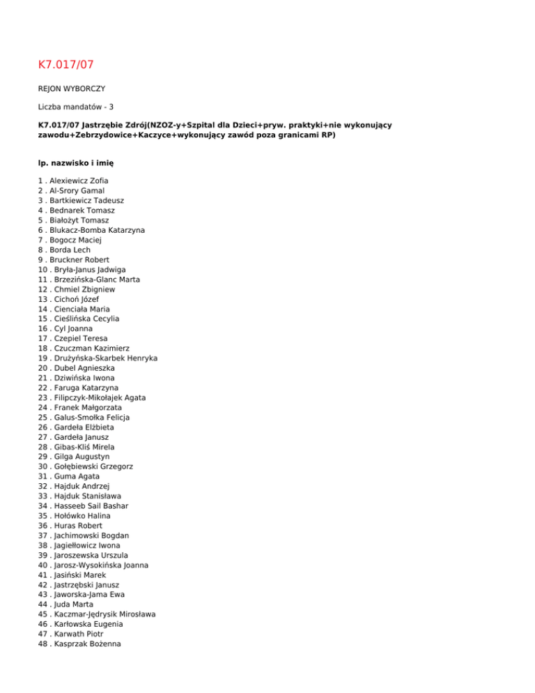 K7.017/07 REJON WYBORCZY Liczba mandatów - 3 K7.017/07 Jastrzębie Zdrój(NZOZ-y+Szpital dla Dzieci+pryw. praktyki+nie wykonujący zawodu+Zebrzydowice+Kaczyce+wykonujący zawód poza granicami RP) lp. nazwisko i imię 1 . Alexiewicz Zofia 2 . Al-Srory Gamal 3 . Bartkiewicz Tadeusz 4 . Bednarek Tomasz 5 . Białożyt Tomasz 6 . Blukacz-Bomba Katarzyna 7 . Bogocz Maciej 8 . Borda Lech 9 . Bruckner Robert 10 . Bryła-Janus Jadwiga 11 . Brzezińska-Glanc Marta 12 . Chmiel Zbigniew 13 . Cichoń Józef 14 . Cienciała Maria 15 . Cieślińska Cecylia 16 . Cyl Joanna 17 . Czepiel Teresa 18 . Czuczman Kazimierz 19 . Drużyńska-Skarbek Henryka 20 . Dubel Agnieszka 21 . Dziwińska Iwona 22 . Faruga Katarzyna 23 . Filipczyk-Mikołajek Agata 24 . Franek Małgorzata 25 . Galus-Smołka Felicja 26 . Gardeła Elżbieta 27 . Gardeła Janusz 28 . Gibas-Kliś Mirela 29 . Gilga Augustyn 30 . Gołębiewski Grzegorz 31 . Guma Agata 32 . Hajduk Andrzej 33 . Hajduk Stanisława 34 . Hasseeb Sail Bashar 35 . Hołówko Halina 36 . Huras Robert 37 . Jachimowski Bogdan 38 . Jagiełłowicz Iwona 39 . Jaroszewska Urszula 40 . Jarosz-Wysokińska Joanna 41 . Jasiński Marek 42 . Jastrzębski Janusz 43 . Jaworska-Jama Ewa 44 . Juda Marta 45 . Kaczmar-Jędrysik Mirosława 46 . Karłowska Eugenia 47 . Karwath Piotr 48 . Kasprzak Bożenna 49 . Kliś Antoni 50 . Kliś Jerzy 51 . Koczor-Ajdukiewicz Małgorzata 52 . Kolińska Halina 53 . Konieczna Maria 54 . Kopacz Janusz 55 . Korczak Ewa 56 . Kosta Jolanta 57 . Kowal-Łoboda Bożena 58 . Kuczera Zbigniew 59 . Kulik Kazimierz 60 . Lechwar-Kołoczek Ewa 61 . Lerch Andrzej 62 . Lubryka Urszula 63 . Łabuś Andrzej 64 . Łabuś Roman 65 . Łukaszek Henryk 66 . Maciejowska Urszula 67 . Majewski Jerzy 68 . Majka Elżbieta 69 . Maleńczyk Lubomira 70 . Małolepszy Bogdan 71 . Marek Teresa 72 . Markiewicz-Natora Barbara 73 . Mikołajek Bohdan 74 . Morstyn Jerzy 75 . Morstyn Maria 76 . Mróz Elżbieta 77 . Mrózek-Wala Zofia 78 . Nagibauer Tadeusz 79 . Niedziałek Katarzyna 80 . Niziołek Maciej 81 . Oleś Mieczysław 82 . Palowska Regina 83 . Pankiewicz Kazimierz 84 . Paszylk Jerzy 85 . Pilarski Józef 86 . Podgórska-Vajda Anna 87 . Prudel Magdalena 88 . Radomska Małgorzata 89 . Rembiesa-Jastrzębska Magdalena 90 . Sarrazin Danuta 91 . Sękowski Juliusz 92 . Sękowski Tomasz 93 . Sierecka Bronisława 94 . Sikorska Małgorzata 95 . Skaźnik-Hanslik Renata 96 . Skorek-Nosalik Krystyna 97 . Skowronek Anna 98 . Skubis Kazimiera 99 . Smoczyńska Wiesława 100 . Sobczak Dariusz 101 . Sobolewska Krystyna 102 . Sójka Paweł 103 . Spon-Patrzyk Danuta 104 . Stańczyk-Wełna Joanna 105 . Stefańska Weronika 106 . Stefański Andrzej 107 . Stępień Bogdan 108 . Stępień Iwona 109 . Stokłosa Grażyna 110 . Suda Romualda 111 . Szalbot Rudolf 112 . Szewczyk Stanisław 113 . Szypuła Anna 114 . Szypuła Piotr 115 . Świecik-Augustyniak Janina 116 . Świerkosz Mirosława 117 . Świtała Jadwiga 118 . Taratucka-Papiorek Danuta 119 . Tomala-Karpińska Iwona 120 . Torbus Beata 121 . Tralewska-Mateja Katarzyna 122 . Wala Teodor 123 . Walczak Justyna 124 . Waloszek Aleksandra 125 . Warchałowski Paweł 126 . Warchoł Anna 127 . Warlewska Grażyna 128 . Warlewski Andrzej 129 . Warszawska Lidia 130 . Wełna Artur 131 . Winiarska-Waluś Urszula 132 . Włodarczyk-Wawryka Donata 133 . Wojcierowska Jolanta 134 . Wydra Marek 135 . Zembrowska Grażyna 136 . Żywicka Gabriela Podmiot udostępniający informację Okregowa Rada Lekarska Autor/Data powstania Jacek Kozakiewicz 2012-12-12 Wprowadził/Data wprowadzenia Tomasz Gawlik 2012-12-22 Ostatnia zmiana/ data zmiany Tomasz Gawlik 2013-02-27 Ilość odsłon artykułu 5135