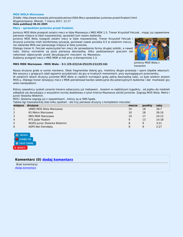 MOS WOLA Warszawa Źródło: http://www.moswola.pl/mos/aktualnosci/564,Mecz-sprawdzian-juniorow-przed-finalami.html Wygenerowano: Wtorek, 7 marca 2017, 12:17 Data publikacji 06.02.2005 Mecz - sprawdzian juniorów przed finałami. Juniorzy MOS Wola przegrali ostatni mecz w lidze Mazowsza z MKS MDK 1:3. Trener Krzysztof Felczak , mając juz zapewnione pierwsze miejsce w lidze mazowieckiej, sprawdził tym razem dublerów. Juniorzy MOS Wola rozegrali ostatni mecz w lidze mazowieckiej. Trener Krzysztof Felczak i drużyna juniorów mieli komfortową sytuację, ponieważ nawet porażka 0:3 w ostatnim meczu , nie zabierała MOS-owi pierwszego miejsca w lidze juniorów. Dlatego trener K. Felczak wykorzystał ten mecz do sprawdzenia formy drugiej szóstki, a nawet ludzi, którzy normalnie są poza pierwszą dwunastką. Kilku podstawowym graczom dał natomiast odpoczynek przed decydującymi meczami na Mazowszu. Dublerzy przegrali mecz z MKS MDK w hali przy ul.Konopnickiej 1:3. MKS MDK Warszawa - MOS Wola - 3:1 (25:22)(14:25)(25:21)(25:16) Juniorzy MOS Wola z trenerem Nasza drużyna grała w sumie nierówno. Obok fragmentów dobrej gry, mieliśmy długie przestoje i sporo blędów własnych. Nie wszyscy z grających zdali egzamin przydatności do gry w trudnych momentach, przy wymagającym przeciwniku. W ostatnich latach drużyny juniorów MOS Wola w ciężkich turniejach grały pełną dwunastką ludzi, co było wielkim atutem MOS-u. Dlatego trener dzisiejszy mecz z MDK potraktował bardzo selekcyjnie dla potencjalnych dublerów i dał mozliwość gry wielu kandydatom. Którzy zawodnicy zyskali uznanie trenera zobaczymy już niebawem , bowiem w najbliższym tygodniu , od piątku do niedzieli odbędzie się decydujący o wszystkim turniej dodatkowy o tytuł mistrza Mazowsza wśród juniorów. Zagrają MOS Wola, Metro i Junior Stolarka Wołomin. MOS i Stolarka zagrają już z zawodnikami , którzy są w SMS Spała. Tabela ligi mazowieckiej (bez kilku spotkań - ale trzy pierwsze drużyny z kompletem meczów) miejsce drużyna mecze punkty sety 1 UMKS MOS Wola Warszawa 10 18 26:7 2 KS Metro Warszawa 10 18 26:10 3 MKS MDK Warszawa 10 17 24:12 4 RTS Jadar Radom 9 13 14:18 5 WUKS Junior Stolarka Wołomin 8 9 3:21 6 ASPS Net Ostrołęka 9 9 2:27 Komentarz (0) dodaj komentarz Brak komentarzy dodaj komentarz