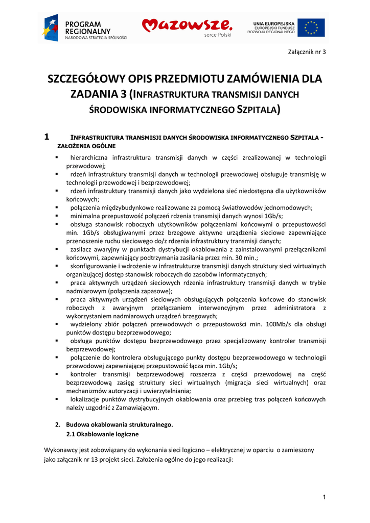 Załącznik nr 3 SZCZEGÓŁOWY OPIS PRZEDMIOTU ZAMÓWIENIA DLA ZADANIA 3 (INFRASTRUKTURA TRANSMISJI DANYCH ŚRODOWISKA INFORMATYCZNEGO SZPITALA) 1 INFRASTRUKTURA TRANSMISJI DANYCH ŚRODOWISKA INFORMATYCZNEGO SZPITALA ZAŁOŻENIA OGÓLNE hierarchiczna infrastruktura transmisji danych w części zrealizowanej w technologii przewodowej; rdzeń infrastruktury transmisji danych w technologii przewodowej obsługuje transmisję w technologii przewodowej i bezprzewodowej; rdzeń infrastruktury transmisji danych jako wydzielona sieć niedostępna dla użytkowników końcowych; połączenia międzybudynkowe realizowane za pomocą światłowodów jednomodowych; minimalna przepustowość połączeń rdzenia transmisji danych wynosi 1Gb/s; obsługa stanowisk roboczych użytkowników połączeniami końcowymi o przepustowości min. 1Gb/s obsługiwanymi przez brzegowe aktywne urządzenia sieciowe zapewniające przenoszenie ruchu sieciowego do/z rdzenia infrastruktury transmisji danych; zasilacz awaryjny w punktach dystrybucji okablowania z zainstalowanymi przełącznikami końcowymi, zapewniający podtrzymania zasilania przez min. 30 min.; skonfigurowanie i wdrożenie w infrastrukturze transmisji danych struktury sieci wirtualnych organizującej dostęp stanowisk roboczych do zasobów informatycznych; praca aktywnych urządzeń sieciowych rdzenia infrastruktury transmisji danych w trybie nadmiarowym (połączenia zapasowe); praca aktywnych urządzeń sieciowych obsługujących połączenia końcowe do stanowisk roboczych z awaryjnym przełączaniem interwencyjnym przez administratora z wykorzystaniem nadmiarowych urządzeń brzegowych; wydzielony zbiór połączeń przewodowych o przepustowości min. 100Mb/s dla obsługi punktów dostępu bezprzewodowego; obsługa punktów dostępu bezprzewodowego przez specjalizowany kontroler transmisji bezprzewodowej; połączenie do kontrolera obsługującego punkty dostępu bezprzewodowego w technologii przewodowej zapewniającej przepustowość łącza min. 1Gb/s; kontroler transmisji bezprzewodowej rozszerza z części przewodowej na część bezprzewodową zasięg struktury sieci wirtualnych (migracja sieci wirtualnych) oraz mechanizmów autoryzacji i uwierzytelniania; lokalizacje punktów dystrybucyjnych okablowania oraz przebieg tras połączeń końcowych należy uzgodnić z Zamawiającym. 2. Budowa okablowania strukturalnego. 2.1 Okablowanie logiczne Wykonawcy jest zobowiązany do wykonania sieci logiczno – elektrycznej w oparciu o zamieszony jako załącznik nr 13 projekt sieci. Założenia ogólne do jego realizacji: 1 Biorąc pod uwagę aktualną sytuację, dotyczącą wydajności systemów okablowania, minimalne wymagania dotyczące elementów okablowania strukturalnego to rzeczywista Kategoria 6 / Klasa E, oraz RJ45 jako interfejs końcowy dla połączeń na ekranowanej skrętce miedzianej 4-parowej. Okablowanie w budynkach wykonane będzie przewodem F/UTP 4x2x0,5 kat.6 LSOH. Przewody zakończone będą z jednej strony na modularnych panelach krosowych 24-32xRJ45 kat.6 FTP, umieszczonych w pośrednich punktach dystrybucyjnych PPD (szafy wiszące na piętrach), i głównym punkcie dystrybucyjnym GPD (szafa stojąca w serwerowni budynku głównego), a z drugiej w punktach elektryczno-logicznych (PEL). Skład PEL (standard Mosaic): obudowa natynkowa 6-modułowa (z ramką i maskownicą), 2 gniazda elektryczne, kodowane, 230V (DATA), 2 gniazda logiczne RJ45 kat.6 FTP + adapter mocujący. Przewody prowadzone będą w 2-komorowych korytkach PVC montowanych natynkowo (lub w korytach blaszanych z przegrodą, jeżeli występuje sufit podwieszany). Główny punkt dystrybucyjny GPD (na bazie szafy stojacej 600x800x45U) zlokalizowany zostanie w pomieszczeniu -budynek główny Szpitala Pośrednie punkty dystrybucyjne na bazie szaf wiszących, dwusekcyjnych 600x600 o wysokości od 9do 15U (uzależnionej od ilości wyposażenia). W szafach należy umieścić elementy wyposażenia (przełącznice światłowodowe, panele krosowe, sprzęt aktywny, organizatory kabli, półki, itp) Minimalne wyposarzenie szafy: wentylacja pasywna, szafa wisząca: a. jeden Patch Panel minimum 24-portowy RJ-45, UTP, kat. 6, 1U, 19" b. jedna listwa zasilająca 5 gniazd z filtrem przeciwzakłóceniowym, 19”, 1,5m (min. standard gniazd 16 A-250 V 2P+Z), c. jedna półka na urządzenia telekomunikacyjne, min. 3 dodatkowe komplety śrub montażowych typu Rack Wykonawca zapewni podłączenie wszystkich wybudowanych punktów sieciowych do sieci Internet, oraz łączność w sieci komputerowej pomiędzy wszystkimi lokalizacjami, objętymi niniejszym opracowaniem. Założenia Zamawiającego i minimalne wymagania dla przyjmowanych rozwiązań: 1. Wszystkie komponenty systemu okablowania mają być zgodne z wymaganiami obowiązujących norm na min. Kategorię 6 wg.: ISO/IEC 11801, PN-EN 50173-1; 2. Wymaga się uzyskanie bezpłatnego certyfikatu 25-letniej gwarancji producenta, dlatego wszystkie elementy pasywne składając się na okablowanie strukturalne muszą pochodzić z jednolitej oferty reprezentującej kompletny system i być oznaczone logo lub nazwą tego samego producenta; 4. Aby zagwarantować powtarzalne parametry minimum kat. 6 oraz potwierdzić zgodność 2 parametrów elektrycznych proponowanych modułów gniazd z obowiązującymi normami, wymagane jest przedstawienie odpowiednich certyfikatów wydanych przez niezależne laboratoria (np. DELTA - Danish Electronics Light & Acoustic), uwzględniające metodę kwalifikacji komponentów sieciowych De-Embedded; 5. Maksymalna długość kabla instalacyjnego nie może przekraczać 90m; 6. W budynkach każde gniazdo logiczne należy podłączyć oddzielnym, ekranowanym kablem typu F/UTP kat. 6 o paśmie przenoszenia min. 250MHz i średnicy powłoki zewnętrznej min. 7 mm do paneli krosowych w szafach; 7. System ma mieć maksymalne możliwości transmisyjne, zgodne z obowiązującymi wymogami dla kat. 6; 8. Złącze ma posiadać standard mont