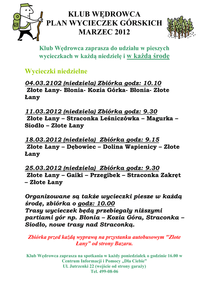 KLUB WĘDROWCA PLAN WYCIECZEK GÓRSKICH MARZEC 2012 Klub Wędrowca zaprasza do udziału w pieszych wycieczkach w każdą niedzielę i w każdą środę Wycieczki niedzielne 04.03.2102 (niedziela) Zbiórka godz: 10.10 Złote Łany- Błonia- Kozia Górka- Błonia- Złote Łany 11.03.2012 (niedziela) Zbiórka godz: 9.30 Złote Łany – Straconka Leśniczówka – Magurka – Siodło – Złote Łany 18.03.2012 (niedziela) Zbiórka godz: 9.15 Złote Łany – Dębowiec – Dolina Wapienicy – Złote Łany 25.03.2012 (niedziela) Zbiórka godz: 9.30 Złote Łany – Gaiki – Przegibek – Straconka Zakręt – Złote Łany Organizowane są także wycieczki piesze w każdą środę, zbiórka o godz: 10.00 Trasy wycieczek będą przebiegały niższymi partiami gór np. Błonia – Kozia Góra, Straconka – Siodło, nowe trasy nad Straconką. Zbiórka przed każdą wyprawą na przystanku autobusowym "Złote Łany” od strony Bazaru. Klub Wędrowca zaprasza na spotkania w każdy poniedziałek o godzinie 16.00 w Centrum Informacji i Pomocy „Dla Ciebie” Ul. Jutrzenki 22 (wejście od strony garaży) Tel. 499-08-06