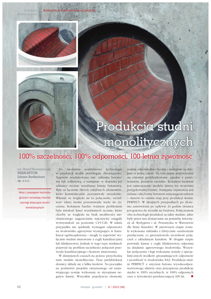 Inőynieria Bezwykopowa INFRASTRUKTURA WODNA I ėCIEKOWA Produkcja studni monolitycznych 100% szczelnoijci, 100% odpornoijci, 100-letnia őywotnoijå inő. Paweğ Niewiadomski HABA-BETON Johann Bartlechner sp. z o.o. Wraz z postĘpem technologicznym wzrastajĉ równieŮ wymogi dotyczĉce studni kanalizacyjnych 60 Do niedawna podstawowa technologia w produkcji studni przebiegała dwuetapowo. Najpierw produkowano tzw. szklankę betonową lub żelbetową, a następnie w dojrzałej już szklance ręcznie wyrabiano kinetę betonową. Było to łączenie dwóch odrębnych elementów, które konstrukcyjnie pozostawały niezależne. Właśnie ze względu na to połączenie, szczelność takiej studni pozostawiała wiele do życzenia. Kolejnym bardzo ważnym problemem była trwałość kinet wyrabianych ręcznie, które choćby ze względu na brak możliwości mechanicznego zagęszczania najczęściej osiągały wytrzymałość na poziomie C15/C20. W takim przypadku nie spełniały wymagań odporności na środowisko agresywne występujące w kanalizacji ogólnospławnej – mogły to zapewnić wyłącznie studnie murowane z cegły kanalizacyjnej lub klinkierowej. Jednak w tego typu studniach pojawiał się problem szczelności połączeń przewodu kanalizacyjnego i komory murowanej. W dzisiejszych czasach na pomoc przychodzą nam studnie monolityczne. Faza prefabrykacji dennicy składa się z kilku kroków. Na początku na podstawie projektu otrzymanego od zamawiającego zostaje wykonany ze styropianu negatyw kinety. Wszystkie pojedyncze elementy listopad - grudzieĽ 6 / 2012 [48] zostają odpowiednio docięte i następnie są sklejane w jedną całość. Na tym etapie przytwierdza się również prefabrykowane, zgodne z zamówieniem, przejścia szczelne. Kolejnym krokiem jest umieszczenie modelu kinety we wcześniej przygotowanej formie. Następną czynnością jest zalanie całej formy betonem samozagęszczalnym – stanowi to ostatni etap przy produkcji dennic PERFECT. W skrajnych przypadkach po złożeniu zamówienia po upływie 24 godzin dennica jest gotowa do wysyłki na budowę. Połączeniem obu technologii produkcji są takie studnie, jakie były przez nas dostarczane na potrzebę inwestycji ul. Rydygiera i ul. Przasnyska w Warszawie dla firmy Knauber. W pierwszym etapie została wykonana szklanka z fabrycznie osadzonymi przyłączami, co gwarantowało szczelność połączeń z układanym kanałem. W drugim etapie powstała kineta z cegły klinkierowej odpornej na działanie agresywnego środowiska. Wszystkie połączenia i fugi wykonane zostały z specjalistycznych środków gwarantujących odporność i szczelność w środowisku XA3. Produkcja studni PERFECT z użyciem betonu wysokoodpornościowego ułatwia oraz przyspiesza produkcję studni w 100% szczelnych, w 100% odpornych oraz o żywotności przekraczającej 100 lat.