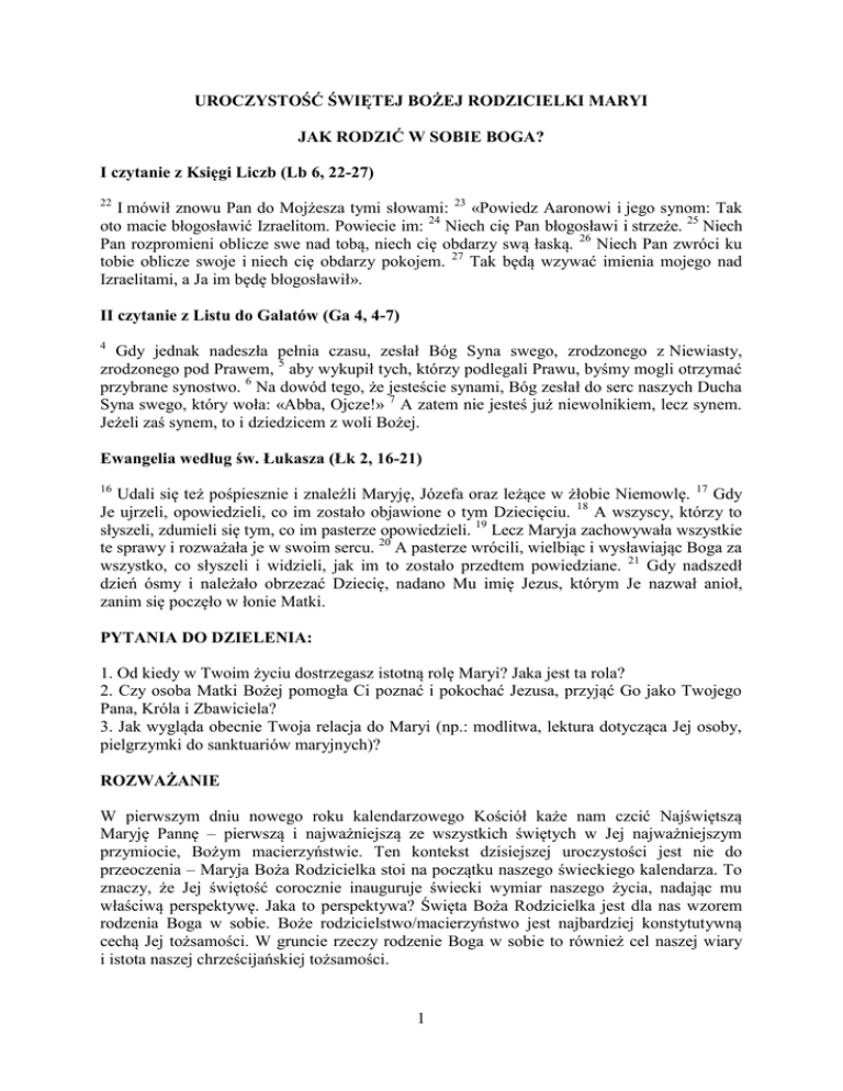 UROCZYSTOŚĆ ŚWIĘTEJ BOŻEJ RODZICIELKI MARYI JAK RODZIĆ W SOBIE BOGA? I czytanie z Księgi Liczb (Lb 6, 22-27) 22 I mówił znowu Pan do Mojżesza tymi słowami: 23 «Powiedz Aaronowi i jego synom: Tak oto macie błogosławić Izraelitom. Powiecie im: 24 Niech cię Pan błogosławi i strzeże. 25 Niech Pan rozpromieni oblicze swe nad tobą, niech cię obdarzy swą łaską. 26 Niech Pan zwróci ku tobie oblicze swoje i niech cię obdarzy pokojem. 27 Tak będą wzywać imienia mojego nad Izraelitami, a Ja im będę błogosławił». II czytanie z Listu do Galatów (Ga 4, 4-7) 4 Gdy jednak nadeszła pełnia czasu, zesłał Bóg Syna swego, zrodzonego z Niewiasty, zrodzonego pod Prawem, 5 aby wykupił tych, którzy podlegali Prawu, byśmy mogli otrzymać przybrane synostwo. 6 Na dowód tego, że jesteście synami, Bóg zesłał do serc naszych Ducha Syna swego, który woła: «Abba, Ojcze!» 7 A zatem nie jesteś już niewolnikiem, lecz synem. Jeżeli zaś synem, to i dziedzicem z woli Bożej. Ewangelia według św. Łukasza (Łk 2, 16-21) 16 Udali się też pośpiesznie i znaleźli Maryję, Józefa oraz leżące w żłobie Niemowlę. 17 Gdy Je ujrzeli, opowiedzieli, co im zostało objawione o tym Dziecięciu. 18 A wszyscy, którzy to słyszeli, zdumieli się tym, co im pasterze opowiedzieli. 19 Lecz Maryja zachowywała wszystkie te sprawy i rozważała je w swoim sercu. 20 A pasterze wrócili, wielbiąc i wysławiając Boga za wszystko, co słyszeli i widzieli, jak im to zostało przedtem powiedziane. 21 Gdy nadszedł dzień ósmy i należało obrzezać Dziecię, nadano Mu imię Jezus, którym Je nazwał anioł, zanim się poczęło w łonie Matki. PYTANIA DO DZIELENIA: 1. Od kiedy w Twoim życiu dostrzegasz istotną rolę Maryi? Jaka jest ta rola? 2. Czy osoba Matki Bożej pomogła Ci poznać i pokochać Jezusa, przyjąć Go jako Twojego Pana, Króla i Zbawiciela? 3. Jak wygląda obecnie Twoja relacja do Maryi (np.: modlitwa, lektura dotycząca Jej osoby, pielgrzymki do sanktuariów maryjnych)? ROZWAŻANIE W pierwszym dniu nowego roku kalendarzowego Kościół każe nam czcić Najświętszą Maryję Pannę – pierwszą i najważniejszą ze wszystkich świętych w Jej najważniejszym przymiocie, Bożym macierzyństwie. Ten kontekst dzisiejszej uroczystości jest nie do przeoczenia – Maryja Boża Rodzicielka stoi na początku naszego świeckiego kalendarza. To znaczy, że Jej świętość corocznie inauguruje świecki wymiar naszego życia, nadając mu właściwą perspektywę. Jaka to perspektywa? Święta Boża Rodzicielka jest dla nas wzorem rodzenia Boga w sobie. Boże rodzicielstwo/macierzyństwo jest najbardziej konstytutywną cechą Jej tożsamości. W gruncie rzeczy rodzenie Boga w sobie to również cel naszej wiary i istota naszej chrześcijańskiej tożsamości. 1 1. O co tak naprawdę chodzi z Bożym rodzicielstwem Maryi? Boże macierzyństwo Maryi to pierwszy mariologiczny dogmat wiary. Ogłosili go biskupi zebrani na Soborze Efeskim w 431 r. Stwierdzili oni, że Maryję należy czcić jako Bogarodzicę – Matkę Boga-Człowieka Jezusa Chrystusa. Jak należy rozumieć ten dogmat wiary? Przecież Jezus jest odwiecznym Synem Bożym, równym Ojcu, tzn. że istniał odwiecznie, jako zrodzony przez Boga-Ojca. Jak więc można było Go zrodzić ponownie? Maryja oczywiście nie mogła Go urodzić jako Boga – nie zrodziła Jego Bóstwa. Natomiast podjęła Boże zaproszenie, zgodziła się przyjąć Bożego Syna do swojego łona i urodzić Go jako Człowieka. Boskiej Osobie dała więc ludzkie ciało, ludzką naturę. Jest Matką Syna Bożego według ciała. Jest to specjalny przywilej wybrania Maryi przez Boga i stąd wypływa Jej niezrównana godność – jest pierwszą, najważniejszą ze świętych Kościoła. Tylko Jej przysługuje tytuł Theotokos – Boża Rodzicielka. 2. Boże macierzyństwo Maryi wypełnieniem obietnicy Bożego błogosławieństwa danej ludowi Starego Przymierza (Lb 6,22-27) Każdy tekst Starego Testament powinien być odczytywany i interpretowany w świetle swojego wypełnienia w Nowym Testamencie, w zbawczym dziele Jezusa Chrystusa. W przypadku tekstów wybranych przez Kościół do liturgii Mszy świętej, należy również uwzględniać ich aktualizację w „tu i teraz” każdej liturgii. Tak też spójrzmy na, z pozoru zupełnie niezwiązany z tematyką dzisiejszej uroczystości, słyszany przed chwilą krótki fragment z Księgi Liczb. Tekst ten jest bardzo zwięzłym wycinkiem pouczeń i obietnic, które Bóg daje Izraelitom pod Górą Synaj podczas ich wędrówki do Ziemi Obiecanej. Fragment ten to formuła Bożego błogosławieństwa, którą kapłani mają odtąd wypowiadać nad Izraelitami. Przywołajmy raz jeszcze te słowa: „Niech cię Pan błogosławi i strzeże. Niech Pan rozpromieni oblicze swe nad Tobą, niech cię obdarzy swą łaską. Niech zwróci ku tobie swoje oblicze i niech cię obdarzy pokojem”. W kolejnym zdaniu Bóg przypomina, że to nie kapłan, ale On sam błogosławi ludowi. Te słowa Bożego błogosławieństwa w poetycki sposób wyrażają obietnicę Boga, że będzie zawsze opiekował się swoim ludem i troszczył się o niego, że nie będzie Izraelitów nigdy spuszczał z oczu (promieniejące oblicze), że będzie ich darzył łaską i pokojem. To Boże błogosławieństwo towarzyszyło ludowi przez całą pogmatwaną historię Starego Testamentu, pomimo ludzkich upadków, odejść, niewdzięczności itp. Bóg był zawsze wierny. Nie opuszczał narodu i był z nim i w nim, choć była to dla ludu obecność mało uchwytna, jakby zasłonięta kurtyną świątynnego kultu ofiarniczego. Najpełniej jednakże to błogosławieństwo i Boże obietnice wyraziły się wtedy, gdy nadeszła pełnia czasu, w momencie, o którym św. Paweł pisze we fragmencie Listu do Galatów. Ta pełnia czasu to moment, gdy Bóg pobłogosławił ludzkości tak obficie jak nigdy wcześniej w historii. Dokonało się to przez Maryję, 