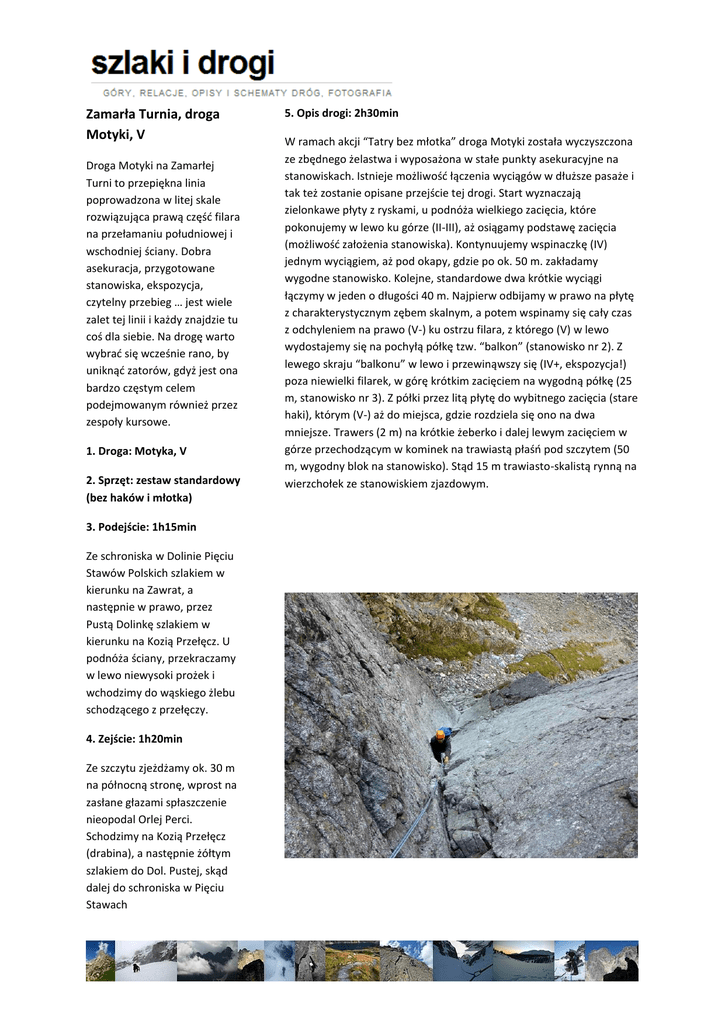 Zamarła Turnia, droga Motyki, V Droga Motyki na Zamarłej Turni to przepiękna linia poprowadzona w litej skale rozwiązująca prawą część filara na przełamaniu południowej i wschodniej ściany. Dobra asekuracja, przygotowane stanowiska, ekspozycja, czytelny przebieg … jest wiele zalet tej linii i każdy znajdzie tu coś dla siebie. Na drogę warto wybrać się wcześnie rano, by uniknąć zatorów, gdyż jest ona bardzo częstym celem podejmowanym również przez zespoły kursowe. 1. Droga: Motyka, V 2. Sprzęt: zestaw standardowy (bez haków i młotka) 3. Podejście: 1h15min Ze schroniska w Dolinie Pięciu Stawów Polskich szlakiem w kierunku na Zawrat, a następnie w prawo, przez Pustą Dolinkę szlakiem w kierunku na Kozią Przełęcz. U podnóża ściany, przekraczamy w lewo niewysoki prożek i wchodzimy do wąskiego żlebu schodzącego z przełęczy. 4. Zejście: 1h20min Ze szczytu zjeżdżamy ok. 30 m na północną stronę, wprost na zasłane głazami spłaszczenie nieopodal Orlej Perci. Schodzimy na Kozią Przełęcz (drabina), a następnie żółtym szlakiem do Dol. Pustej, skąd dalej do schroniska w Pięciu Stawach 5. Opis drogi: 2h30min W ramach akcji “Tatry bez młotka” droga Motyki została wyczyszczona ze zbędnego żelastwa i wyposażona w stałe punkty asekuracyjne na stanowiskach. Istnieje możliwość łączenia wyciągów w dłuższe pasaże i tak też zostanie opisane przejście tej drogi. Start wyznaczają zielonkawe płyty z ryskami, u podnóża wielkiego zacięcia, które pokonujemy w lewo ku górze (II-III), aż osiągamy podstawę zacięcia (możliwość założenia stanowiska). Kontynuujemy wspinaczkę (IV) jednym wyciągiem, aż pod okapy, gdzie po ok. 50 m. zakładamy wygodne stanowisko. Kolejne, standardowe dwa krótkie wyciągi łączymy w jeden o długości 40 m. Najpierw odbijamy w prawo na płytę z charakterystycznym zębem skalnym, a potem wspinamy się cały czas z odchyleniem na prawo (V-) ku ostrzu filara, z którego (V) w lewo wydostajemy się na pochyłą półkę tzw. “balkon” (stanowisko nr 2). Z lewego skraju “balkonu” w lewo i przewinąwszy się (IV+, ekspozycja!) poza niewielki filarek, w górę krótkim zacięciem na wygodną półkę (25 m, stanowisko nr 3). Z półki przez litą płytę do wybitnego zacięcia (stare haki), którym (V-) aż do miejsca, gdzie rozdziela się ono na dwa mniejsze. Trawers (2 m) na krótkie żeberko i dalej lewym zacięciem w górze przechodzącym w kominek na trawiastą płaśń pod szczytem (50 m, wygodny blok na stanowisko). Stąd 15 m trawiasto-skalistą rynną na wierzchołek ze stanowiskiem zjazdowym. 6. Schemat ( i miejsce na notatki):