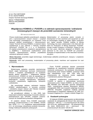 dr inż. Piotr MATUSIAK dr inż. Daniel KOWOL Instytut Techniki Górniczej KOMAG Marian TYRAKOWSKI Mariusz KACZMAREK FUGOR Współpraca KOMAG-u i FUGOR-u w zakresie opracowywania i wdrażania innowacyjnych maszyn do przeróbki surowców mineralnych Streszczenie Summary Proces modernizacji zakładów przeróbczych, związany jest z opracowywaniem nowych maszyn i urządzeń oraz technologii pozwalających na uzyskanie coraz lepszych efektów produkcyjnych i ekonomicznych. Instytut Techniki Górniczej KOMAG, w ostatnich latach, współpracuje w tym zakresie z Fabryką Urządzeń Górniczych „FUGOR” Sp. z o. o. w Krotoszynie. W artykule przedstawiono urządzenia zaprojektowane w KOMAG-u i dostarczone użytkownikom przez FUGOR. Zaprezentowano również przykładowe wdrożenia opisanych maszyn. Modernization of processing plants consists in development of new machines and equipment as well as technologies enabling to obtain higher production and higher benefits. KOMAG Institute of Mining Technology has been collaborated in this field with the Plant for Production of Mining Equipment "FUGOR", Private Limited Company in Krotoszyn, Poland for the last few years. Machines designed at KOMAG and delivered to the users by FUGOR are presented. Examples of implementation of the described machines are given. Słowa kluczowe: przeróbka węgla kamiennego, modernizacja zakładów przeróbczych, maszyny i urządzenia do przeróbki węgla Keywords: hard coal processing, modernization of processing plants, machines and equipment for coal processing 1. Wprowadzenie Modernizacja zakładów przeróbki mechanicznej kopalń węgla kamiennego wymusza dostosowanie maszyn i urządzeń, pozwalających na uzyskanie lepszej jakości produktów i zwiększenia efektów ekonomicznych. KOMAG od wielu lat specjalizuje się w opracowywaniu nowych rozwiązań w ww. obszarze, obejmującym: procesy wzbogacania, klasyfikacji, kruszenia, odwadniania, zagęszczenia, transportu i próbobrania. Dla powyższego zakresu, partnerem Instytutu KOMAG współpracującym w procesie produkcji i wdrażania nowych maszyn jest Fabryka Urządzeń Górniczych FUGOR w Krotoszynie. Jej początkowym efektem, w roku 2005, było rozpoczęcie produkcji typoszeregu kruszarek udarowopierścieniowych typu UP/UPK, urządzeń przeznaczonych do rozdrabniania produktów wzbogacania. W ostatnim okresie firma FUGOR rozpoczęła produkcję zmodernizowanej w ITG KOMAG, wirówki typu WOW 1.3 i 1.4, urządzenia wykorzystywanego m.in. do końcowego odwadniania produktu koncentratowego miałowych osadzarek pulsacyjnych. 62 Firma FUGOR produkuje również przenośniki kubełkowe do odwadniania produktów wzbogacania osadzarek pulsacyjnych. Na podstawie dokumentacji, opracowanej przez Instytut KOMAG, produkuje różne typy mieszalników m.in. MW 1400, który jest przeznaczony do mieszania mułów węglowych i rozdrabniania placków filtracyjnych. Kolejnymi urządzeniami produkowanymi przez FUGOR, w oparciu o dokumentacje techniczne opracowane przez Instytut KOMAG, są młyny kulowe MW 900x900 oraz 900x1800, pionowe odwadniarki NAEL, rozdrabniacze placków filtracyjnych MR300, wzbogacalniki DISA oraz kruszarki wstępnego kruszenia KWK100. Wszystkie urządzenia znajdują szerokie zastosowanie w kopalniach należących do JSW S.A., Kompanii Węglowej S.A. i kopalni Lubelski Węgiel S.A. 2. Osadzarki pulsacyjne W Instytucie KOMAG opracowywane są dokumentacje osadzarek do wzbogacania [4] różnych klas ziarnowych: miałowych - OM (rys. 1 i 2) przeznaczonych dla ziaren 20-0 (0,5) mm, średnioziarnowych - OS przeznaczonych dla ziaren 80(50)-0(0,5) mm i ziarnowych - OZ przeznaczonych dla ziaren 120-20 mm. MASZYNY GÓRNICZE 3/2015 Rys. 1. Przykładowa osadzarka pulsacyjna dwukorytowa OM30 [5] Rys. 2. Osadzarka miałowa OM30 KWK Sośnica w trakcie montażu Ich konstrukcje są stale modernizowane pod względem geometrii kształtu skrzyń dolnych, mocowania pokładów sitowych, usprawnienia urządzeń automatycznej regulacji odbioru produktów ciężkich, zaworów pulsacyjnych oraz kolektorów powietrza roboczego. Cechuje je budowa modułowa (jednostką jest sekcja – przedział), która umożliwia tworzenie maszyn o wymaganej wielkości i wydajności, jedno lub dwukorytowych. Poprzez poddawanie materiału wielokrotnym pulsacjom uzyskuje się rozdział materiału na warstwy, od ziaren o największej prędkości opadania, usytuowanych na pokładzie sitowym, do ziaren o najmniejszej prędkości opadania, wynoszonych na powierzchnię wzbogacanego materiału [2]. W skład przedziałów roboczych wchodzą skrzynie dolne oraz skrzynie górne (koryta) robocze. Skrzynie górne pojedynczego przedziału osadzarki wyposażone są w pokłady sitowe, kolektory powietrza roboczego, zespół rozrządu powietrza pulsacyjnego i urządzenia odbioru produktów wzbogacania [1]. Wzbogacanie w osadzarkach polega na wykorzystaniu różnic w prędkości opadania ziaren w wodzie, zależnej od ich gęstości, rozmiaru i kształtu. Wzbogacany materiał podlega cyklicznemu rozluzowaniu w pulsacyjnym ośrodku wodnym, co powoduje jego rozwarstwienie i transport po powierzchni pokładu sitowego, w kierunku strefy rozdziału produktów wzbogacania. Na podstawie sygnałów pomiarowych i reakcji układu odbioru produktów wzbogacania następuje rozdzielenie wzbogacanego materiału na produkt górny (koncentratowy), który przepływa nad progiem przelewowym, kończącym pojedynczy przedział osadzarki oraz produkt dolny (odpadowy), odprowadzany kanałem odbiorczym usytuowanym poniżej pokładu sitowego, w układzie odprowadzania produktów [1, 3]. W tabeli 1 przedstawiono osadzarki zaprojektowane przez Instytut Techniki Górniczej KOMAG w latach 2005-2015. Fima FUGOR jest jednym z wykonawców osadzarek wykonanych w oparciu o technologię i dokumentację Instytutu KOMAG. Osadzarki zaprojektowane przez KOMAG w latach 2005-2015 Tabela 1 Lp. Kopalnia Typ System sterowania Sztuk/Typ 1. KWK Rydułtowy OM20 EMAG 1 j