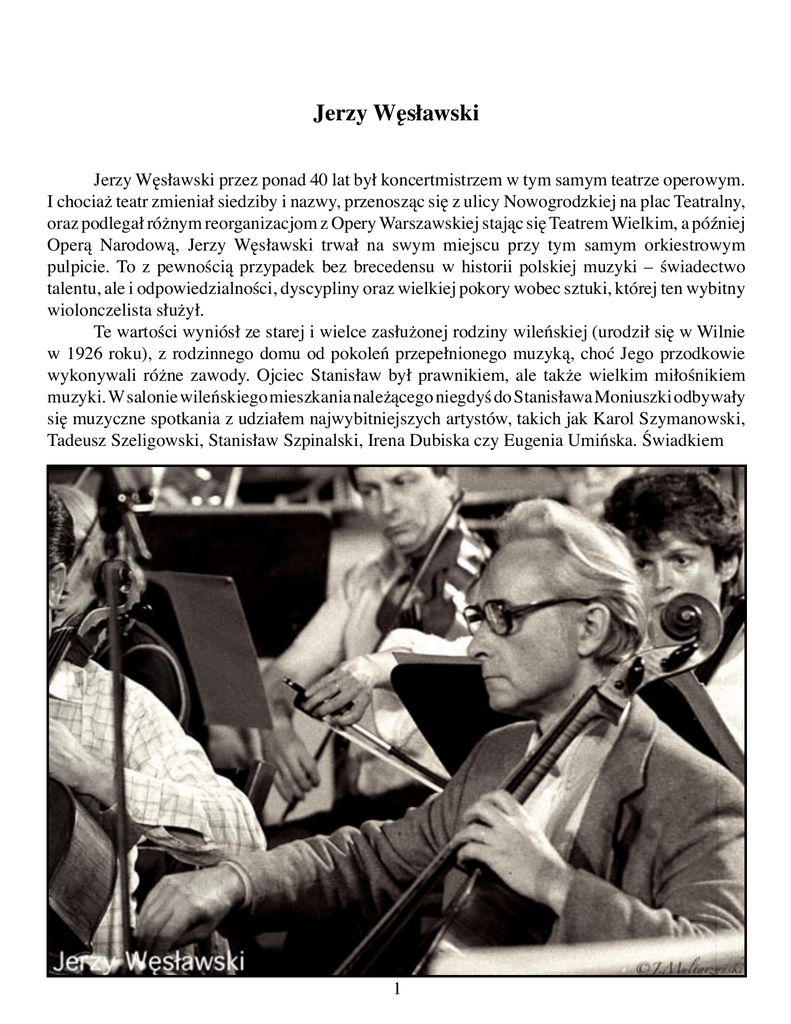 Jerzy Węsławski Jerzy Węsławski przez ponad 40 lat był koncertmistrzem w tym samym teatrze operowym. I chociaż teatr zmieniał siedziby i nazwy, przenosząc się z ulicy Nowogrodzkiej na plac Teatralny, oraz podlegał różnym reorganizacjom z Opery Warszawskiej stając się Teatrem Wielkim, a później Operą Narodową, Jerzy Węsławski trwał na swym miejscu przy tym samym orkiestrowym pulpicie. To z pewnością przypadek bez brecedensu w historii polskiej muzyki – świadectwo talentu, ale i odpowiedzialności, dyscypliny oraz wielkiej pokory wobec sztuki, której ten wybitny wiolonczelista służył. Te wartości wyniósł ze starej i wielce zasłużonej rodziny wileńskiej (urodził się w Wilnie w 1926 roku), z rodzinnego domu od pokoleń przepełnionego muzyką, choć Jego przodkowie wykonywali różne zawody. Ojciec Stanisław był prawnikiem, ale także wielkim miłośnikiem muzyki. W salonie wileńskiego mieszkania należącego niegdyś do Stanisława Moniuszki odbywały się muzyczne spotkania z udziałem najwybitniejszych artystów, takich jak Karol Szymanowski, Tadeusz Szeligowski, Stanisław Szpinalski, Irena Dubiska czy Eugenia Umińska. Świadkiem 1 2 owych spotkań był mały Jerzy. Nic więc dziwnego, że po latach już jako dorosły człowiek i wybitny artysta tak bardzo zabiegał, by w Wilnie przy ulicy Niemieckiej 3, w mieszkaniu jego rodziców, powstała Izba Pamięci Stanisława Moniuszki. Także w Wilnie, w tym samym konserwatorium, w którym nauczał kiedyś Moniuszko, rozpoczął muzyczną edukację. Nauczycieli i opiekunów miał znakomitych. Pierwszym Jego pedagogiem był Arnold Rezler. Nauka trwała krótko, bo z uczelni w czasie wojny usunięto wszystkich Polaków. Po wojnie i przymusowym przeniesieniu Jerzy osiadł w Bydgoszczy, gdzie kontynuował naukę u Zdzisławy Wojciechowskiej. Później spotkał swojego mistrza, znakomitego wiolonczelistę Kazimierza Wiłkomirskiego, u którego tak bardzo chciał doskonalić umiejętności, że kiedy zaczął pracę w Operze Poznańskiej, jeździł na lekcje do Wrocławia. Za Wiłkomirskim przeniósł się później do Państwowej Opery i Filharmonii w Gdańsku. Właśnie w Gdańsku ukończył studia i tam po raz pierwszy został koncertmistrzem orkiestry. Ważną rolę w Jego życiu odegrał również legendarny dyrektor polskiej opery Walerian Bierdiajew. Poznali się w Poznaniu i młody muzyk musiał zapaść w pamięć znakomitemu dyrygentowi i dyrektorowi, bo kilka lat później, w 1955 roku, zaproponował Mu stanowisko koncertmistrza w Operze Warszawskiej. Jerzy Węsławski zrozumiał wówczas, że znalazł miejsce w życiu. Przez ponad 40 lat ujawniał swą aktywność na wielu polach: zajmował się muzyką kameralną, przyjmował zaproszenia do współpracy z Filharmonią Narodową, z którą niejednokrotnie jeździł na zagraniczne tournées, przez ponad 20 lat oddawał się pracy pedagogicznej w Akademii Muzycznej w Łodzi, ale nigdy nawet na chwilę nie porzucił swego teatru i swego w nim miejsca. Mawiał często, że w orkiestrze jest jak w wojsku: jest wódz naczelny i są generałowie przekazujący jego strategię reszcie armii. Tymi generałami są koncertmistrzowie, do których i On się zaliczał. W owym na poły żartobiliwym stwierdzeniu nie było wszakże żadnej chęci wyróżnienia się. Kryło się w tych słowach ogromne poczucie odpowiedzialności i świadomości ciężaru zadań zarówno artystycznych, jak i międzyludzkich. Każdy, kto Go znał, musi przyznać, że zawsze i z jednych, i drugich wywiązywał się niezwykle sumiennie. Był pod tym względem wzorem dla innych, przede wszystkim dla młodych. Radował się ogromnie, widząc, jak gdzieś obok kiełkuje nowy talent, i zawsze potrafił otoczyć go troskliwą opieką. Słowo „koncertmistrz” składa się – jak wiadomo – z dwóch członów. Koncert, a więc występ, a więc muzyka, a więc sztuka. Ta zawsze w Jego życiu zajmowała miejsce szczególne. I słowo „mistrz”. Jerzy Węsławski był człowiekiem niezwykłej skromności. Ale był również mistrzem w tym, co robił. Tak zawsze oceniali Go koledzy i uczniowie. Mistrzem niekwestionowanym, jakich trudno już dzisiaj spotkać. Zmarł 28 grudnia 1997 roku. Nagle i niespodziewanie. Dla wszystkich ta śmierć była ogromnym zaskoczeniem. Trudno pogodzić się z myślą, że nie ma wśród nas Artysty tak chętnie służącego innym swą mądrą radą i życzliwą pomocą. 3