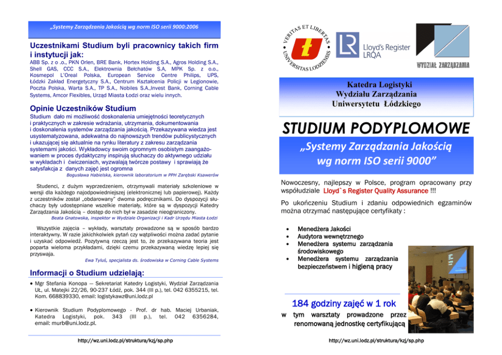 „Systemy Zarządzania Jakością wg norm ISO serii 9000:2006 Uczestnikami Studium byli pracownicy takich firm i instytucji jak: ABB Sp. z o .o., PKN Orlen, BRE Bank, Hortex Holding S.A., Agros Holding S.A., Shell GAS, CCC S.A., Elektrownia Bełchatów S.A, MPK Sp. z o.o., Kosmepol L’Oreal Polska, European Service Centre Philips, UPS, Łódzki Zakład Energetyczny S.A., Centrum Kształcenia Policji w Legionowie, Poczta Polska, Warta S.A., TP S.A., Nobiles S.A.,Invest Bank, Corning Cable Systems, Amcor Flexibles, Urząd Miasta Łodzi oraz wielu innych. Katedra Logistyki Wydziału Zarządzania Uniwersytetu Łódzkiego Opinie Uczestników Studium Studium dało mi możliwość doskonalenia umiejętności teoretycznych i praktycznych w zakresie wdrażania, utrzymania, dokumentowania i doskonalenia systemów zarządzania jakością. Przekazywana wiedza jest usystematyzowana, adekwatna do najnowszych trendów publicystycznych i ukazującej się aktualnie na rynku literatury z zakresu zarządzania systemami jakości. Wykładowcy swoim ogromnym osobistym zaangażowaniem w proces dydaktyczny inspirują słuchaczy do aktywnego udziału w wykładach i ćwiczeniach, wyzwalają twórcze postawy i sprawiają że satysfakcja z danych zajęć jest ogromna STUDIUM PODYPLOMOWE „Systemy Zarządzania Jakością wg norm ISO serii 9000” Bogusława Habielska, kierownik laboratorium w PPH Zarębski Ksawerów Studenci, z dużym wyprzedzeniem, otrzymywali materiały szkoleniowe w wersji dla każdego najodpowiedniejszej (elektronicznej lub papierowej). Każdy z uczestników został „obdarowany” dwoma podręcznikami. Do dyspozycji słuchaczy były udostępniane wszelkie materiały, które są w dyspozycji Katedry Zarządzania Jakością – dostęp do nich był w zasadzie nieograniczony. Nowoczesny, najlepszy w Polsce, program opracowany przy współudziale Lloyd`s Register Quality Assurance !!! Po ukończeniu Studium i zdaniu odpowiednich egzaminów można otrzymać następujące certyfikaty : Beata Gnatowska, inspektor w Wydziale Organizacji i Kadr Urzędu Miasta Łodzi Wszystkie zajęcia – wykłady, warsztaty prowadzone są w sposób bardzo interaktywny. W razie jakichkolwiek pytań czy wątpliwości można zadać pytanie i uzyskać odpowiedź. Pozytywną rzeczą jest to, że przekazywana teoria jest poparta wieloma przykładami, dzięki czemu przekazywaną wiedzę lepiej się przyswaja. Ewa Tyluś, specjalista ds. środowiska w Corning Cable Systems Informacji o Studium udzielają: Menedżera Jakości Audytora wewnętrznego Menedżera systemu zarządzania środowiskowego Menedżera systemu zarządzania bezpieczeństwem i higieną pracy . . 3 Mgr Stefania Konopa — Sekretariat Katedry Logistyki, Wydział Zarządzania UŁ, ul. Matejki 22/26, 90-237 Łódź, pok. 344 (III p.), tel. 042 6355215, tel. Kom. 668839330, email: [email protected] Kierownik Studium Podyplomowego - Prof. dr hab. Maciej Urbaniak, Katedra Logistyki, pok. 343 (III p.), tel. 042 6356284, email: [email protected]. http://wz.uni.lodz.pl/struktura/kzj/sp.php 184 godziny zajęć w 1 rok w tym warsztaty prowadzone przez renomowaną jednostkę certyfikującą http://wz.uni.lodz.pl/struktura/kzj/sp.php „Systemy Zarządzania Jakością wg norm ISO serii 9000:2006” „Systemy Zarządzania Jakością wg norm ISO serii 9000:2006” Charakterystyka Studium Program Studium Program Studium opracowany został przy współudziale znanej jednostki certyfikującej: Lloyd`s Register Quality Assurance . Nazwa przedmiotu Total Quality Management—Bussiness Excellence —16godz. Wymagania standardów zarządzania (ISO 9001, ISO 14001, PN-N/OHSAS 18001 HACCP/ISO 22000 — 32 godz. Zarządzanie procesowe i projektowe - 16 godz. Jakość w systemach logistycznych — 4 godz. Certyfikacja wyrobów - 4 godz. Nowe trendy w zakresie standardów zarządzania - 4 godz. Standardy społecznej odpowiedzialności biznesu — 4 godz. Komunikacja i motywacja w zarządzaniu — 8 godz. Spotkania z praktykami—8 godz. Warsztaty menedżer jakości (prowadzący Lloyd`s RQA) - 16 godz. Warsztaty auditor wewnętrzny — kurs rejestrowany w IRCA (prowadzący Lloyd’s Register Polska LRQA) - 20 godz. Warsztaty menedżer systemu zarządzania środowiskowego (prowadzący Lloyd’s Register Polska LRQA) - 16 godz. Warsztaty menedżer systemu zarządzania bezpieczeństwem i higieną pracy (prowadzący Lloyd’s Register Polska LRQA)- 16 godz. Seminarium dyplomowe — 20 godz. Lloyd's Register Quality Assurance jest międzynarodową instytucją certyfikującą zrzeszoną z Lloyd's Register. Nazwa Lloyd's Register (LR) tradycyjnie wiąże się z jakością i rzeczywiście Lloyd's Register zapewnia najwyższy standard wykonania nadzoru technicznego już od 240 lat. http://www.lrqa.pl Cel Studium Profesjonalne przygotowanie osób, odpowiedzialnych za zarządzanie jakością w firmie do wdrażania i doskonalenia systemów zarządzania jakością, systemów zintegrowanych (zarządzania, jakością, środowiskiem oraz bezpieczeństwem i higieną pracy), systemów sektorowych. Uzyskanie przez uczestników Studium formalnych kwalifikacji menedżerskich i audytorskich potwierdzających wysoki poziom ich merytorycznego przygotowania w zakresie problematyki związanej z jakością. Adresaci Studium Osoby posiadające studia wyższe: techniczne, ekonomiczne humanistyczne (z dyplomem licencjata, magistra bądź inżyniera). lub Zakres Studium Zakres tematyczny Studium obejmuje najnowsze spektrum zagadnień związanych z zarządzaniem jakością obowiązujących jako standardy w Unii Europejskiej oraz praktykowane już powszechnie kanony w kontaktach ogólnoświatowych. Opłata za Studium 5500 zł (płatne w 2 ratach, przed rozpoczęciem każdego semestru) oraz opłata za świadectwo ukończenia Studium: 30 zł. Limit miejsc 70 osób (minimalna ilość słuchaczy wymagana do uruchomienia Studium: 20 osoby) http://wz.uni.lodz.pl/struktura/kzj/sp.php Warunki ukończenia Studium Wniesienie