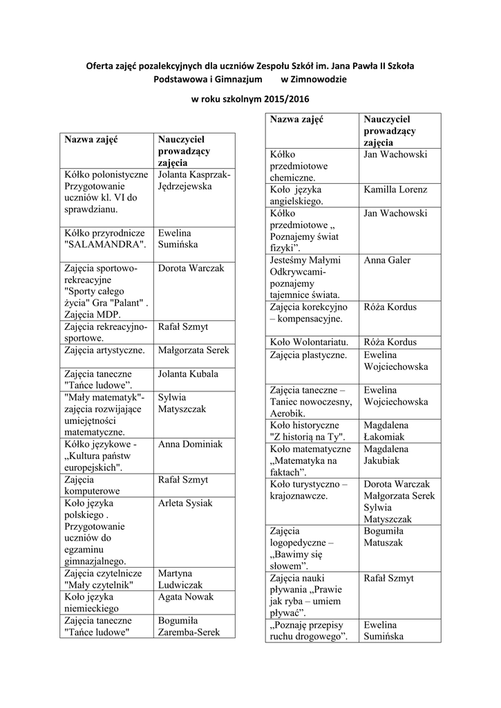 Oferta zajęć pozalekcyjnych dla uczniów Zespołu Szkół im. Jana Pawła II Szkoła Podstawowa i Gimnazjum w Zimnowodzie w roku szkolnym 2015/2016 Nazwa zajęć Nazwa zajęć Nauczyciel prowadzący zajęcia Kółko polonistyczne Jolanta KasprzakPrzygotowanie Jędrzejewska uczniów kl. VI do sprawdzianu. Kółko przyrodnicze "SALAMANDRA". Ewelina Sumińska Zajęcia sportowoDorota Warczak rekreacyjne "Sporty całego życia" Gra "Palant" . Zajęcia MDP. Zajęcia rekreacyjno- Rafał Szmyt sportowe. Zajęcia artystyczne. Małgorzata Serek Zajęcia taneczne "Tańce ludowe”. "Mały matematyk"zajęcia rozwijające umiejętności matematyczne. Kółko językowe „Kultura państw europejskich". Zajęcia komputerowe Koło języka polskiego . Przygotowanie uczniów do egzaminu gimnazjalnego. Zajęcia czytelnicze "Mały czytelnik" Koło języka niemieckiego Zajęcia taneczne "Tańce ludowe" Kółko przedmiotowe chemiczne. Koło języka angielskiego. Kółko przedmiotowe „ Poznajemy świat fizyki”. Jesteśmy Małymi Odkrywcamipoznajemy tajemnice świata. Zajęcia korekcyjno – kompensacyjne. Anna Dominiak Rafał Szmyt Arleta Sysiak Martyna Ludwiczak Agata Nowak Bogumiła Zaremba-Serek Kamilla Lorenz Jan Wachowski Anna Galer Róża Kordus Koło Wolontariatu. Zajęcia plastyczne. Róża Kordus Ewelina Wojciechowska Zajęcia taneczne – Taniec nowoczesny, Aerobik. Koło historyczne "Z historią na Ty". Koło matematyczne „Matematyka na faktach”. Koło turystyczno – krajoznawcze. Ewelina Wojciechowska Jolanta Kubala Sylwia Matyszczak Nauczyciel prowadzący zajęcia Jan Wachowski Zajęcia logopedyczne – „Bawimy się słowem”. Zajęcia nauki pływania „Prawie jak ryba – umiem pływać”. „Poznaję przepisy ruchu drogowego”. Magdalena Łakomiak Magdalena Jakubiak Dorota Warczak Małgorzata Serek Sylwia Matyszczak Bogumiła Matuszak Rafał Szmyt Ewelina Sumińska Moja pierwsza Komunia Święta . Zajęcia dydaktyczno – wyrównawcze z języka polskiego dla klas IV – VI. Zajęcia dydaktyczno – wyrównawcze z matematyki dla kl. IV- VI. Zajęcia dydaktyczno – wyrównawcze z matematyki dla uczniów gimnazjum. Zajęcia dydaktyczno – wyrównawcze z chemii i fizyki dla uczniów gimnazjum. Zajęcia dydaktyczno – wyrównawcze z języka niemieckiego. Zajęcia dydaktyczno – wyrównawcze dla kl. I – III. Małgorzata Serek Jolanta Kasprzak Jędrzejewska Magdalena Jakubiak Jan Wachowski Jan Wachowski Agata Nowak Zajęcia dydaktyczno – wyrównawcze dla kl. I – III. Zajęcia dydaktyczno – wyrównawcze dla kl. I – III. Zajęcia polonistyczne – „Potyczki językowe”. Zajęcia dydaktyczno – wyrównawcze z historii. Zajęcia dydaktyczno – wyrównawcze z języka polskiego dla uczniów gimnazjum Zajęcia dydaktyczno – wyrównawcze z języka angielskiego Martyna Ludwiczak Jolanta Kubala Sylwia Matyszczak Magdalena Łakomiak Arleta Sysiak Kamilla Lorenz Bogumiła Zaremba - Serek Uczniowie, którzy są zainteresowani udziałem w wyżej wymienionych zajęciach pozalekcyjnych zgłaszają się do nauczycieli prowadzących zajęcia.